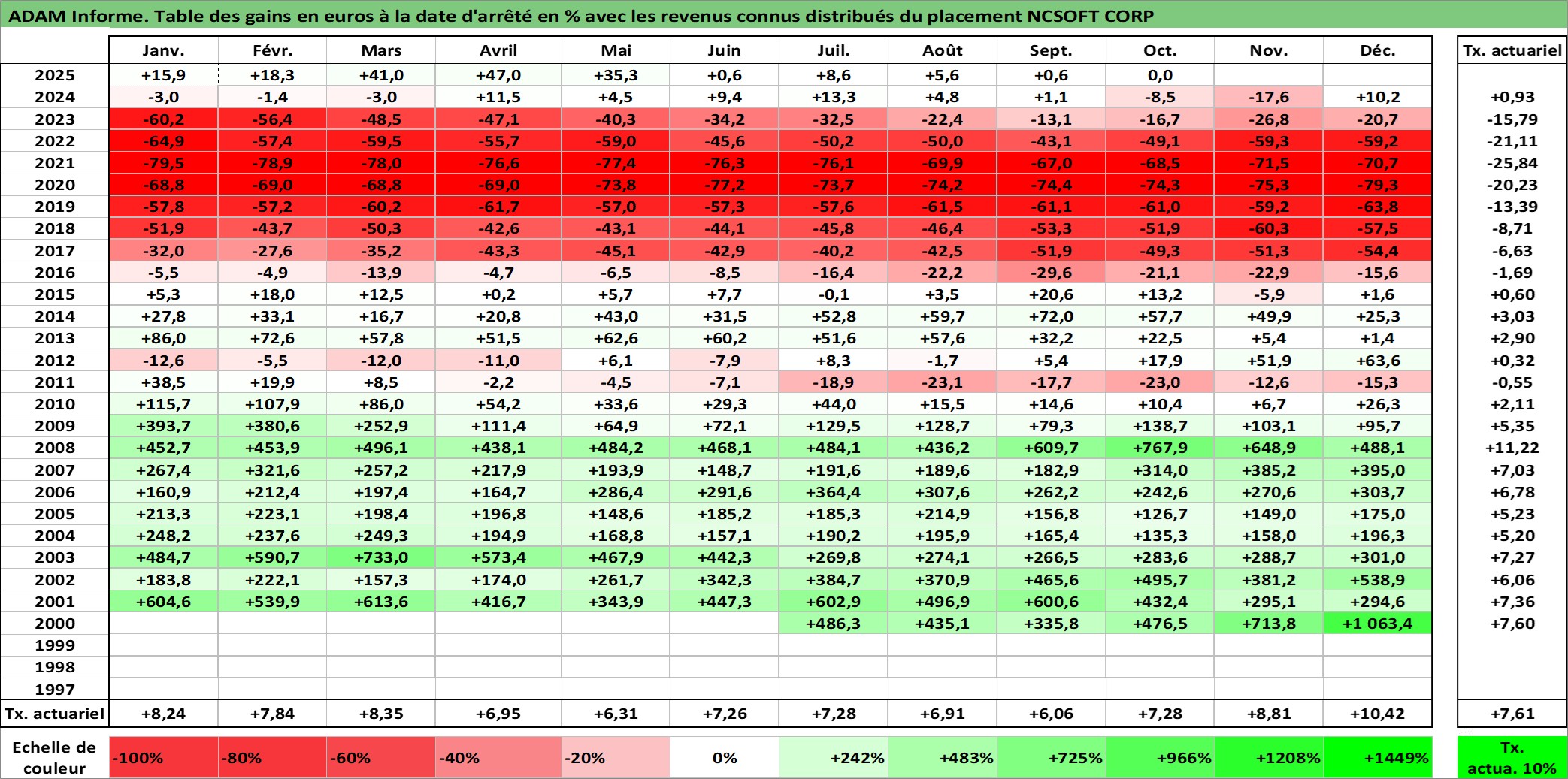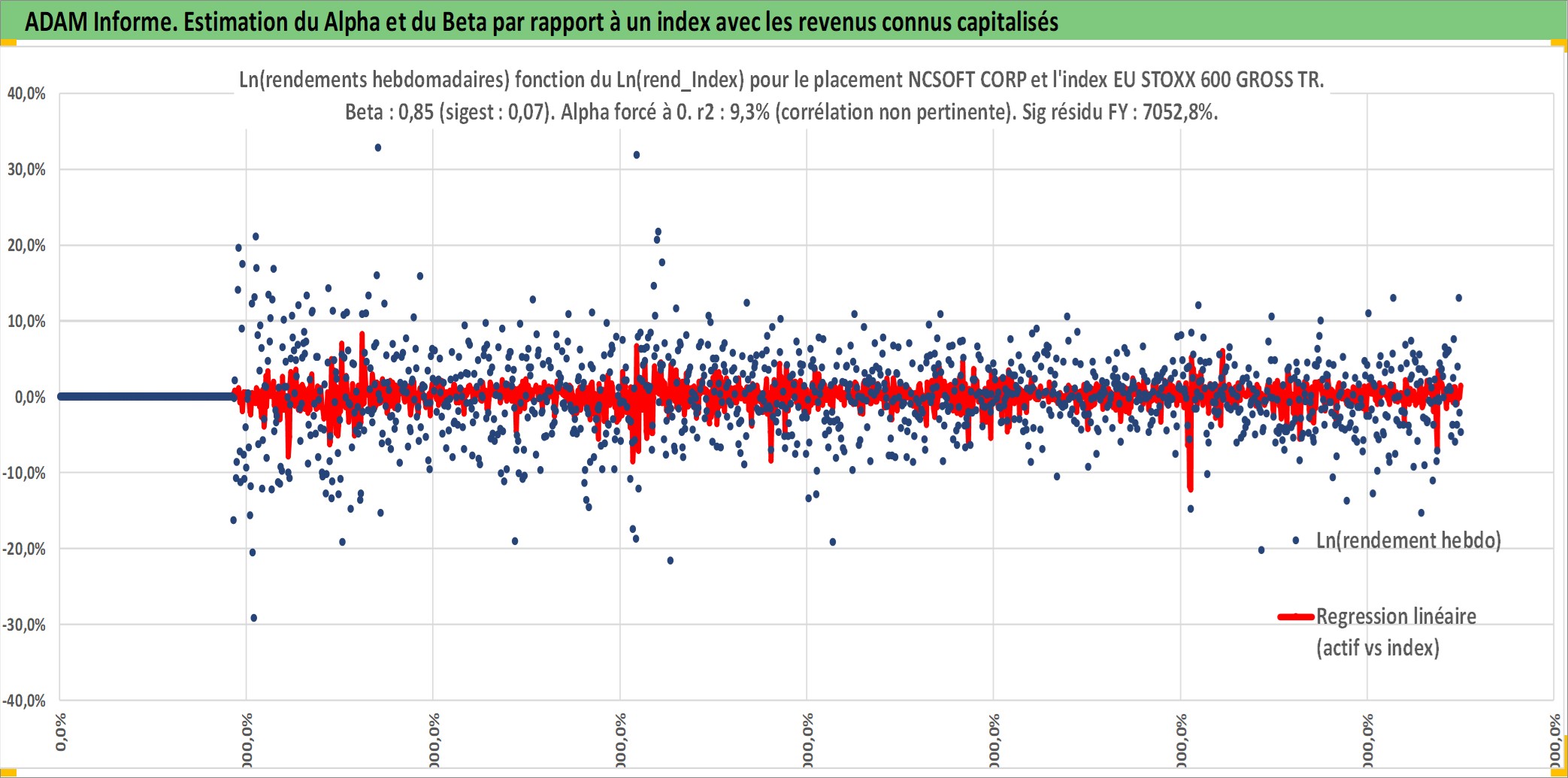 Site dédié aux investisseursPage dédiée sur site financeAnalyse des valorisations hebdomadaires de l'action NCSOFT CORP. Cet actif est cote en KRW. Les valorisations sont en contrevaleur EURO et couvrent les semaines 2000W29 a 2025W40. Les revenus de cet actif financier sont pris en compte depuis la semaine 2008W13. La note globale ESG de cet actif est estimee a 15.0 (apres rebasage entre 0 et 20).