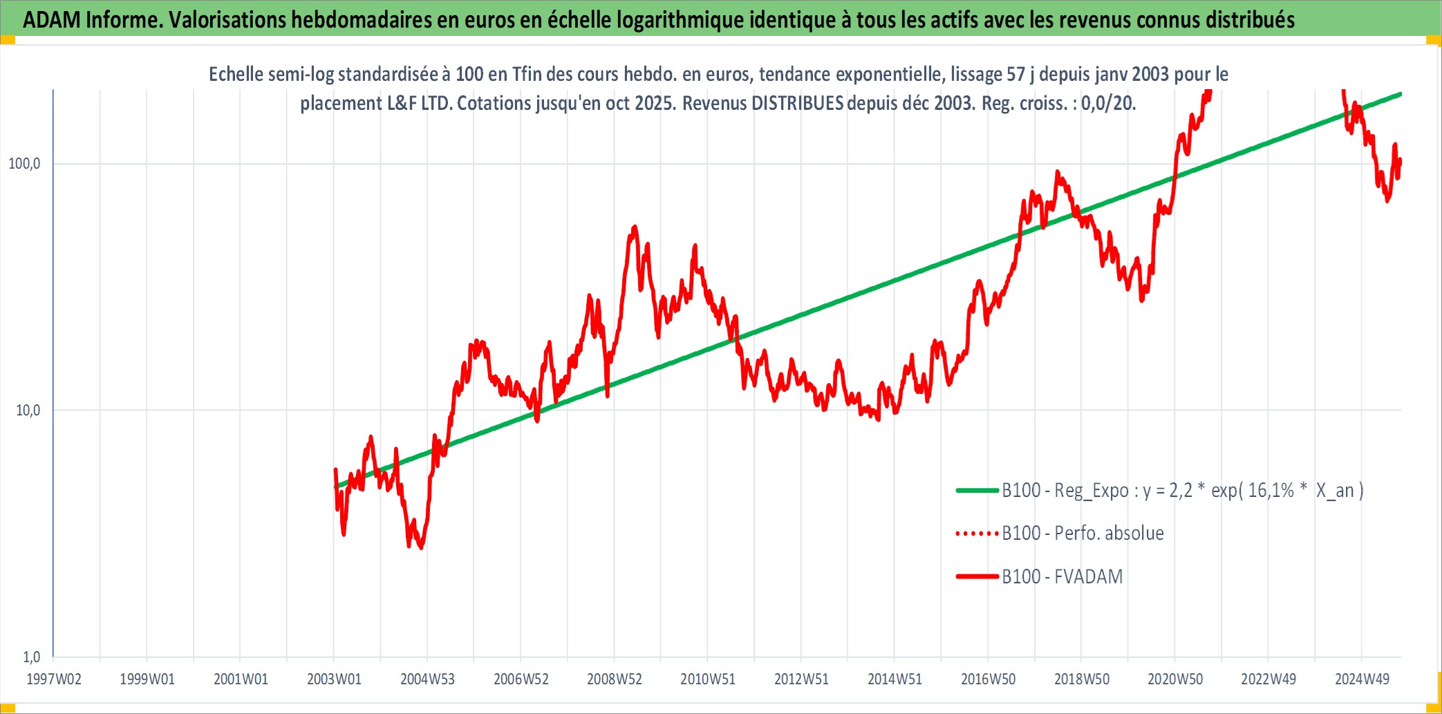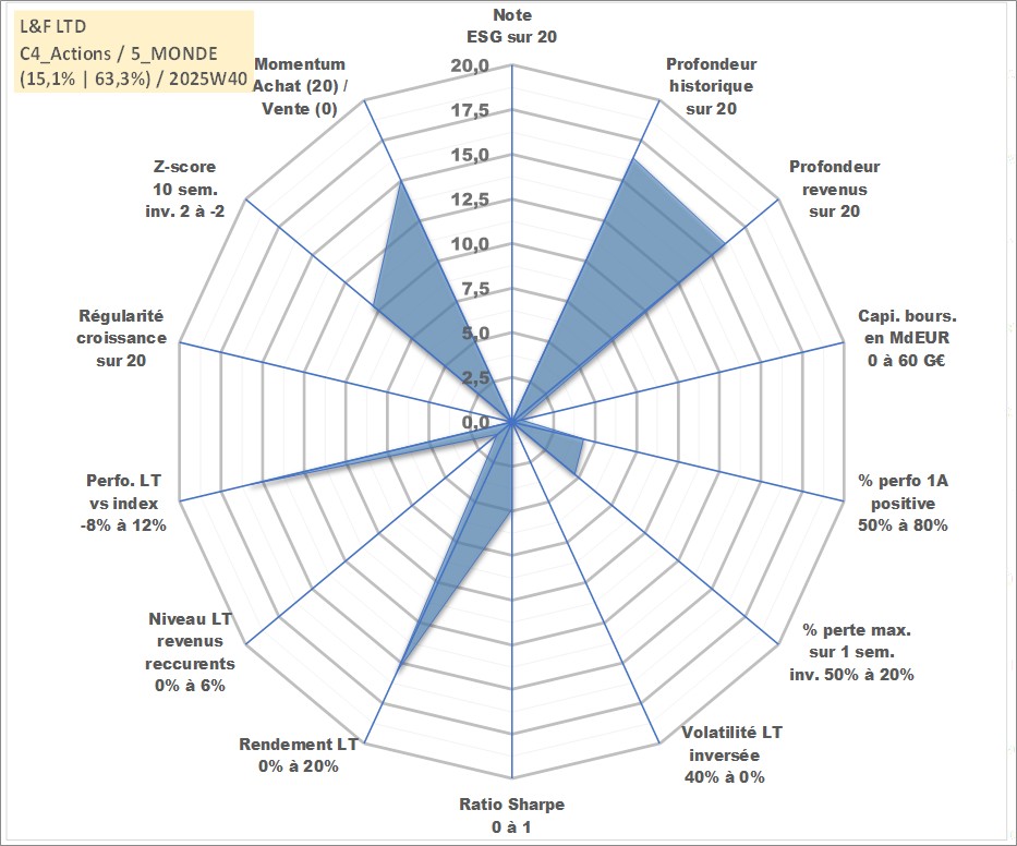 Site dédié aux investisseursPage dédiée sur site financeAnalyse des valorisations hebdomadaires de l'action L&F LTD. Cet actif est cote en KRW. Les valorisations sont en contrevaleur EURO et couvrent les semaines 2003W03 a 2025W40. Les revenus de cet actif financier sont pris en compte depuis la semaine 2004W01. La note ESG de cet actif n'est pas connue.