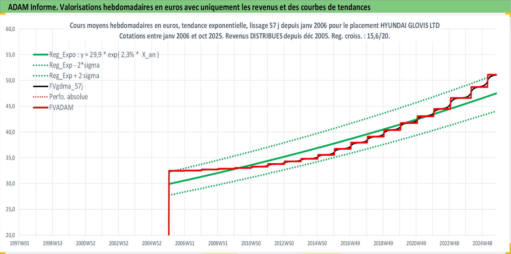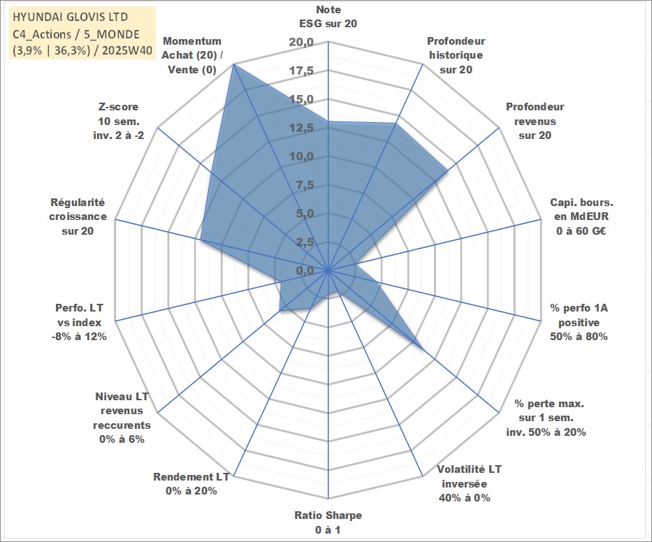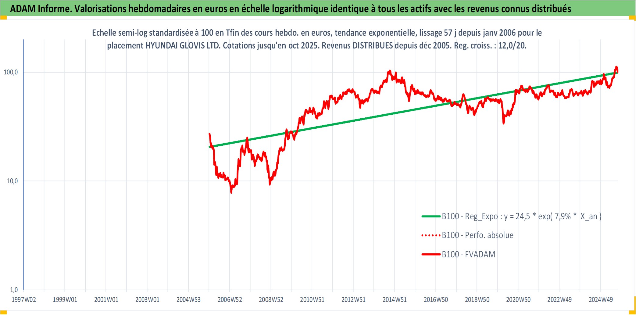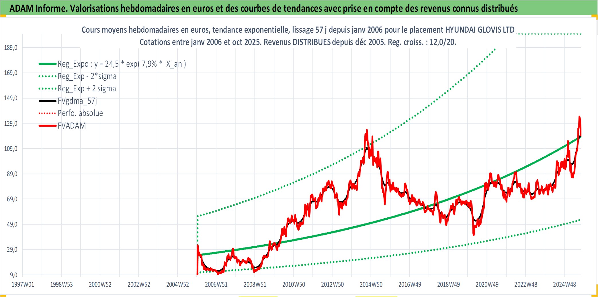Site dédié aux investisseursPage dédiée sur site financeAnalyse des valorisations hebdomadaires de l'action HYUNDAI GLOVIS LTD. Cet actif est cote en KRW. Les valorisations sont en contrevaleur EURO et couvrent les semaines 2006W01 a 2025W40. Les revenus de cet actif financier sont pris en compte depuis la semaine 2005W52. La note globale ESG de cet actif est estimee a 13.0 (apres rebasage entre 0 et 20).