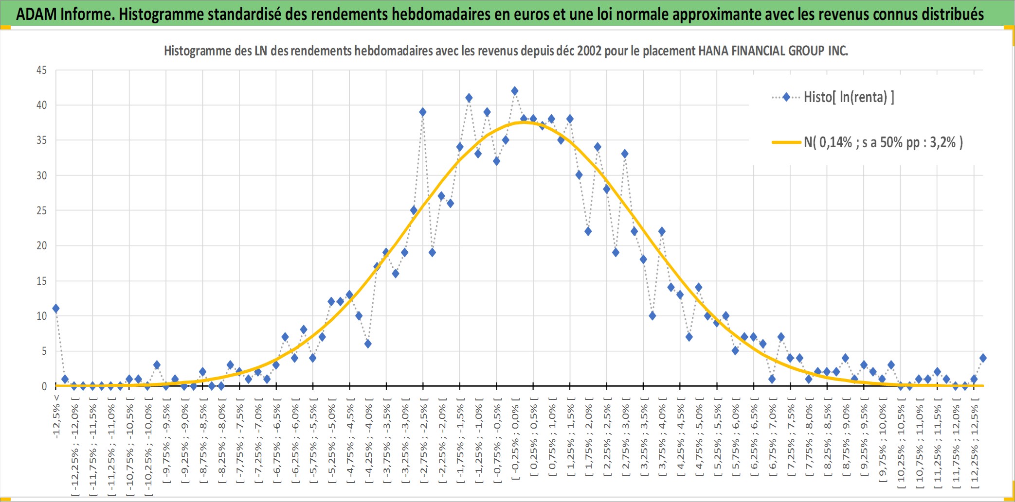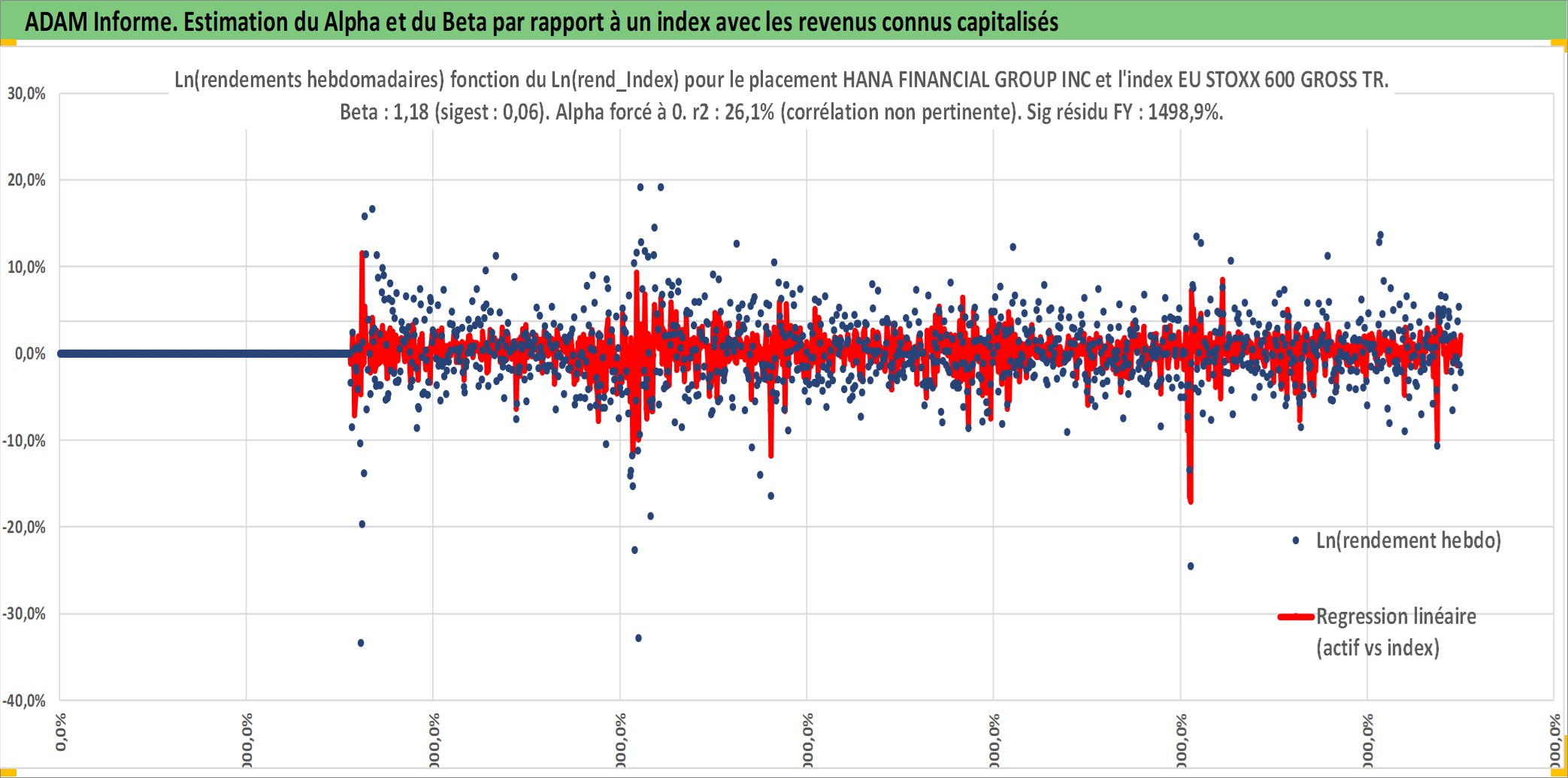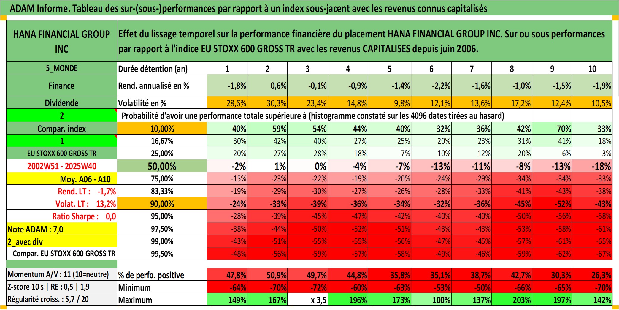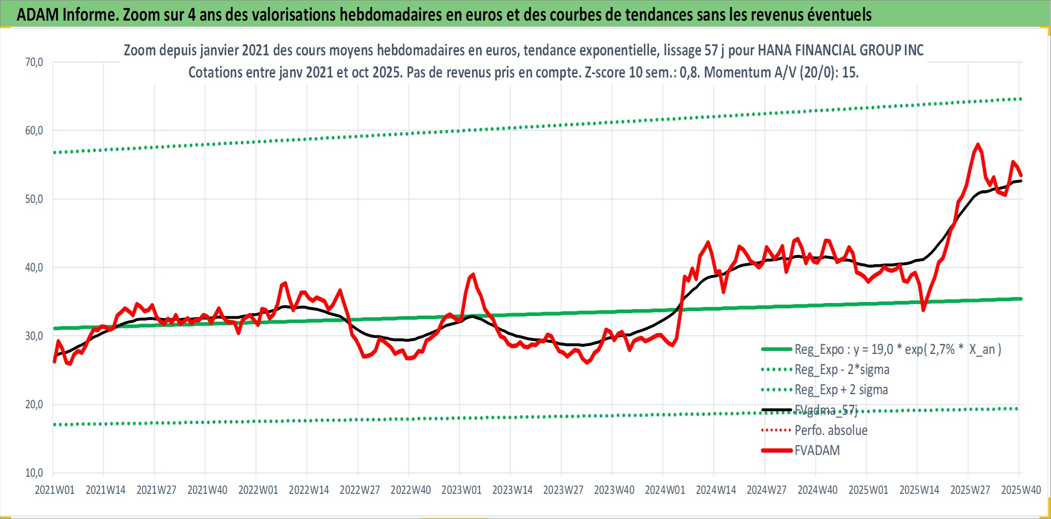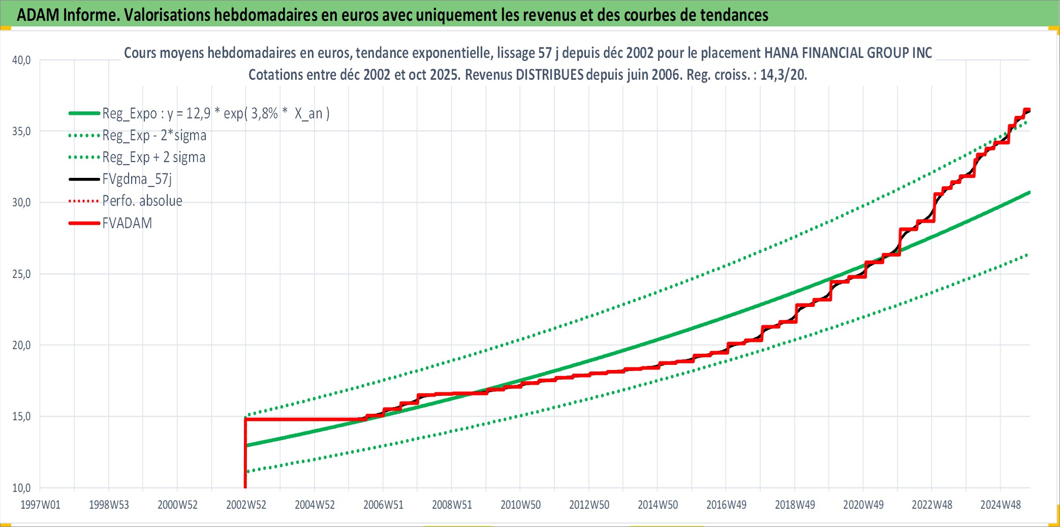 Site dédié aux investisseursPage dédiée sur site financeAnalyse des valorisations hebdomadaires de l'action HANA FINANCIAL GROUP INC. Cet actif est cote en KRW. Les valorisations sont en contrevaleur EURO et couvrent les semaines 2002W51 a 2025W40. Les revenus de cet actif financier sont pris en compte depuis la semaine 2006W26. La note globale ESG de cet actif est estimee a 7.0 (apres rebasage entre 0 et 20).