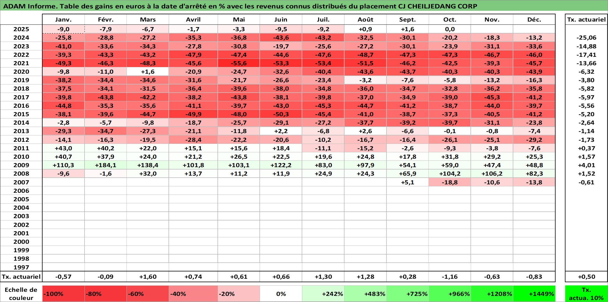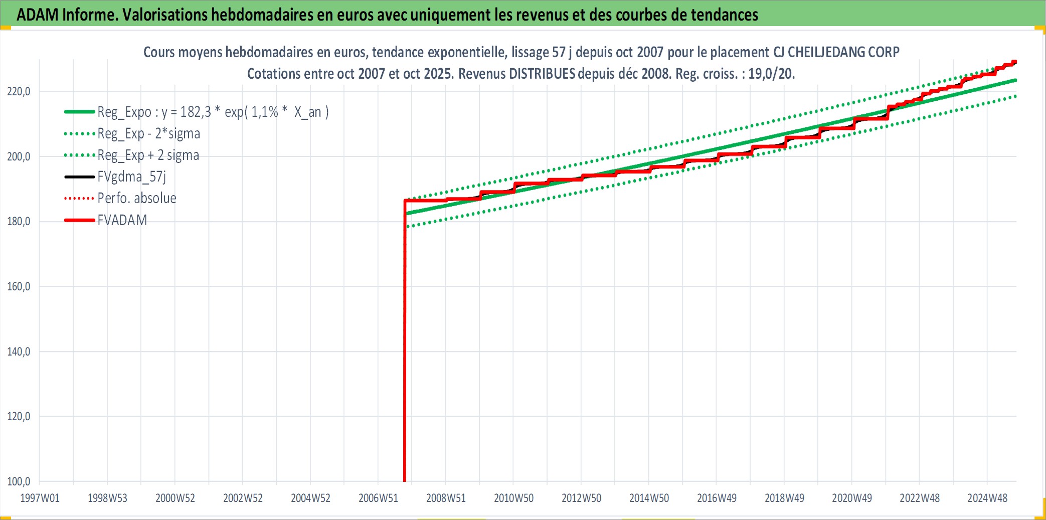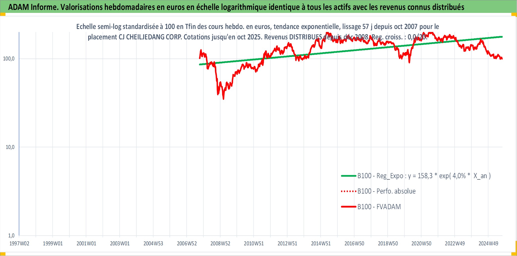 Site dédié aux investisseursPage dédiée sur site financeAnalyse des valorisations hebdomadaires de l'action CJ CHEILJEDANG CORP. Cet actif est cote en KRW. Les valorisations sont en contrevaleur EURO et couvrent les semaines 2007W40 a 2025W40. Les revenus de cet actif financier sont pris en compte depuis la semaine 2009W01. La note ESG de cet actif n'est pas connue.