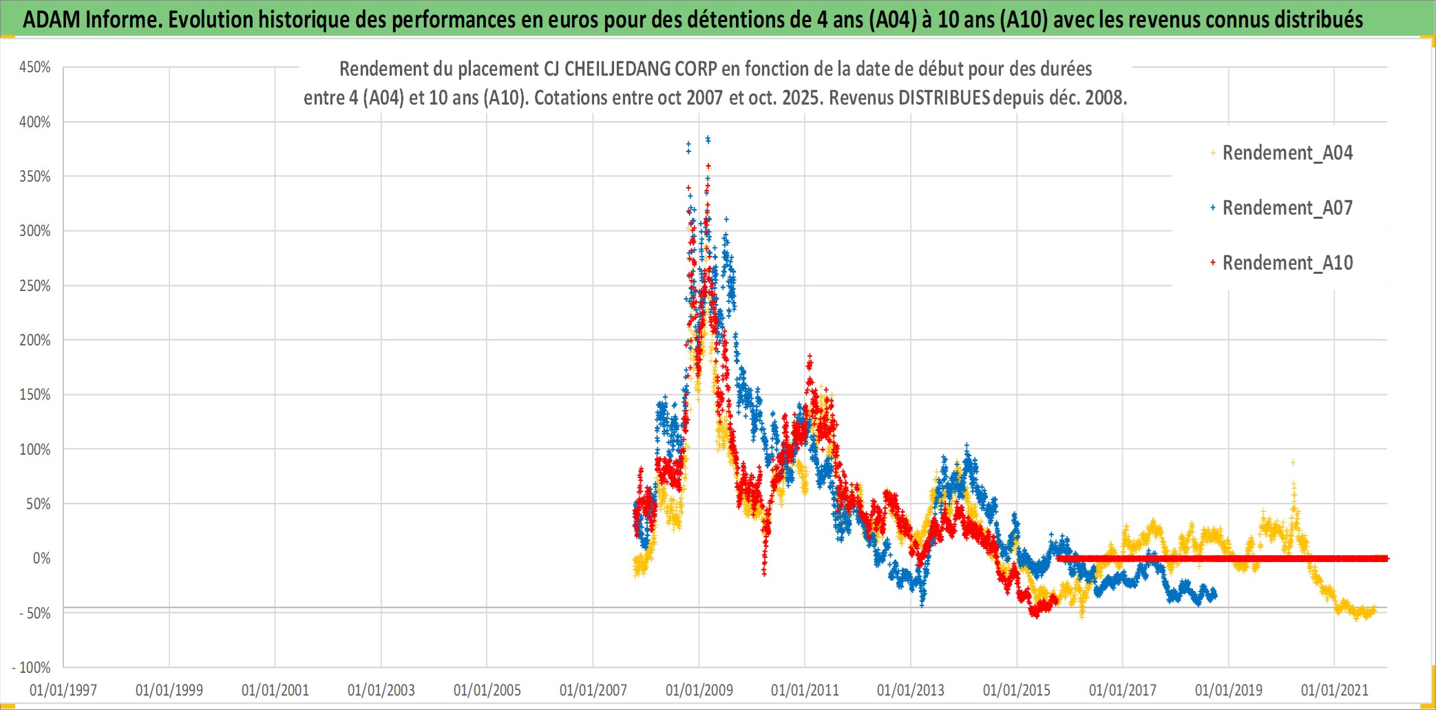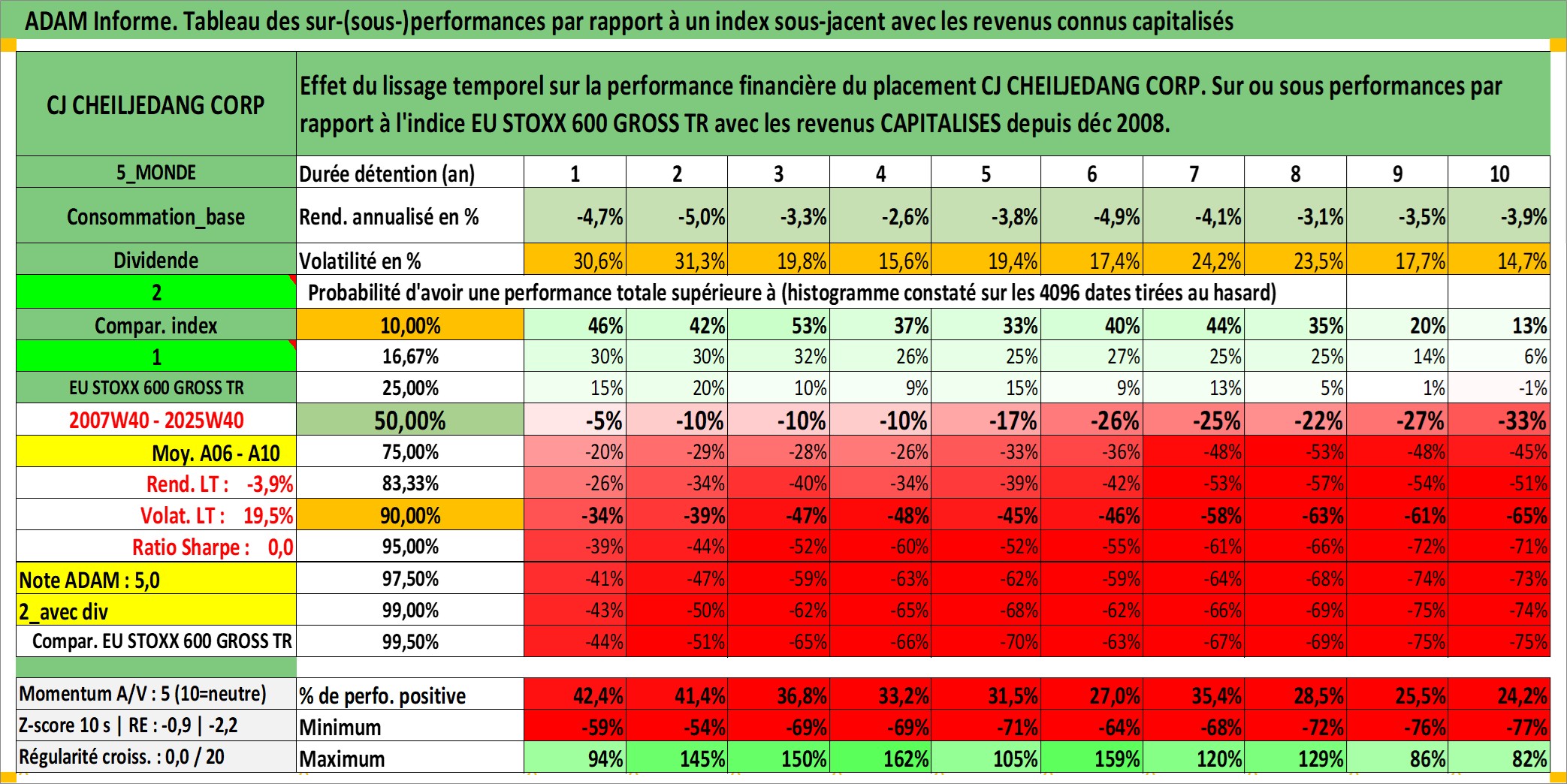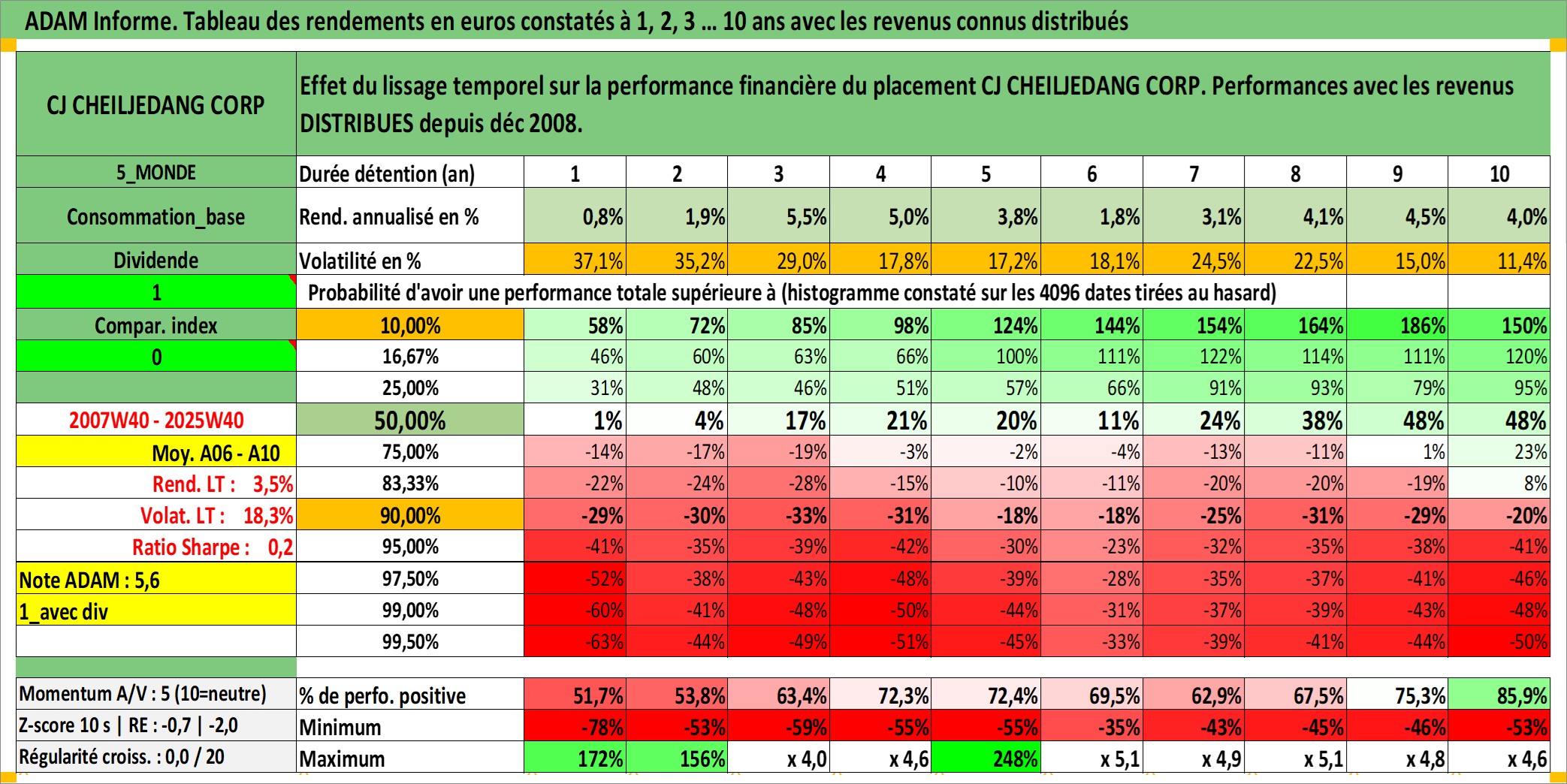 Site dédié aux investisseursPage dédiée sur site financeAnalyse des valorisations hebdomadaires de l'action CJ CHEILJEDANG CORP. Cet actif est cote en KRW. Les valorisations sont en contrevaleur EURO et couvrent les semaines 2007W40 a 2025W40. Les revenus de cet actif financier sont pris en compte depuis la semaine 2009W01. La note ESG de cet actif n'est pas connue.