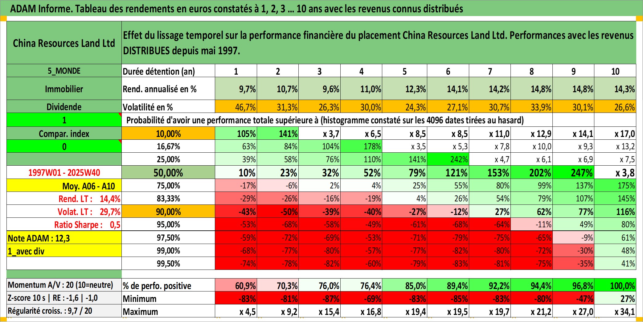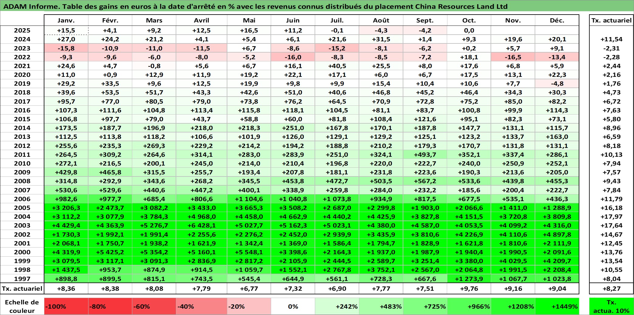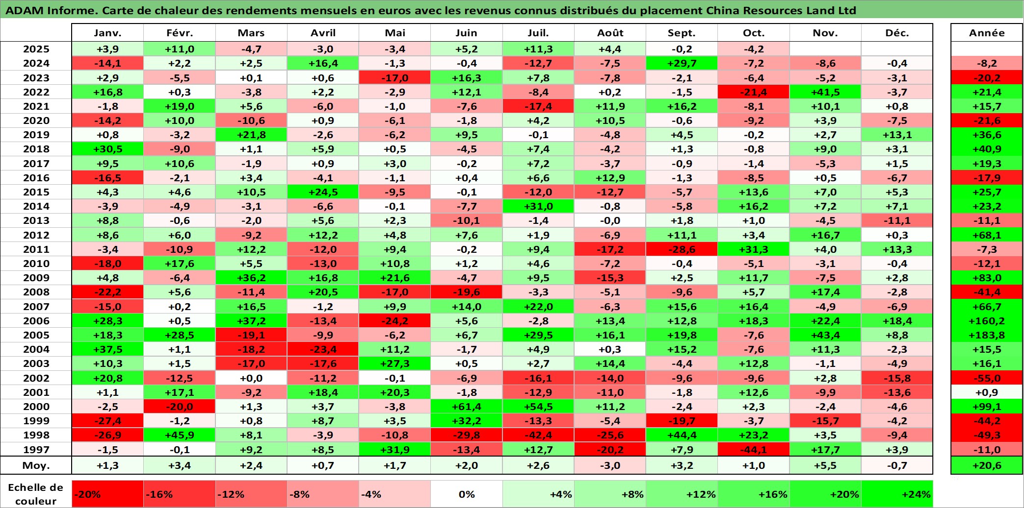 Site dédié aux investisseursPage dédiée sur site financeAnalyse des valorisations hebdomadaires de l'action China Resources Land Ltd. Cet actif est cote en HKD. Les valorisations sont en contrevaleur EURO et couvrent les semaines 1997W01 a 2025W40. Les revenus de cet actif financier sont pris en compte depuis la semaine 1997W21. La note globale ESG de cet actif est estimee a 10.0 (apres rebasage entre 0 et 20).