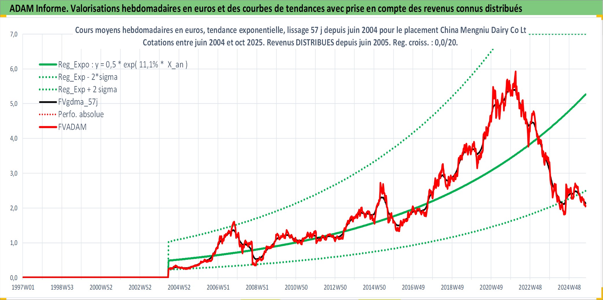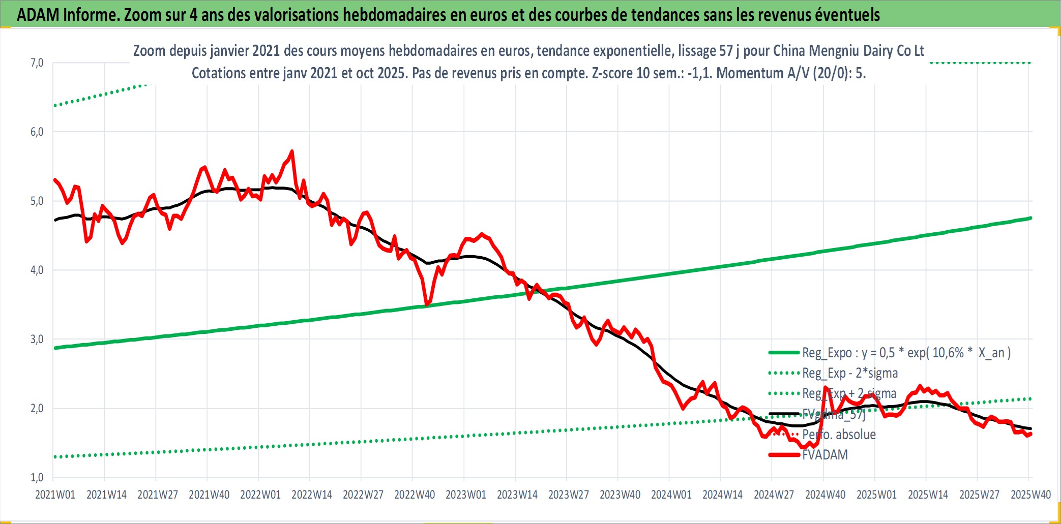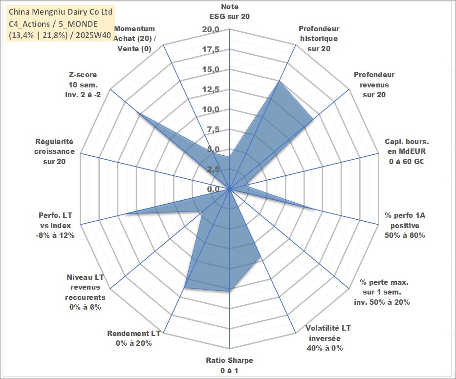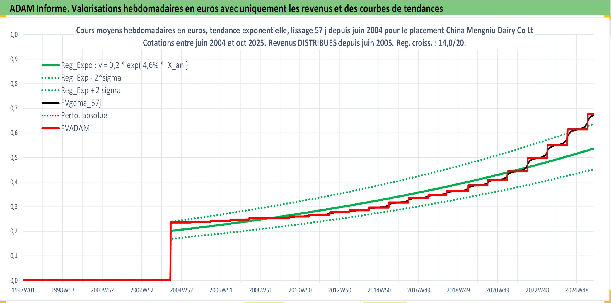 Site dédié aux investisseursPage dédiée sur site financeAnalyse des valorisations hebdomadaires de l'action China Mengniu Dairy Co Ltd. Cet actif est cote en HKD. Les valorisations sont en contrevaleur EURO et couvrent les semaines 2004W24 a 2025W40. Les revenus de cet actif financier sont pris en compte depuis la semaine 2005W25. La note globale ESG de cet actif est estimee a 4.0 (apres rebasage entre 0 et 20).