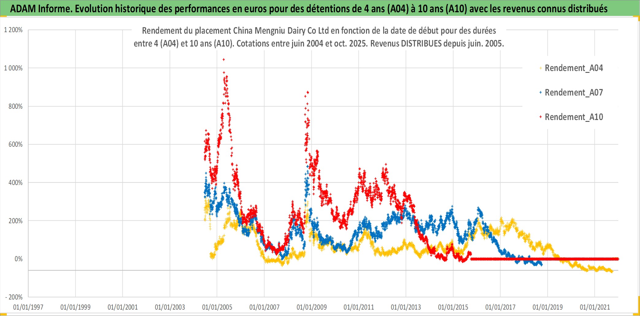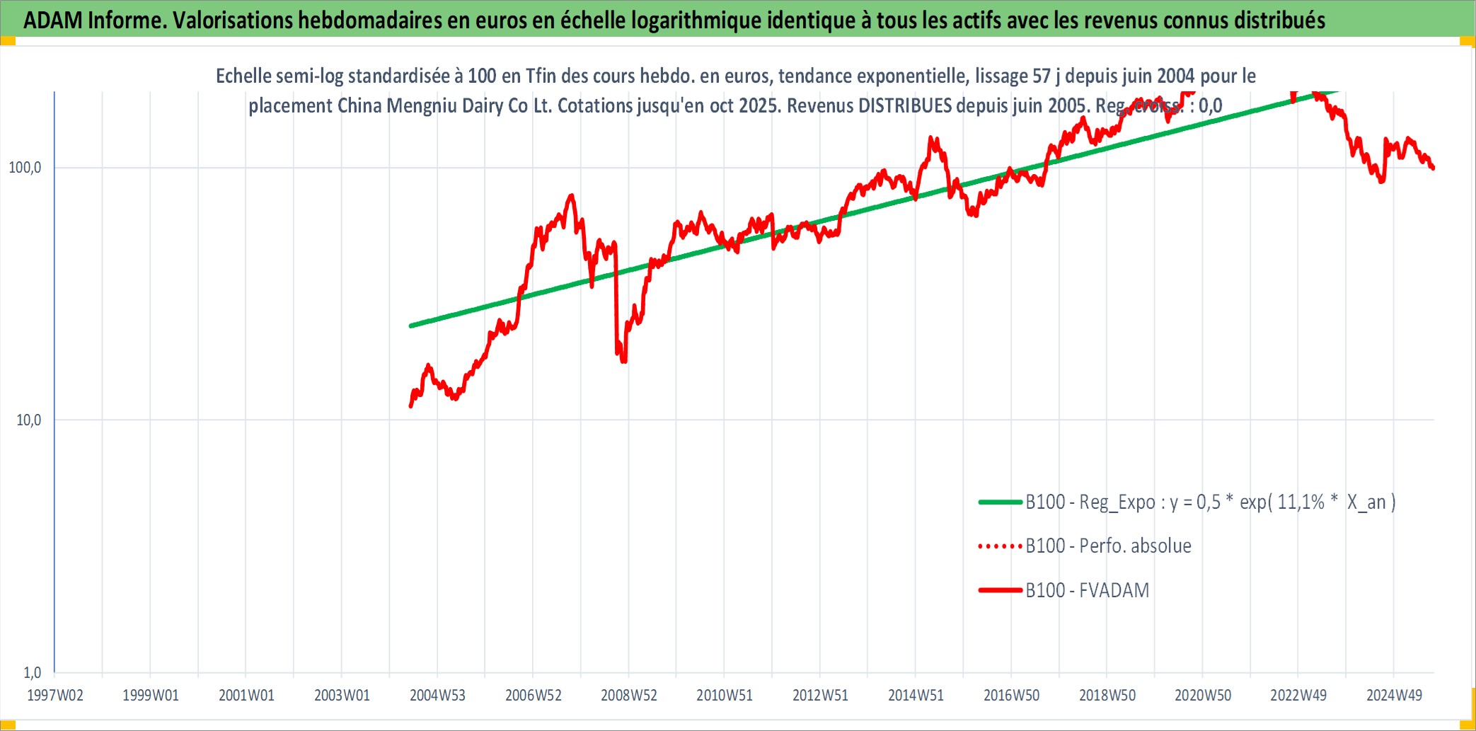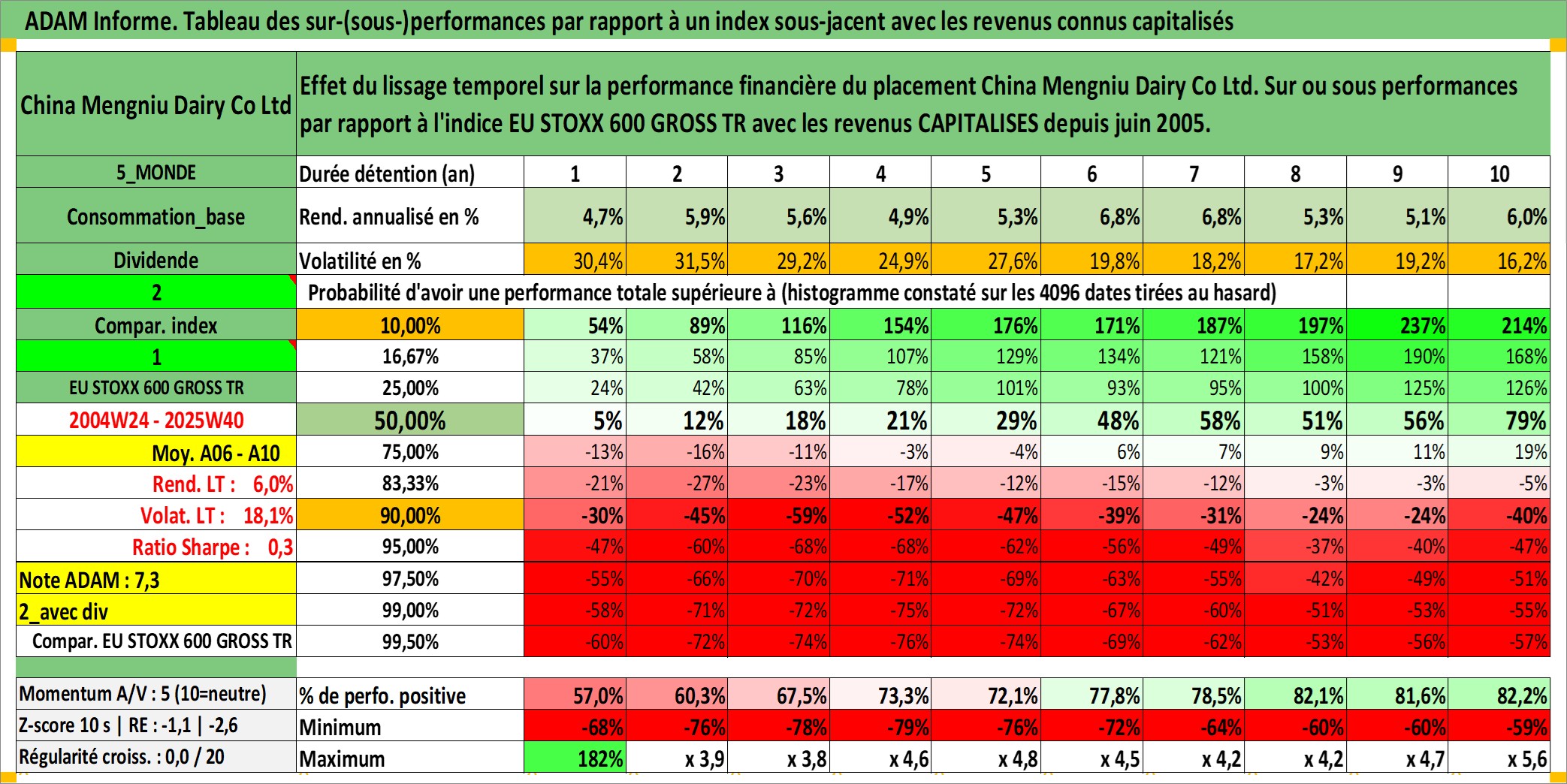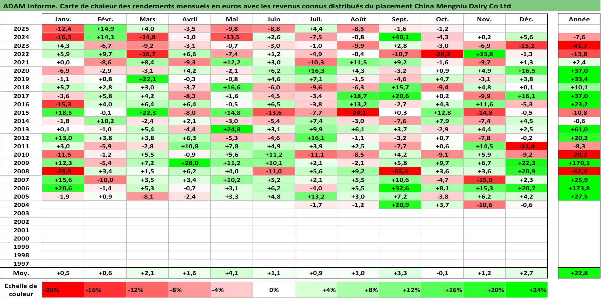 Site dédié aux investisseursPage dédiée sur site financeAnalyse des valorisations hebdomadaires de l'action China Mengniu Dairy Co Ltd. Cet actif est cote en HKD. Les valorisations sont en contrevaleur EURO et couvrent les semaines 2004W24 a 2025W40. Les revenus de cet actif financier sont pris en compte depuis la semaine 2005W25. La note globale ESG de cet actif est estimee a 4.0 (apres rebasage entre 0 et 20).