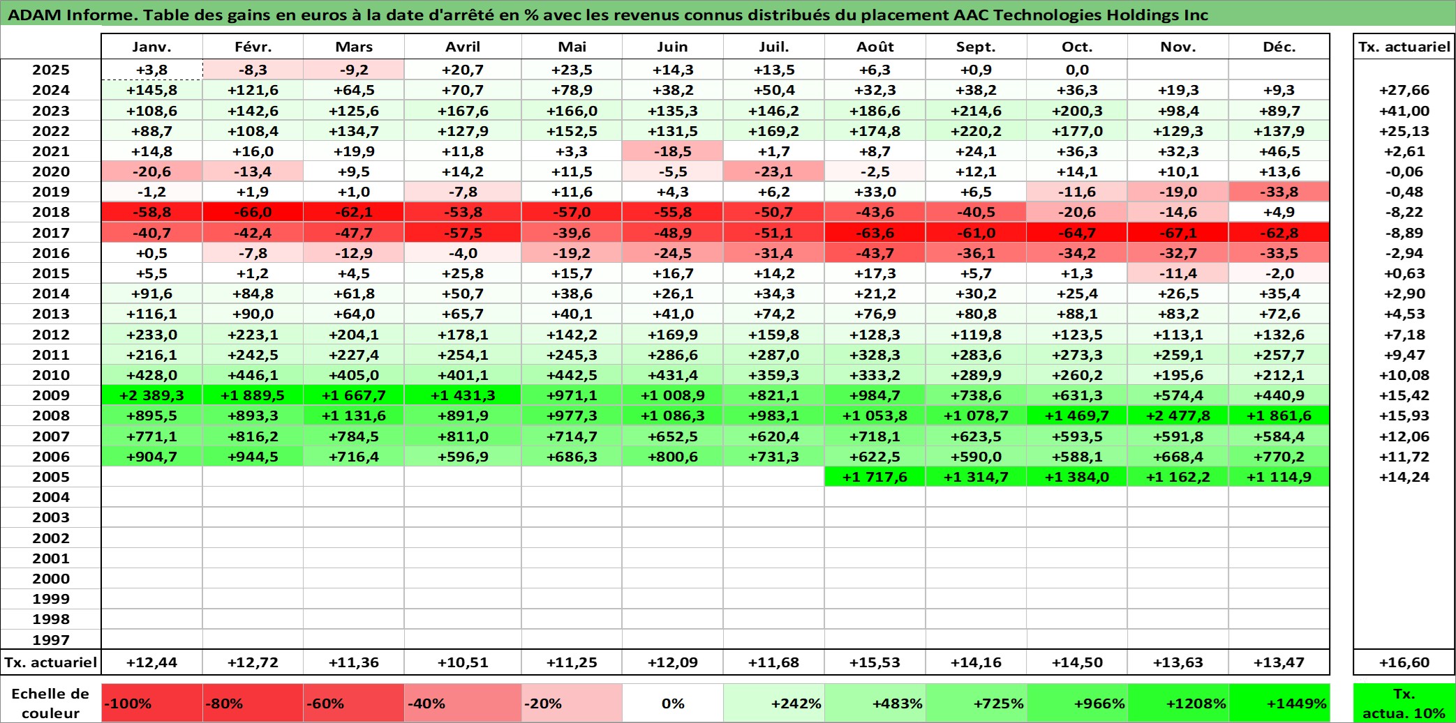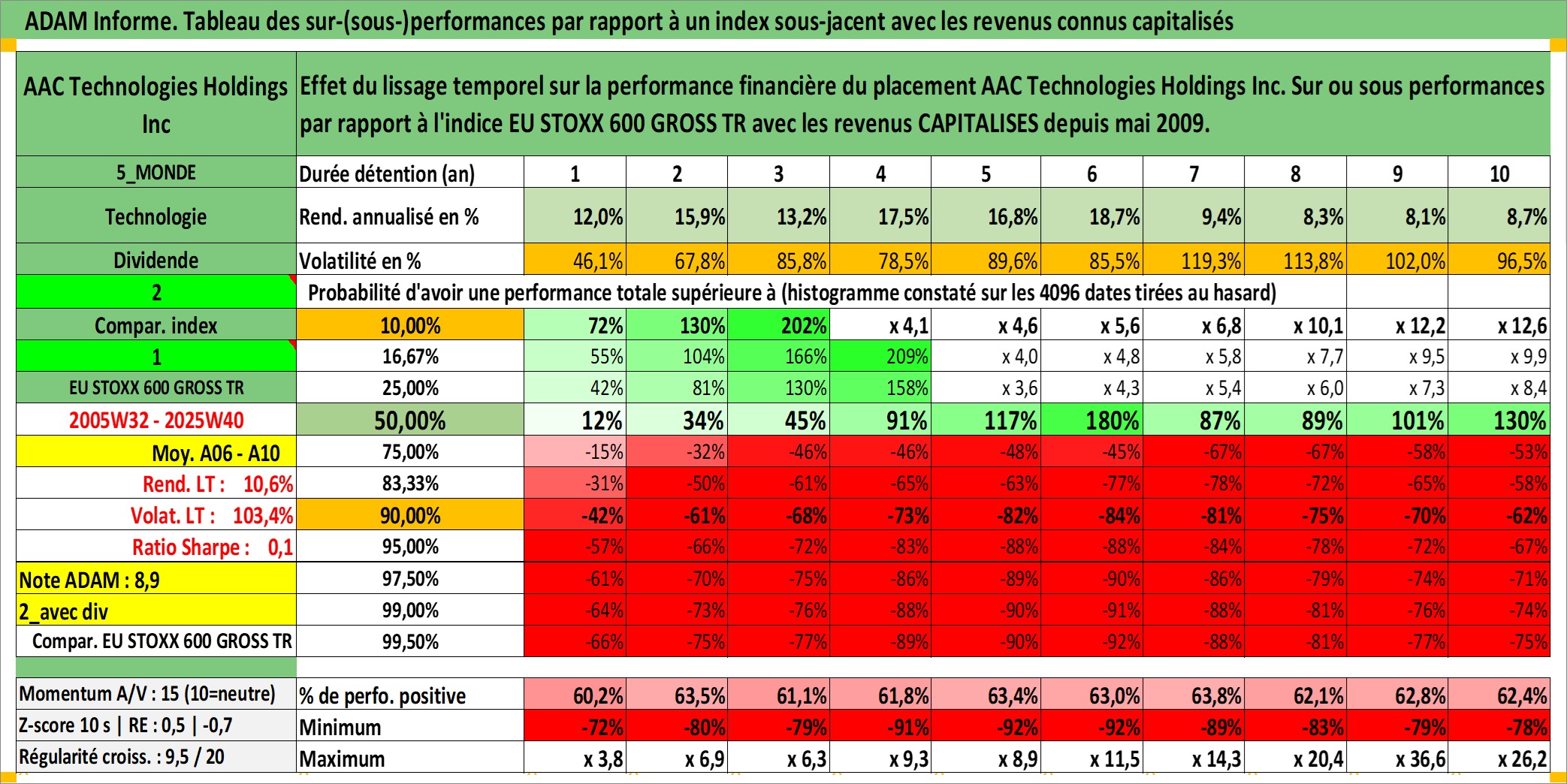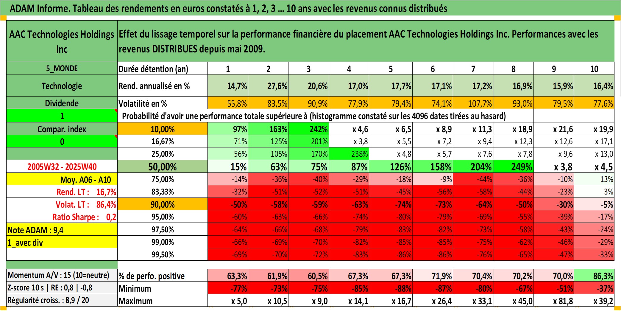 Site dédié aux investisseursPage dédiée sur site financeAnalyse des valorisations hebdomadaires de l'action AAC Technologies Holdings Inc. Cet actif est cote en HKD. Les valorisations sont en contrevaleur EURO et couvrent les semaines 2005W32 a 2025W40. Les revenus de cet actif financier sont pris en compte depuis la semaine 2009W20. La note globale ESG de cet actif est estimee a 12.0 (apres rebasage entre 0 et 20).