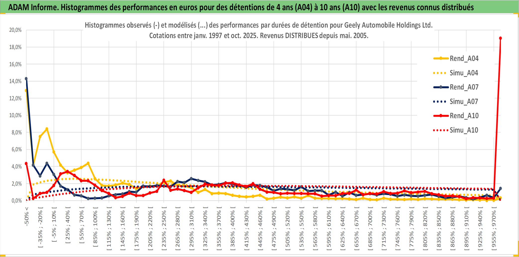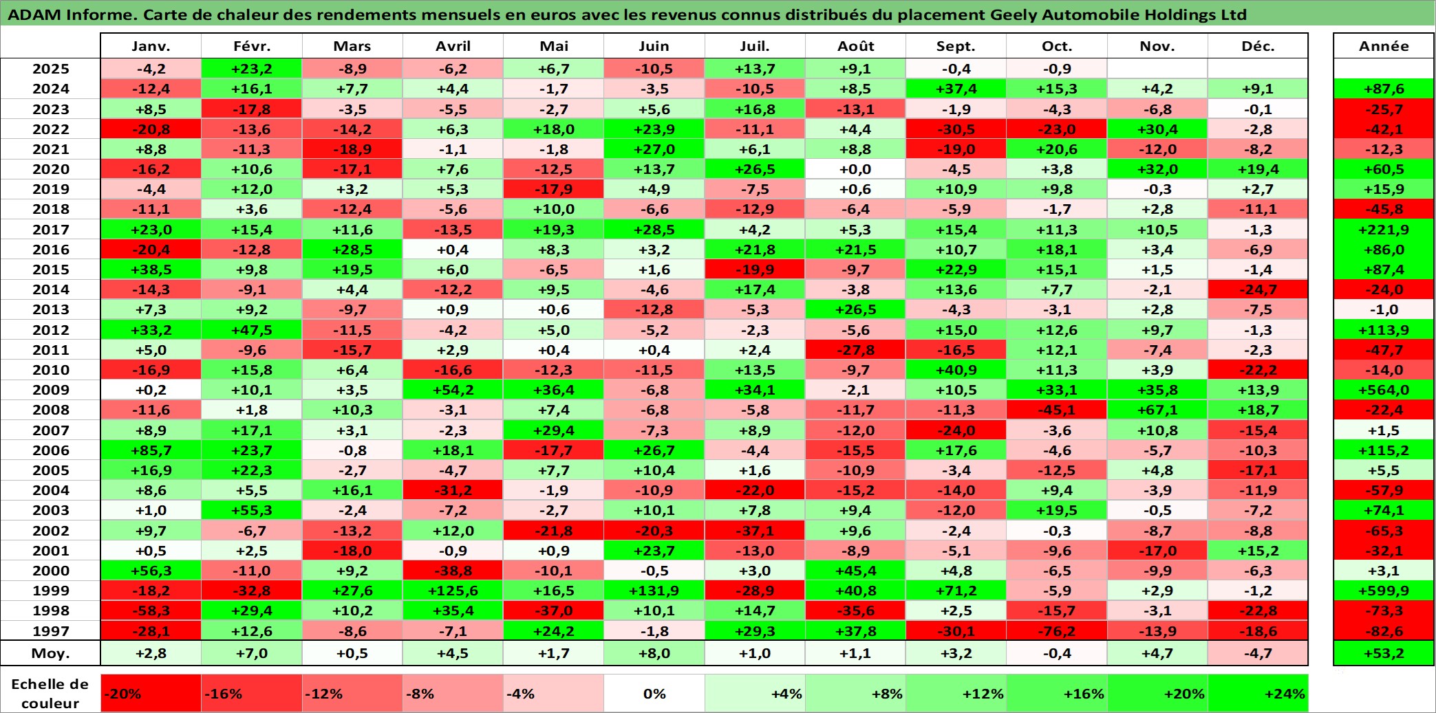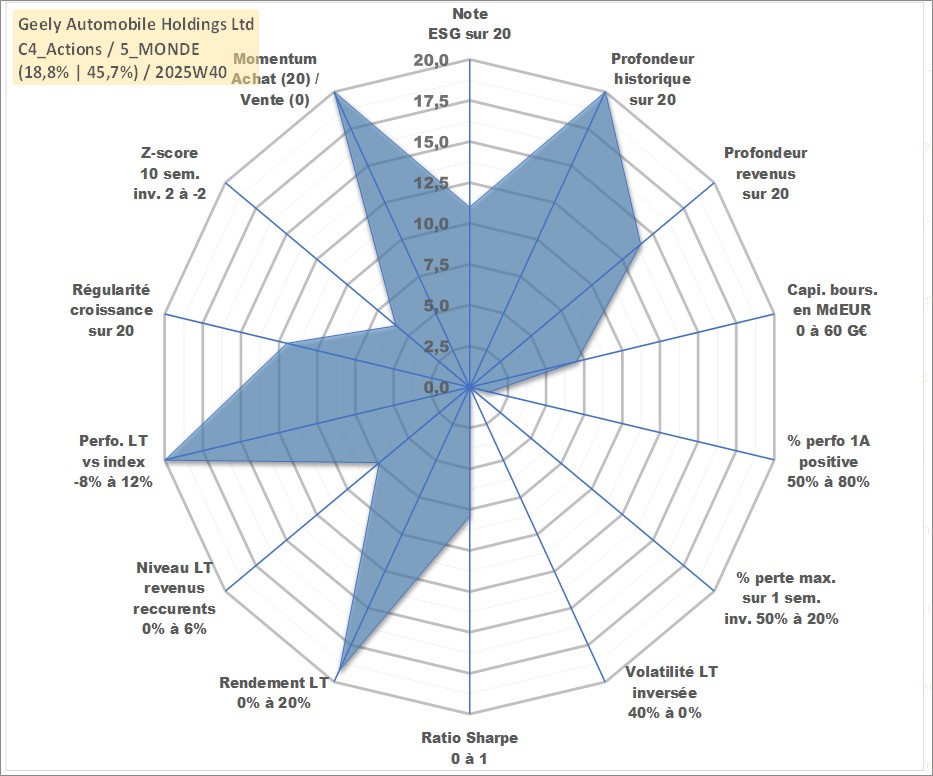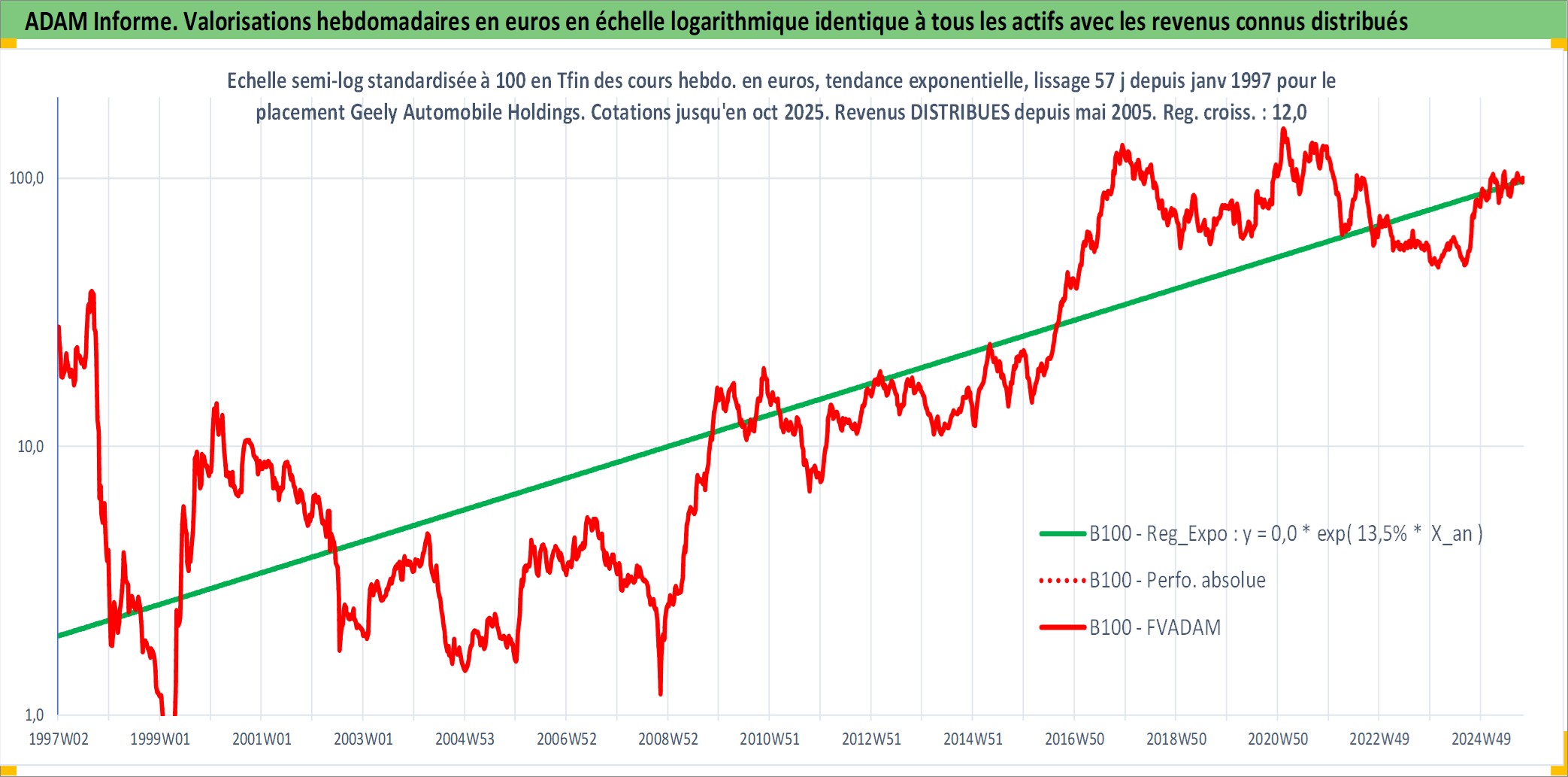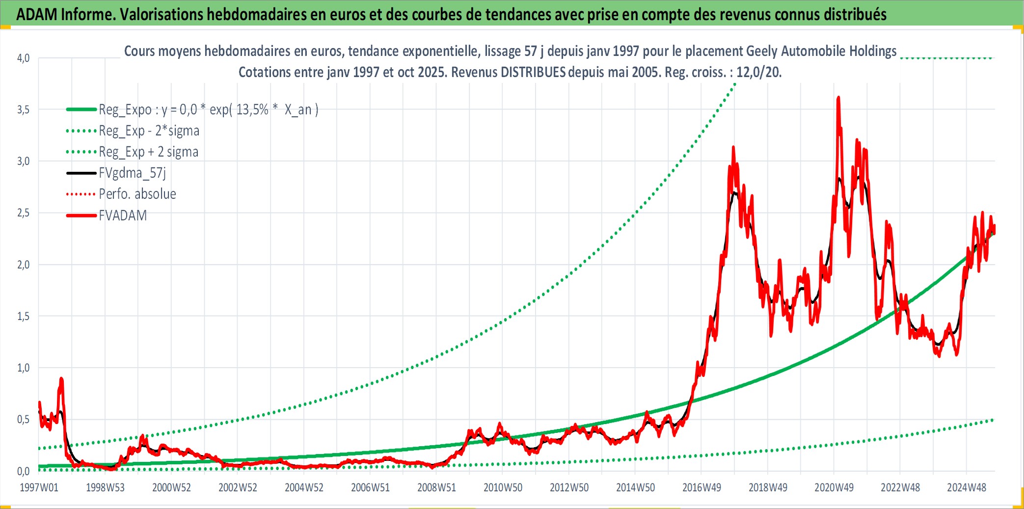 Site dédié aux investisseursPage dédiée sur site financeAnalyse des valorisations hebdomadaires de l'action Geely Automobile Holdings Ltd. Cet actif est cote en HKD. Les valorisations sont en contrevaleur EURO et couvrent les semaines 1997W01 a 2025W40. Les revenus de cet actif financier sont pris en compte depuis la semaine 2005W20. La note globale ESG de cet actif est estimee a 11.0 (apres rebasage entre 0 et 20).