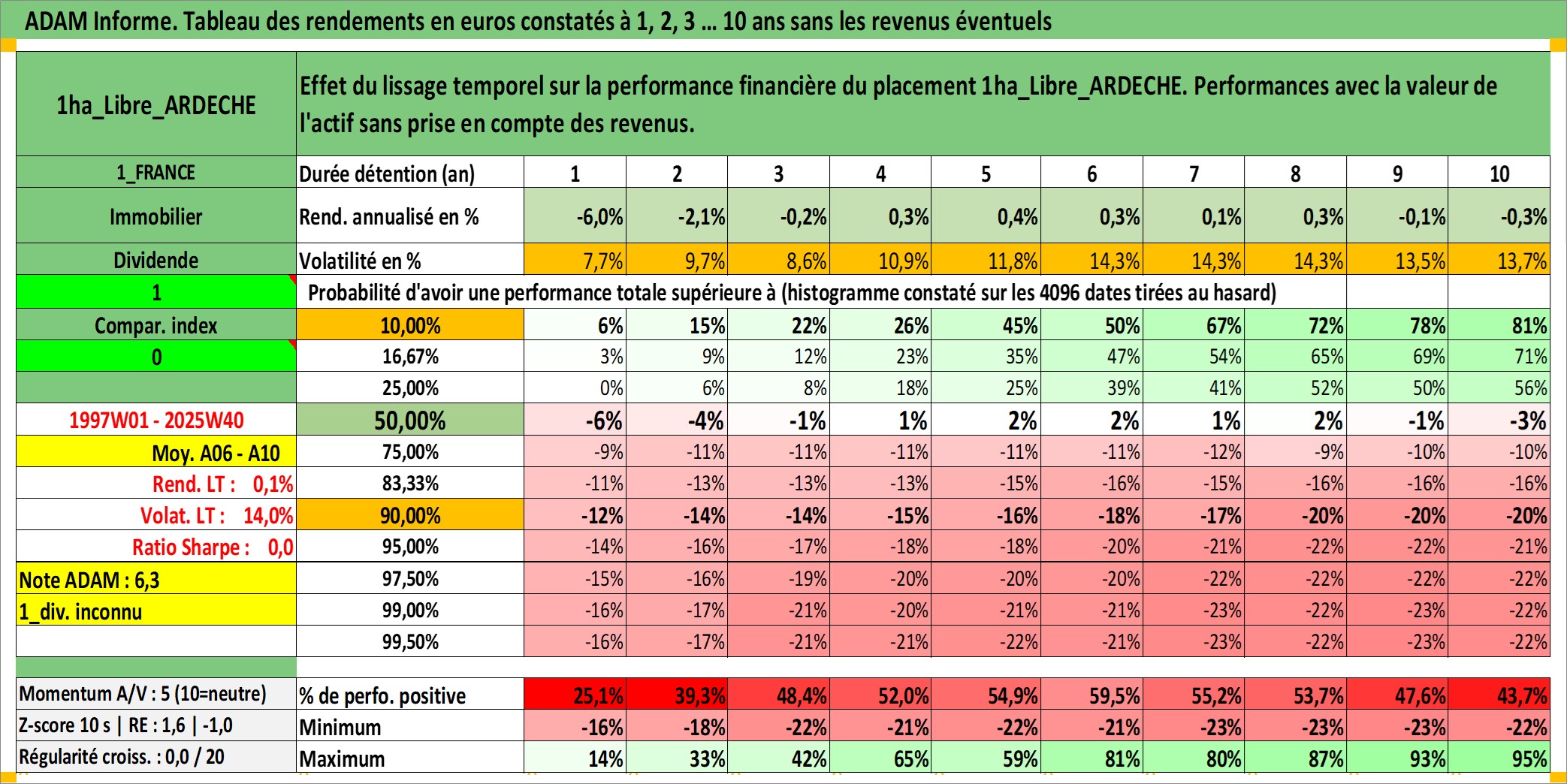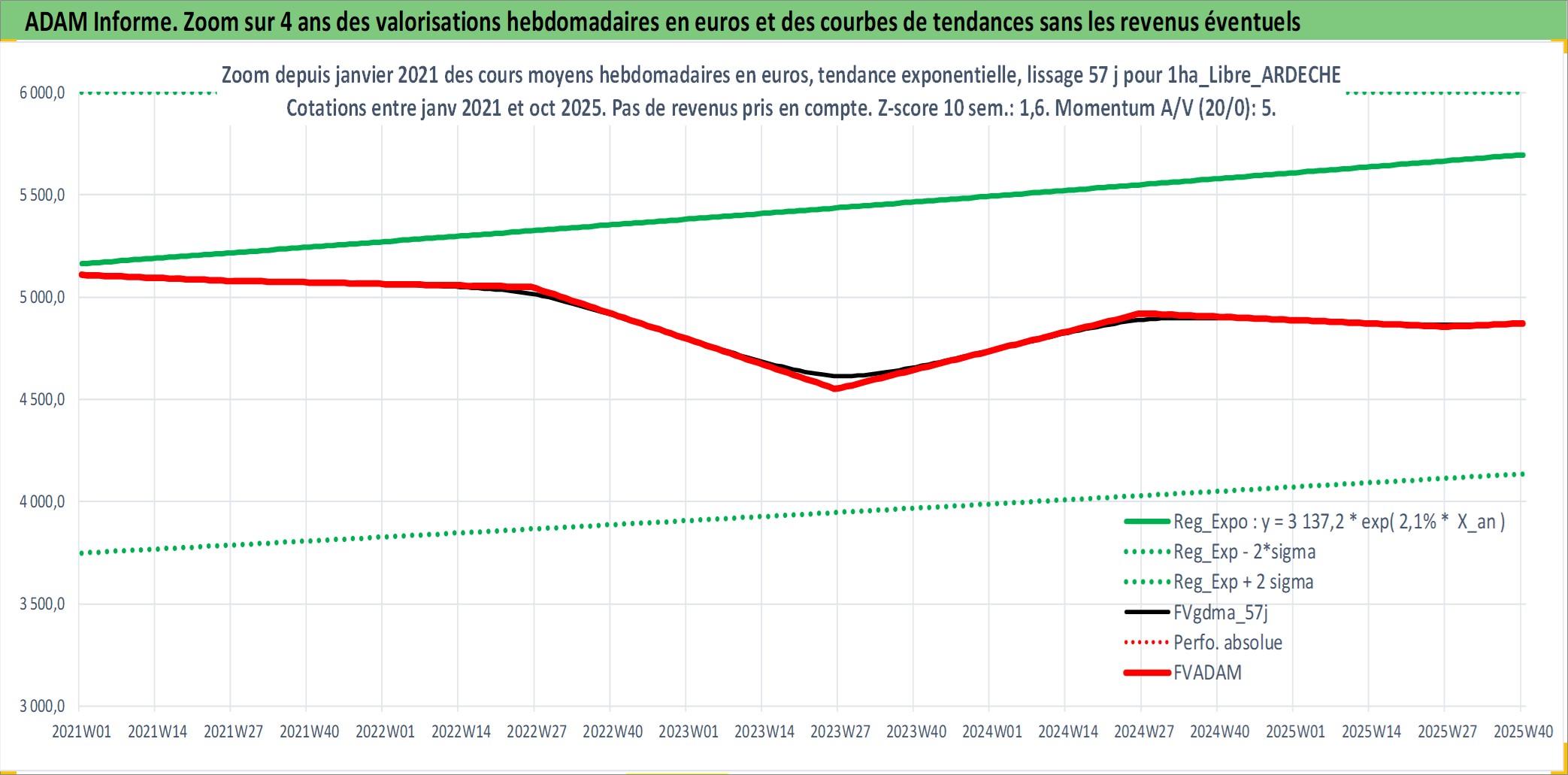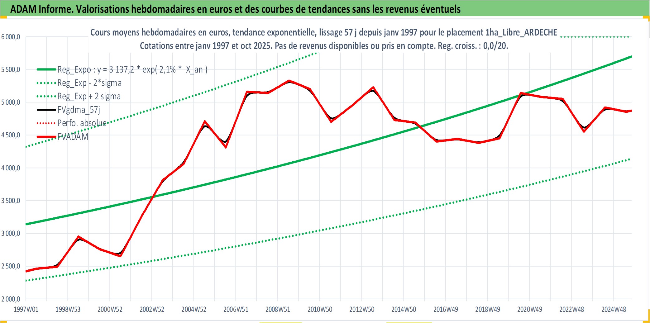 Site dédié aux investisseursPage dédiée sur site financeAnalyse des valorisations hebdomadaires de l'actif 1ha_Libre_ARDECHE. Cet actif est cote en EUR. Les valorisations couvrent les semaines 1997W01 a 2025W40. Les fermages de ce bien foncier sont pris egaux a 2,5% annuels de la valeur venale du bien.