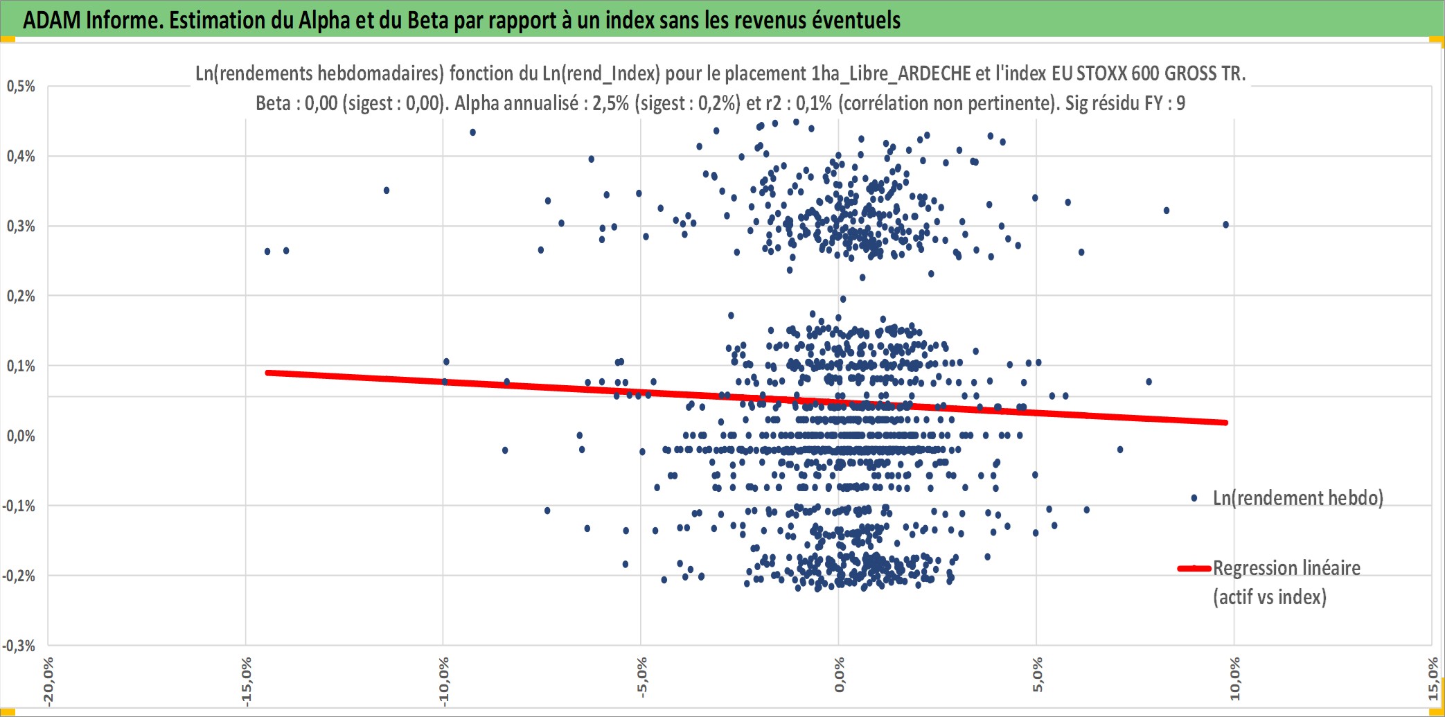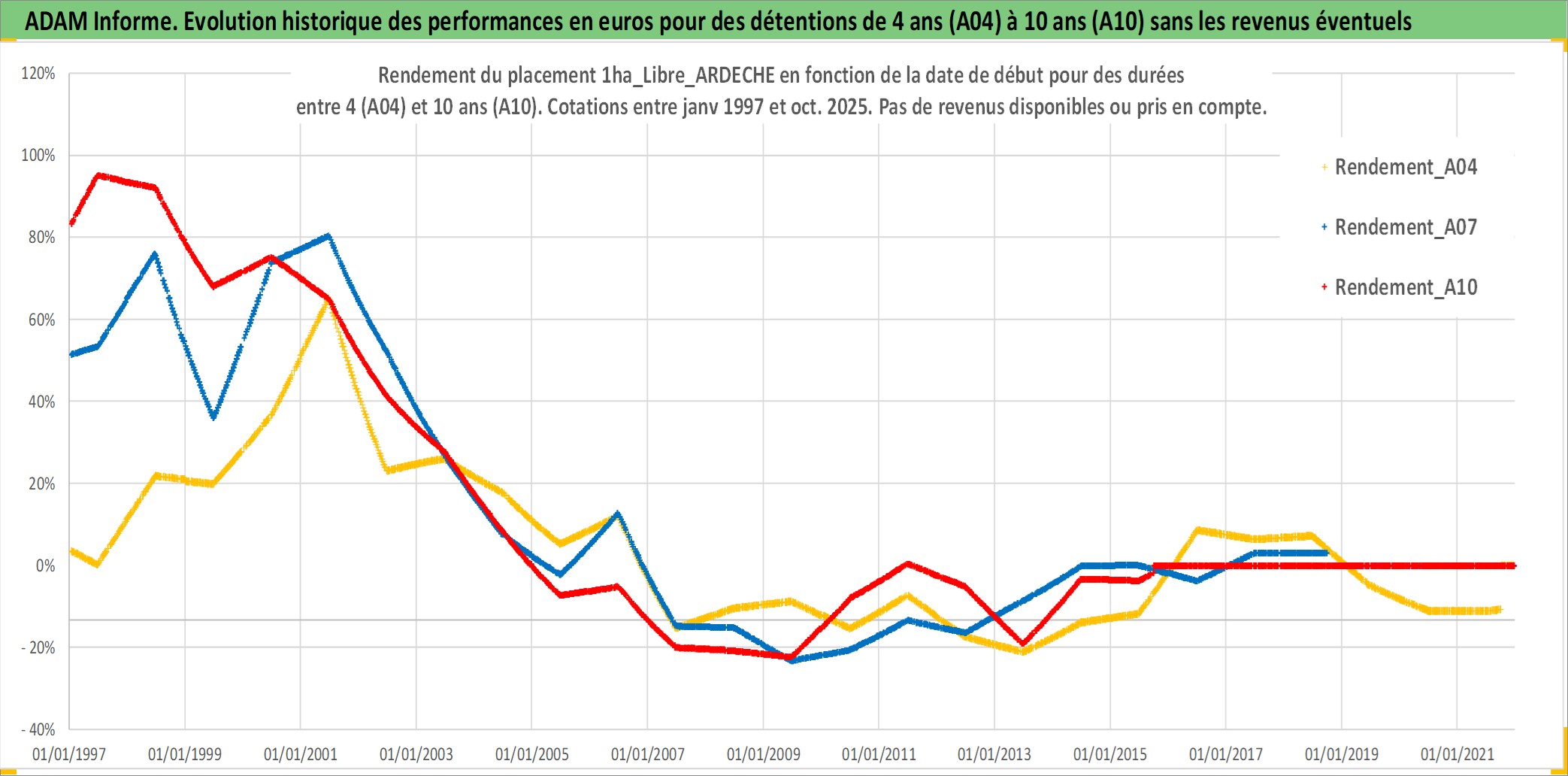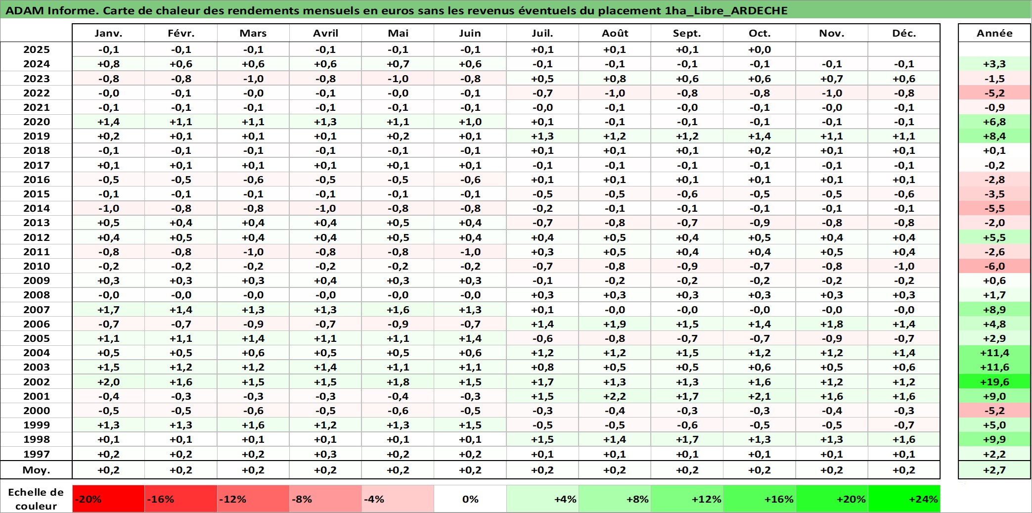 Site dédié aux investisseursPage dédiée sur site financeAnalyse des valorisations hebdomadaires de l'actif 1ha_Libre_ARDECHE. Cet actif est cote en EUR. Les valorisations couvrent les semaines 1997W01 a 2025W40. Les fermages de ce bien foncier sont pris egaux a 2,5% annuels de la valeur venale du bien.