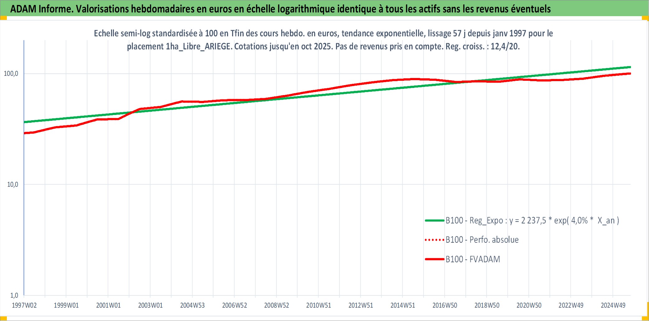 Site dédié aux investisseursPage dédiée sur site financeAnalyse des valorisations hebdomadaires de l'actif 1ha_Libre_ARIEGE. Cet actif est cote en EUR. Les valorisations couvrent les semaines 1997W01 a 2025W40. Les fermages de ce bien foncier sont pris egaux a 2,5% annuels de la valeur venale du bien.