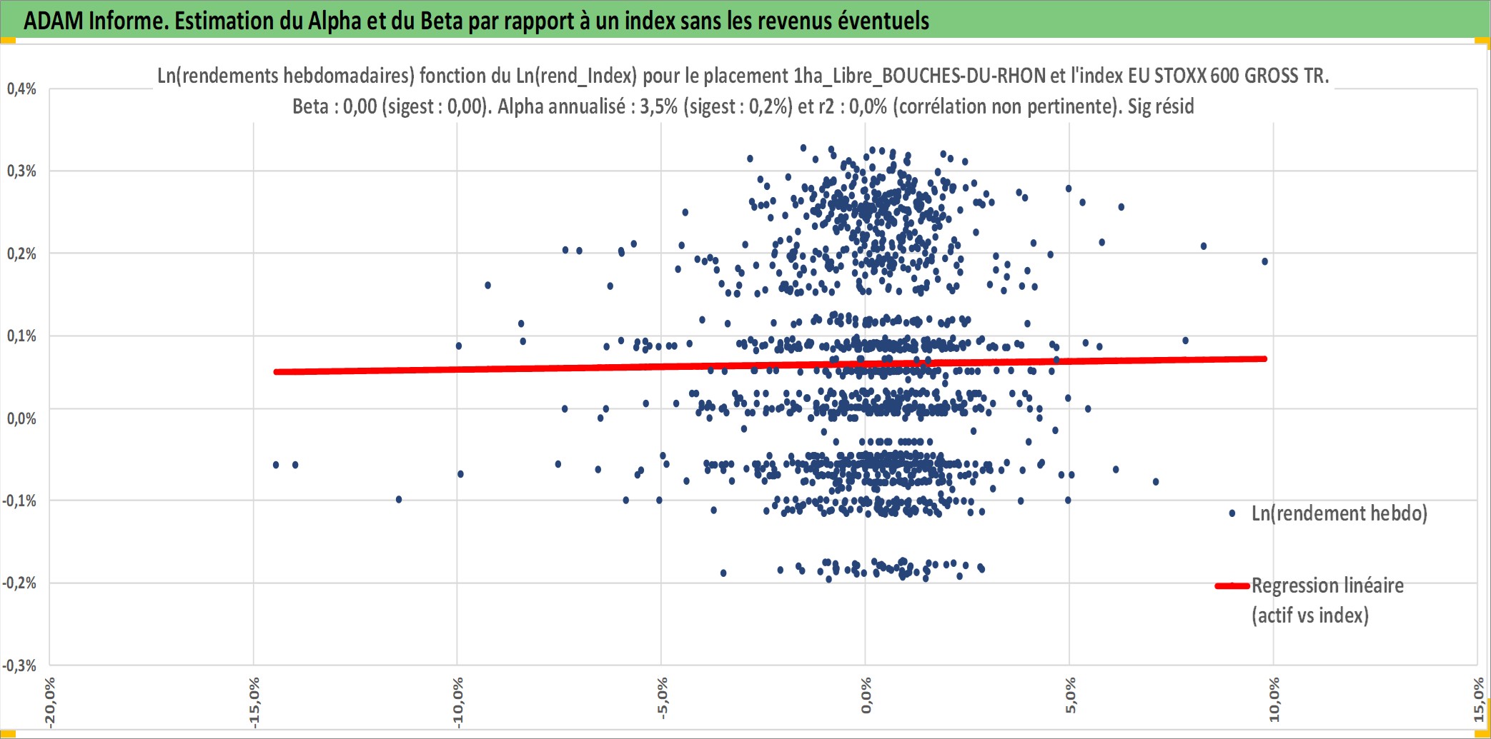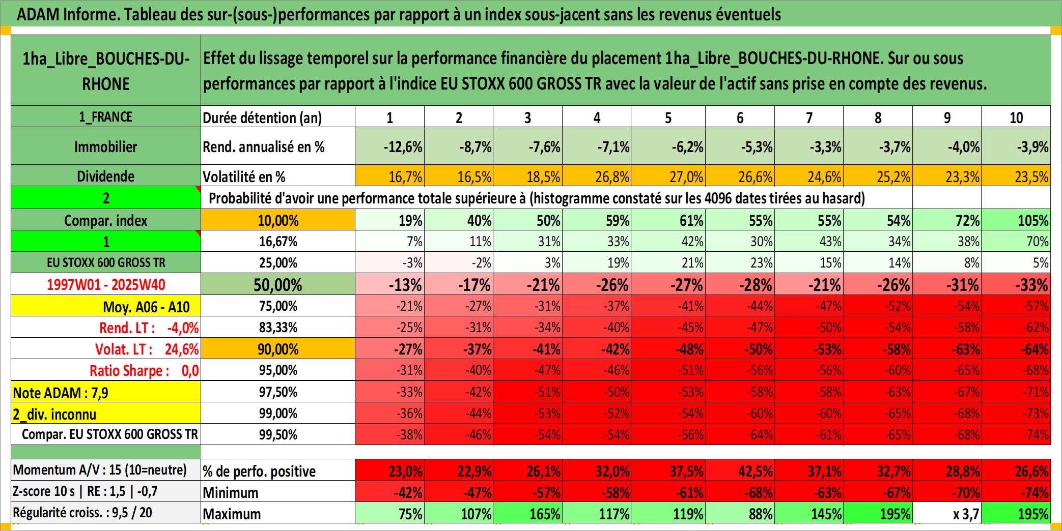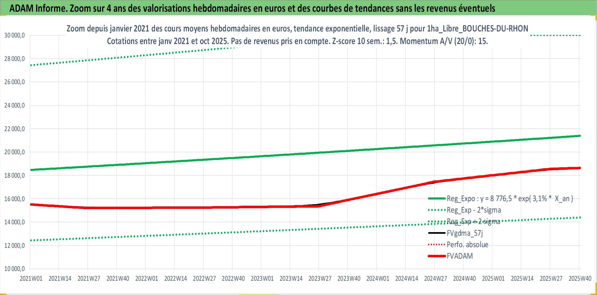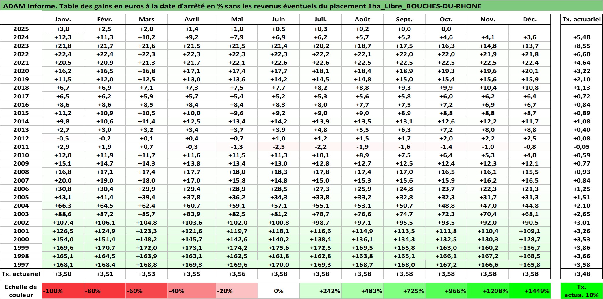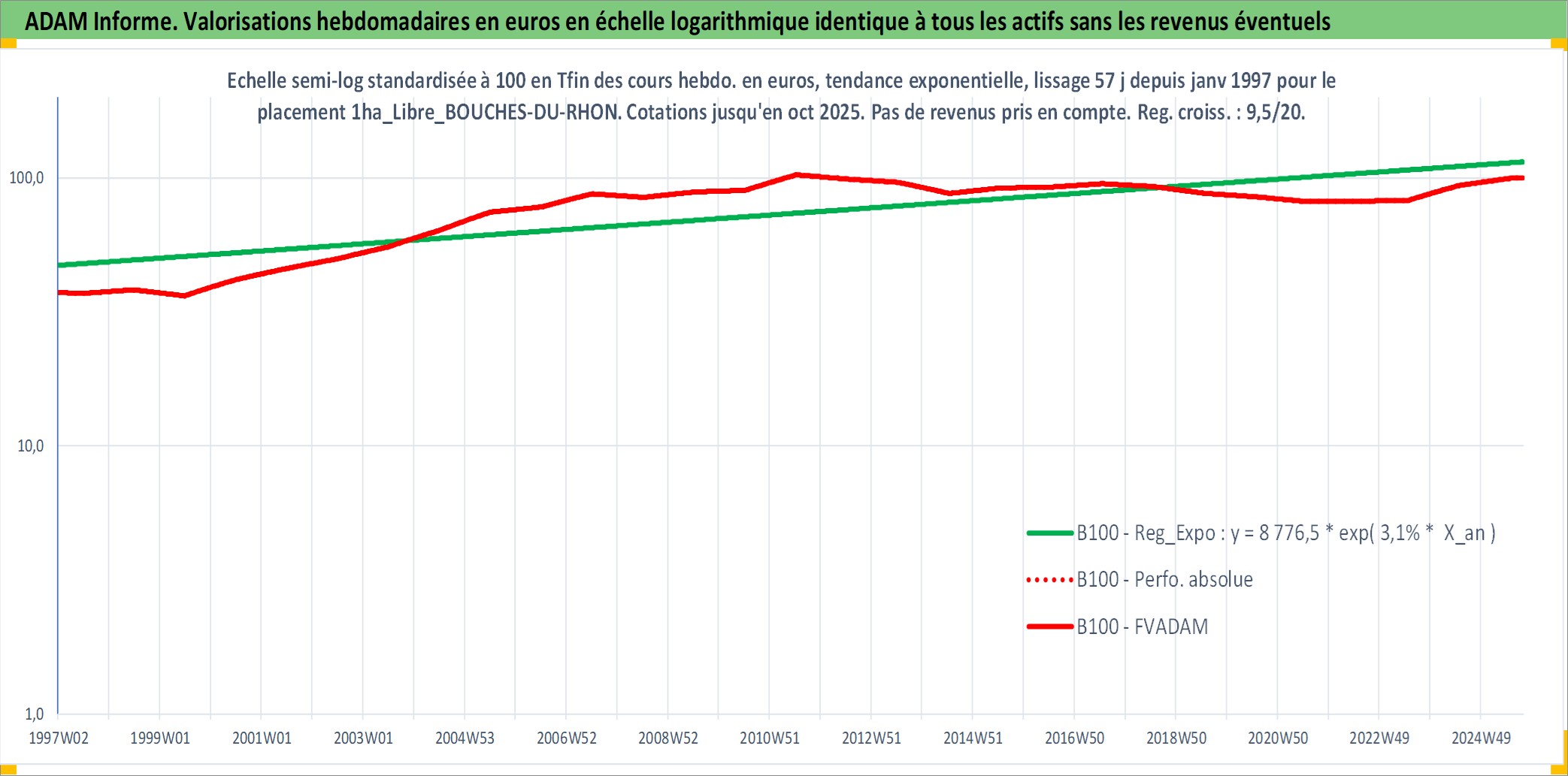 Site dédié aux investisseursPage dédiée sur site financeAnalyse des valorisations hebdomadaires de l'actif 1ha_Libre_BOUCHES-DU-RHONE. Cet actif est cote en EUR. Les valorisations couvrent les semaines 1997W01 a 2025W40. Les fermages de ce bien foncier sont pris egaux a 2,5% annuels de la valeur venale du bien.