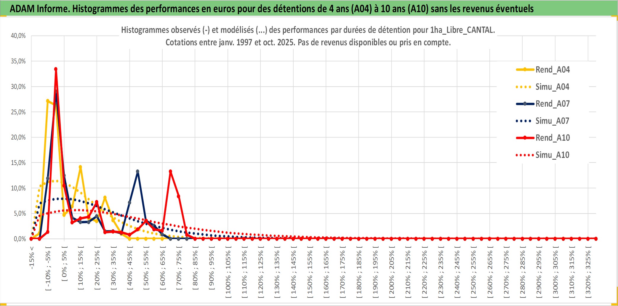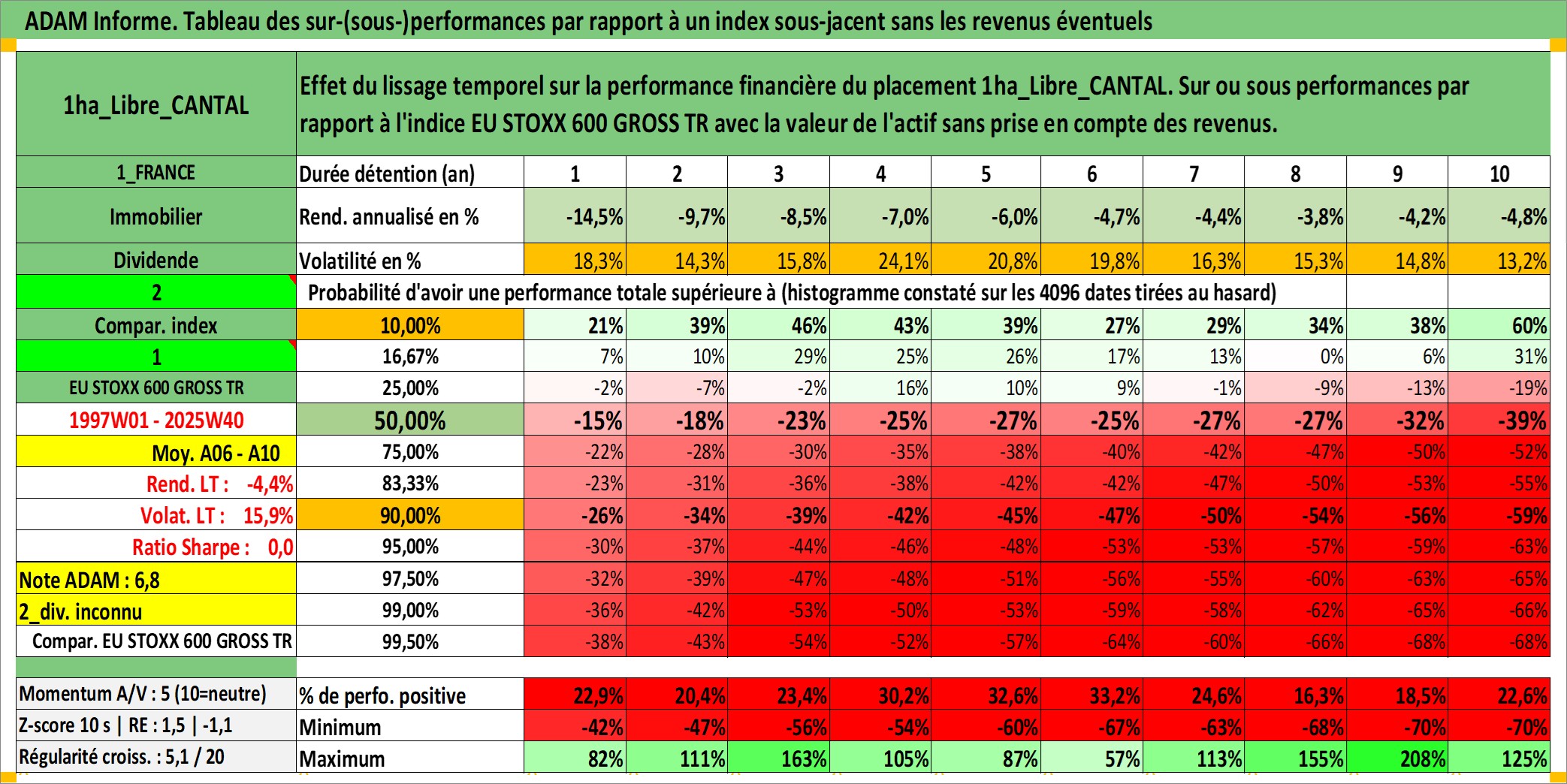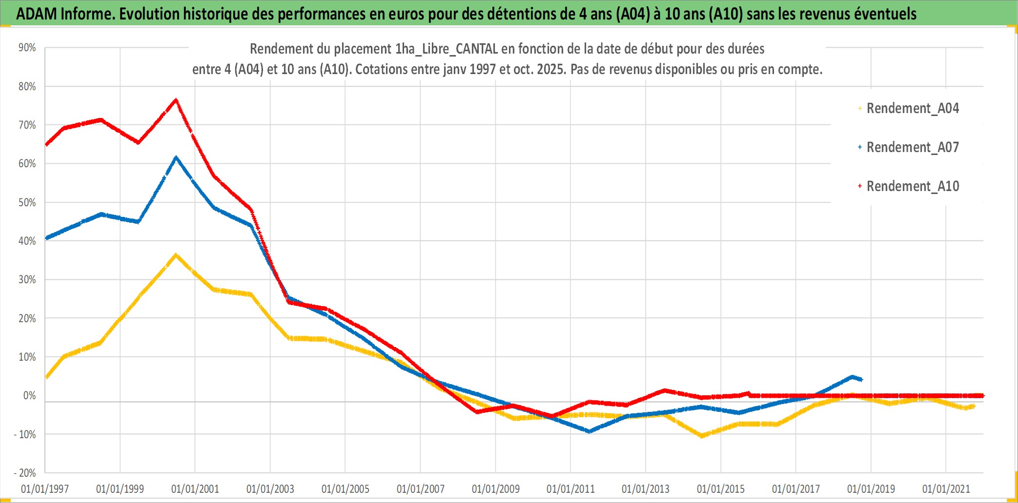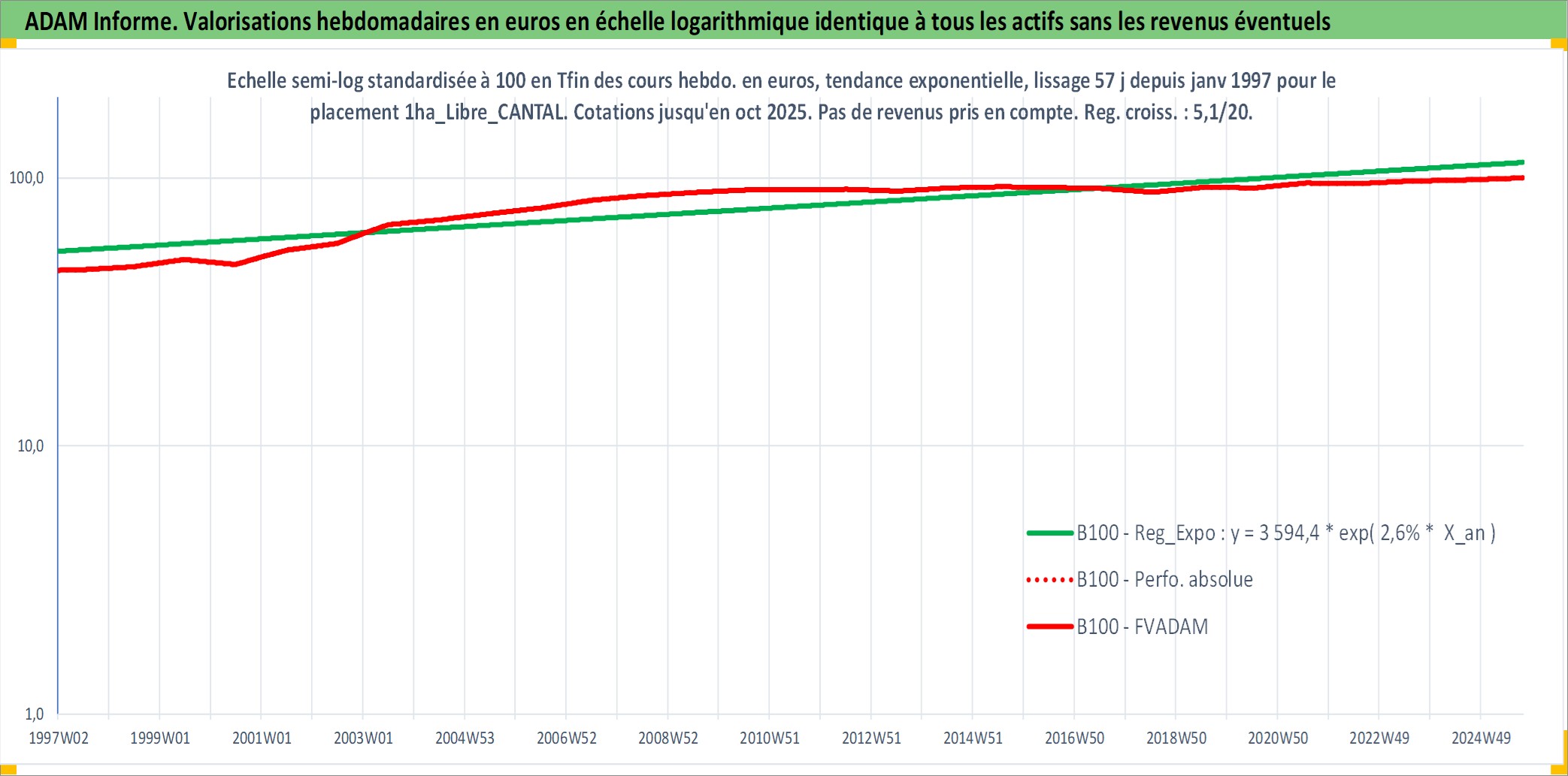 Site dédié aux investisseursPage dédiée sur site financeAnalyse des valorisations hebdomadaires de l'actif 1ha_Libre_CANTAL. Cet actif est cote en EUR. Les valorisations couvrent les semaines 1997W01 a 2025W40. Les fermages de ce bien foncier sont pris egaux a 2,5% annuels de la valeur venale du bien.