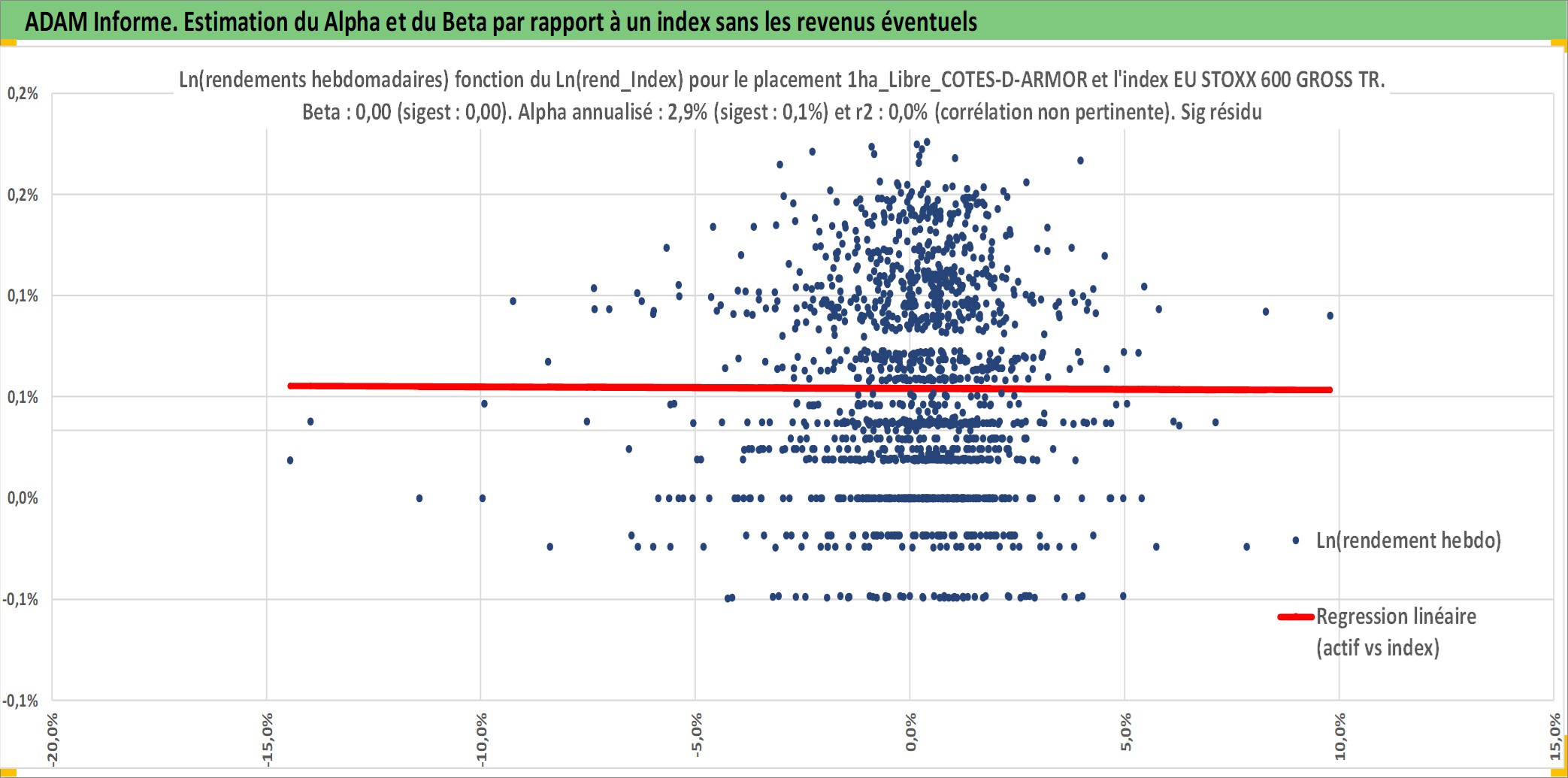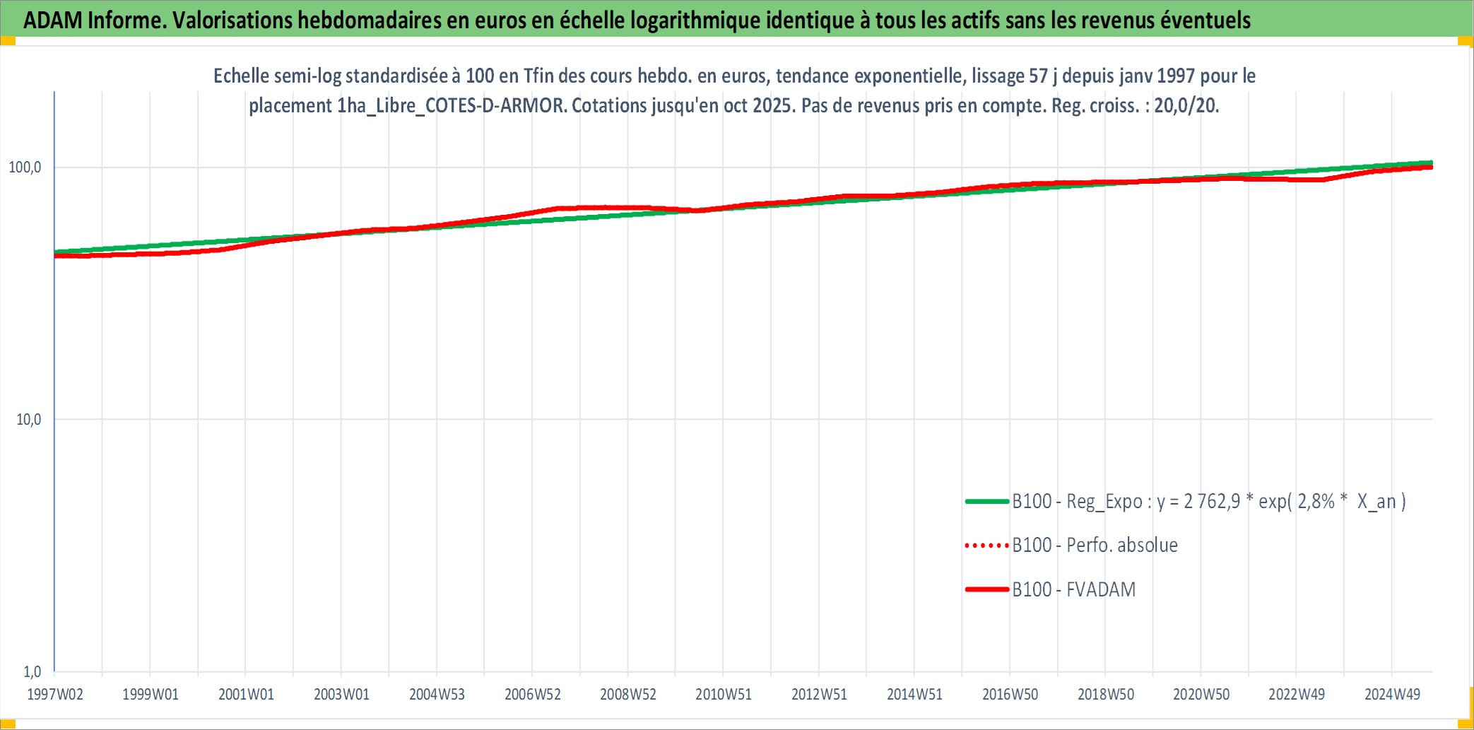 Site dédié aux investisseursPage dédiée sur site financeAnalyse des valorisations hebdomadaires de l'actif 1ha_Libre_COTES-D-ARMOR. Cet actif est cote en EUR. Les valorisations couvrent les semaines 1997W01 a 2025W40. Les fermages de ce bien foncier sont pris egaux a 2,5% annuels de la valeur venale du bien.