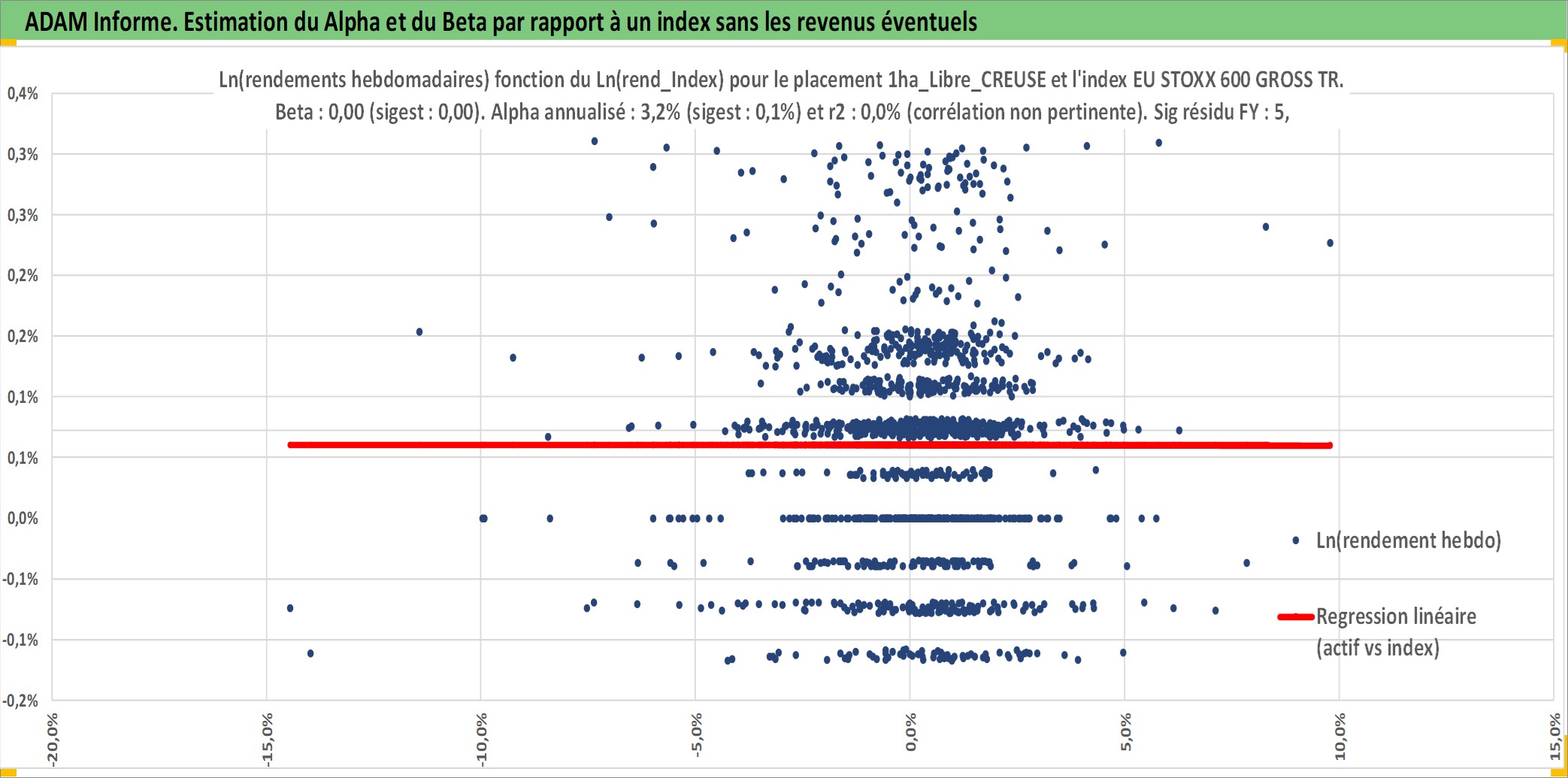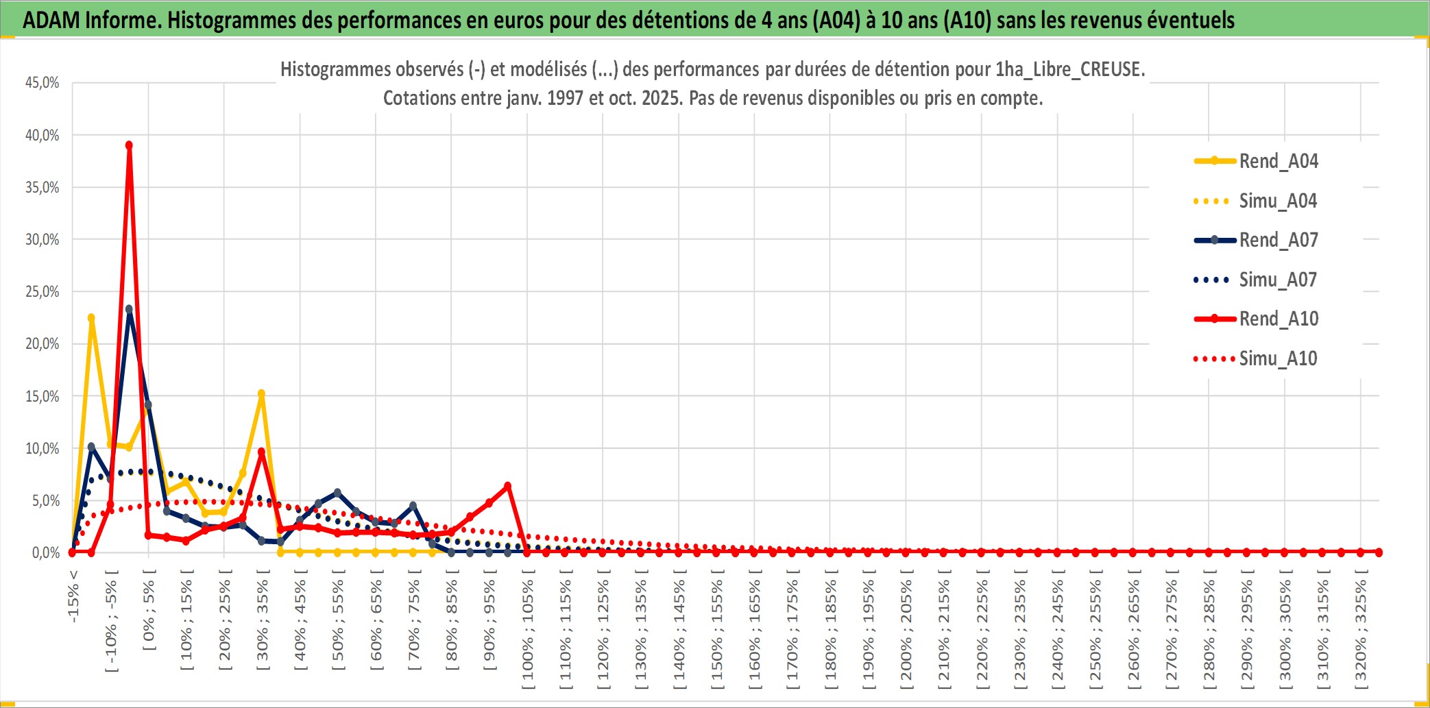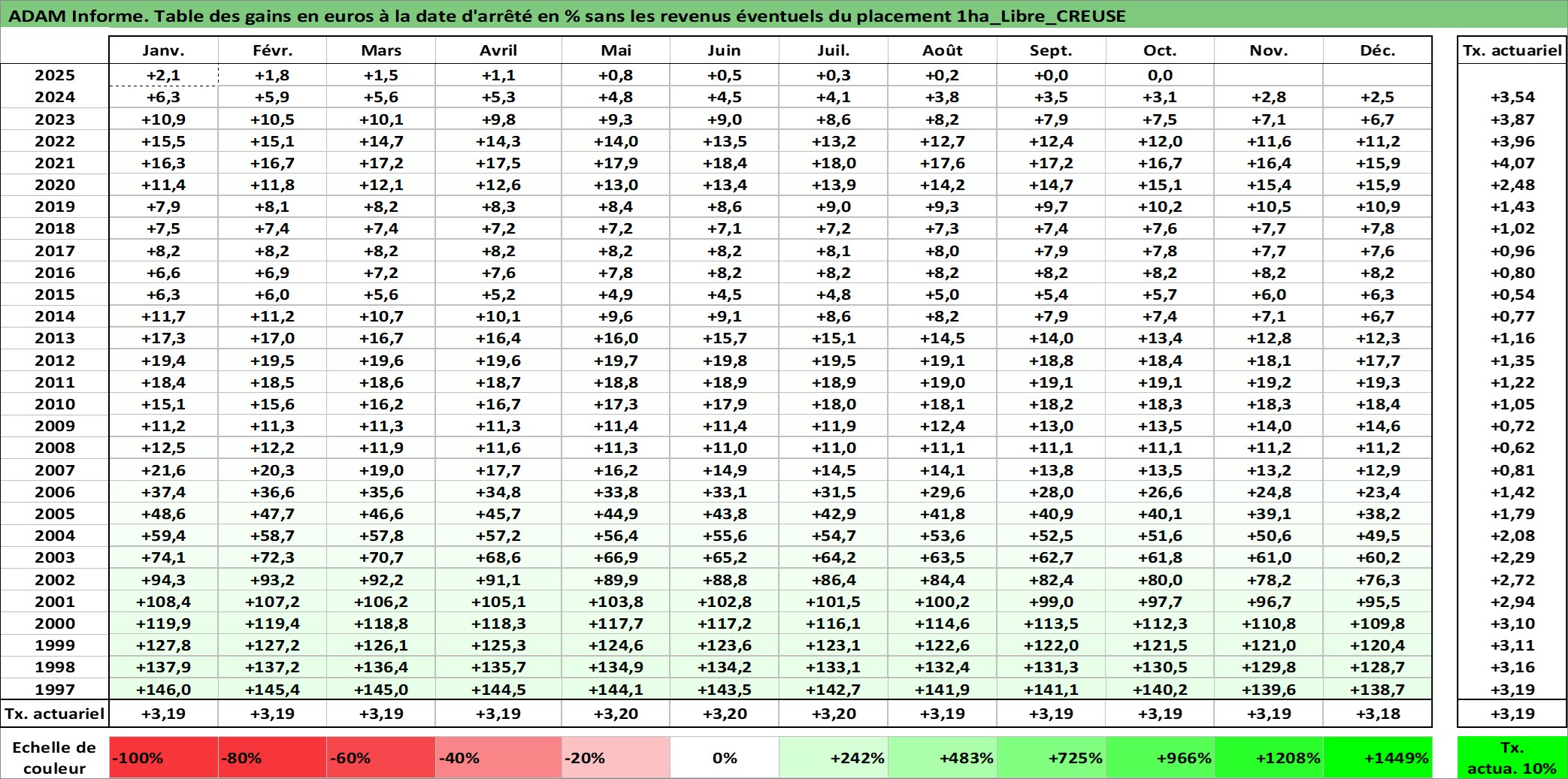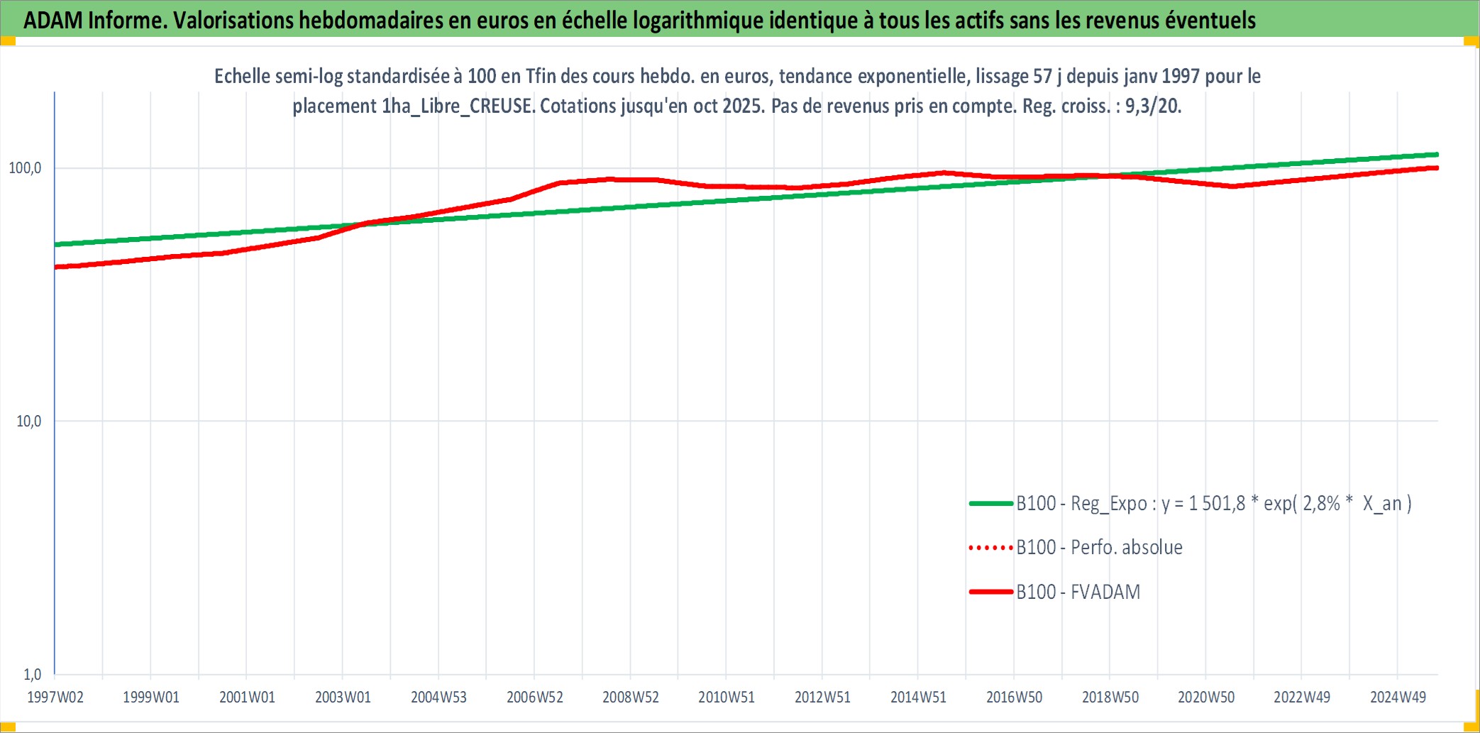 Site dédié aux investisseursPage dédiée sur site financeAnalyse des valorisations hebdomadaires de l'actif 1ha_Libre_CREUSE. Cet actif est cote en EUR. Les valorisations couvrent les semaines 1997W01 a 2025W40. Les fermages de ce bien foncier sont pris egaux a 2,5% annuels de la valeur venale du bien.