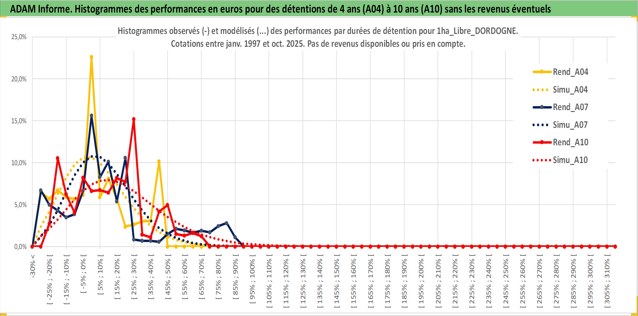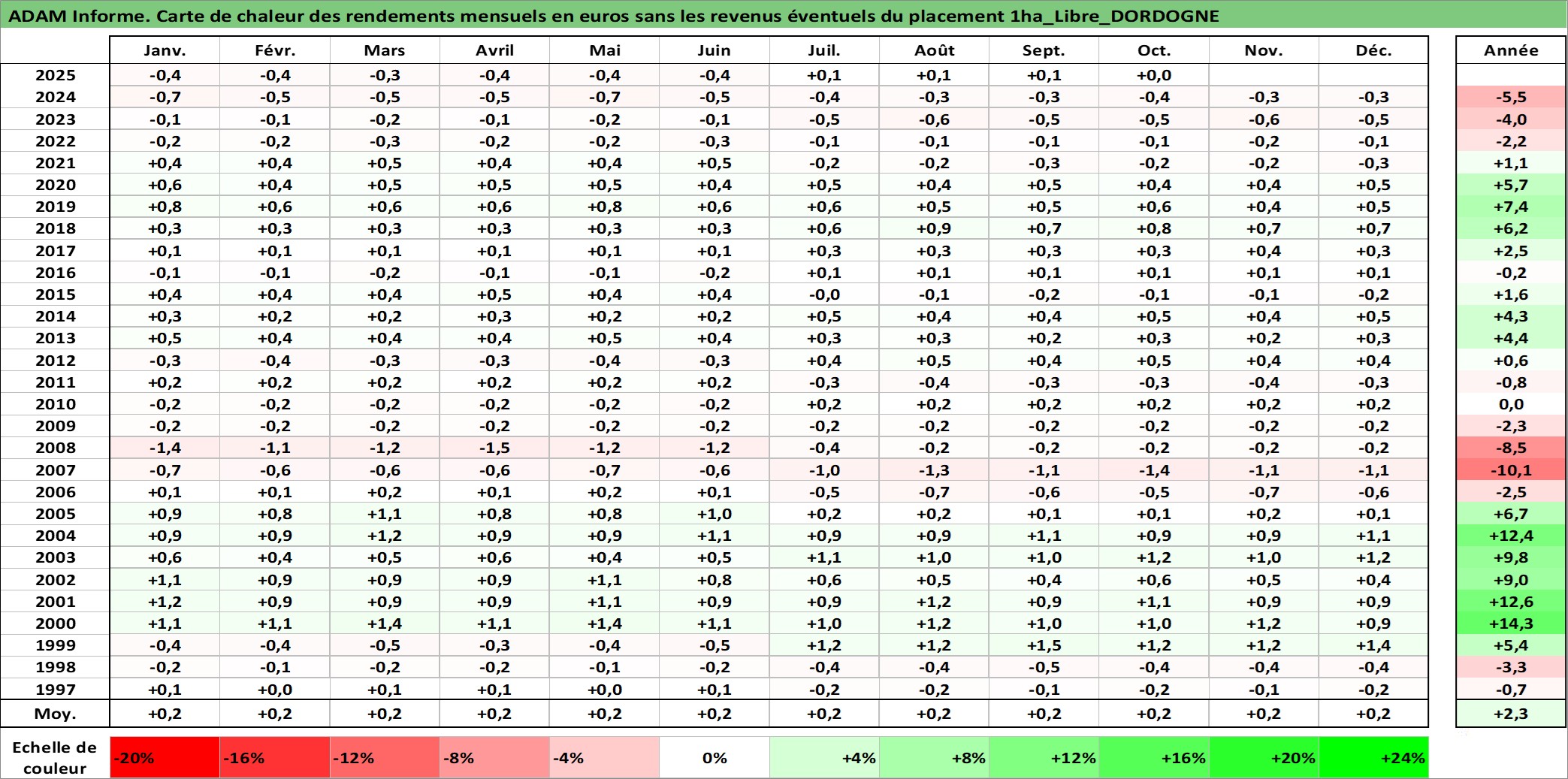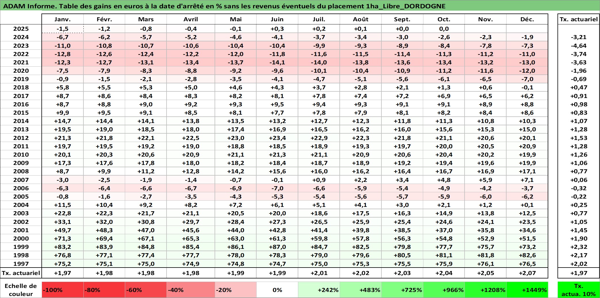 Site dédié aux investisseursPage dédiée sur site financeAnalyse des valorisations hebdomadaires de l'actif 1ha_Libre_DORDOGNE. Cet actif est cote en EUR. Les valorisations couvrent les semaines 1997W01 a 2025W40. Les fermages de ce bien foncier sont pris egaux a 2,5% annuels de la valeur venale du bien.