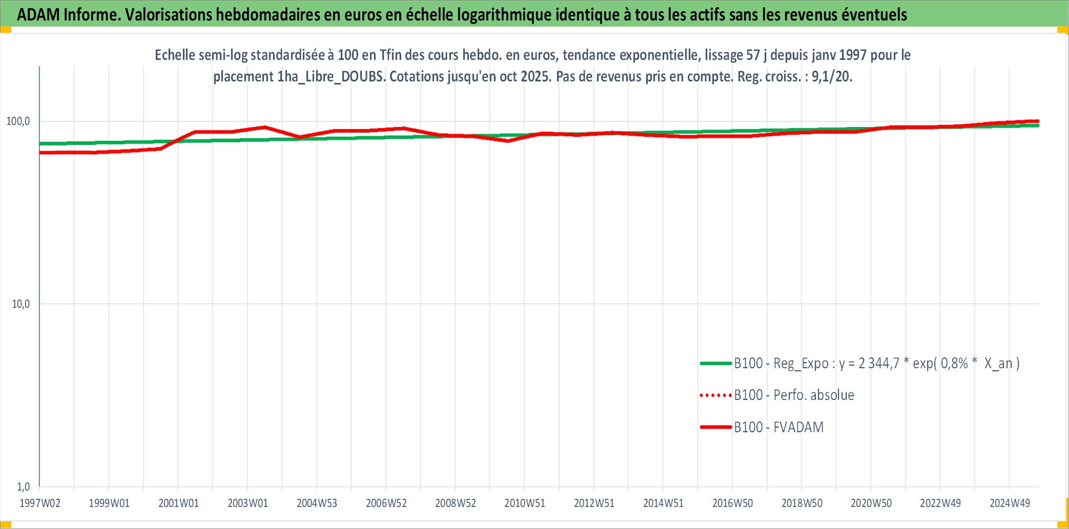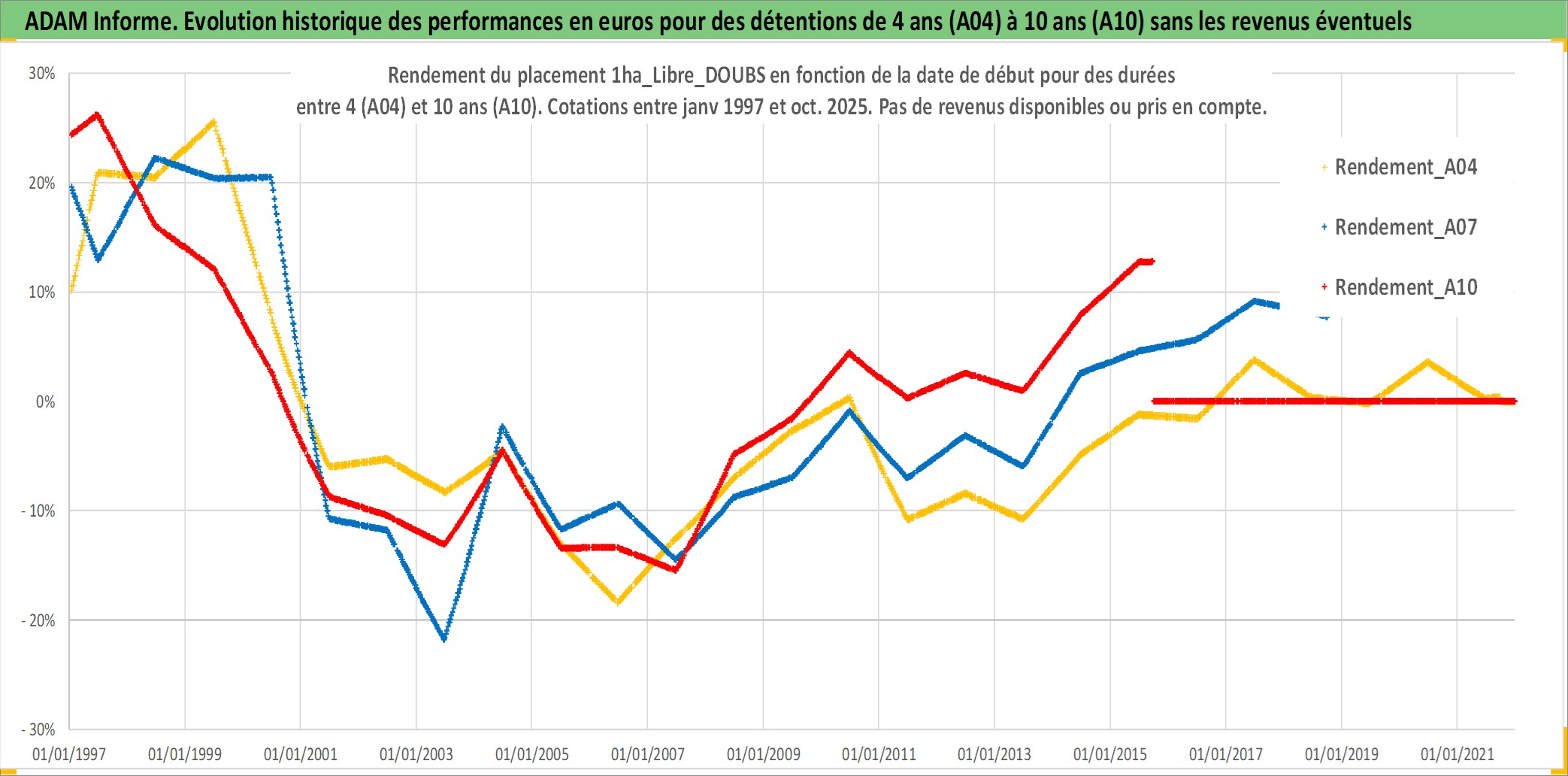 Site dédié aux investisseursPage dédiée sur site financeAnalyse des valorisations hebdomadaires de l'actif 1ha_Libre_DOUBS. Cet actif est cote en EUR. Les valorisations couvrent les semaines 1997W01 a 2025W40. Les fermages de ce bien foncier sont pris egaux a 2,5% annuels de la valeur venale du bien.