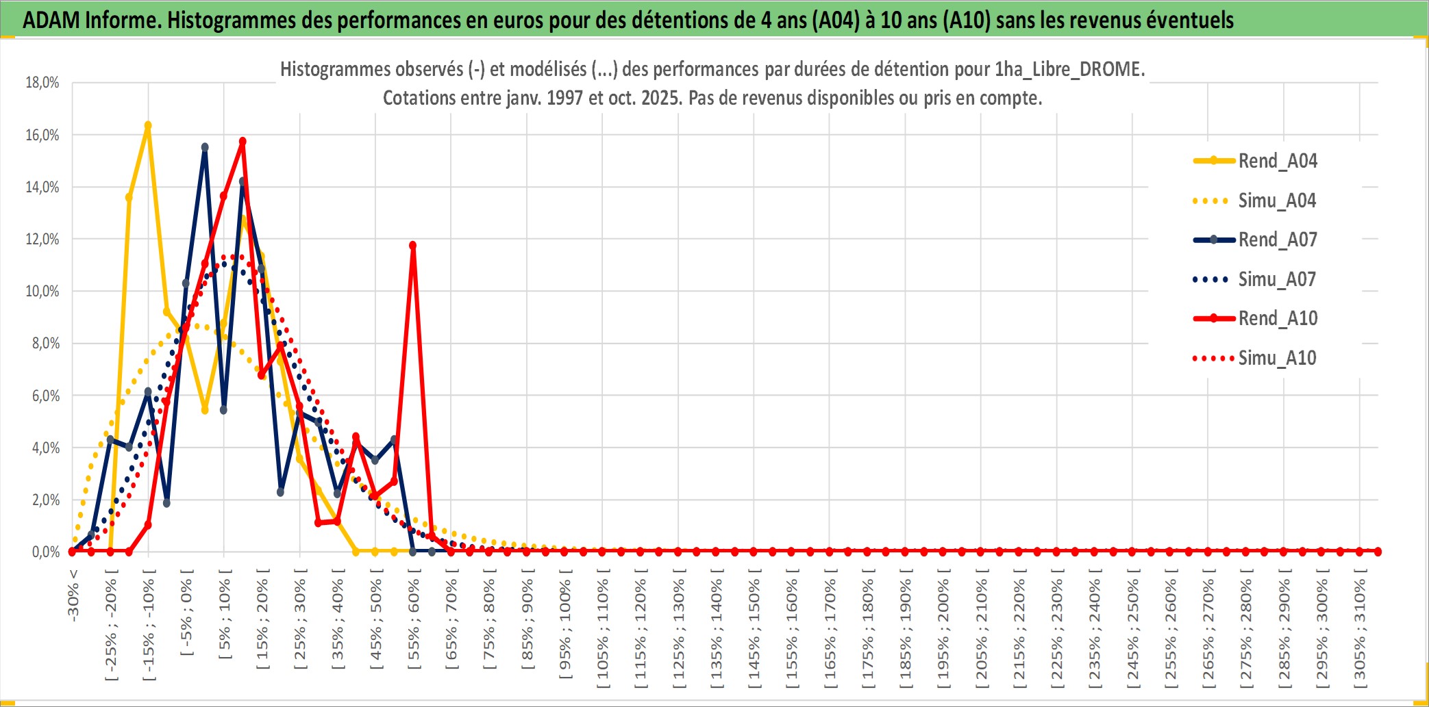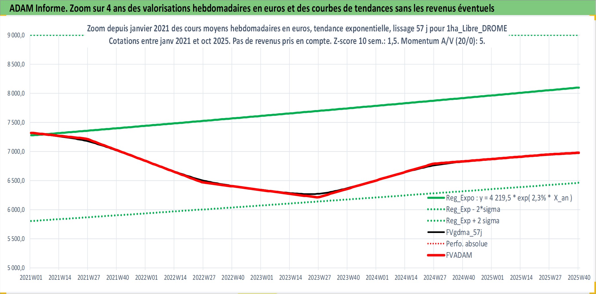 Site dédié aux investisseursPage dédiée sur site financeAnalyse des valorisations hebdomadaires de l'actif 1ha_Libre_DROME. Cet actif est cote en EUR. Les valorisations couvrent les semaines 1997W01 a 2025W40. Les fermages de ce bien foncier sont pris egaux a 2,5% annuels de la valeur venale du bien.