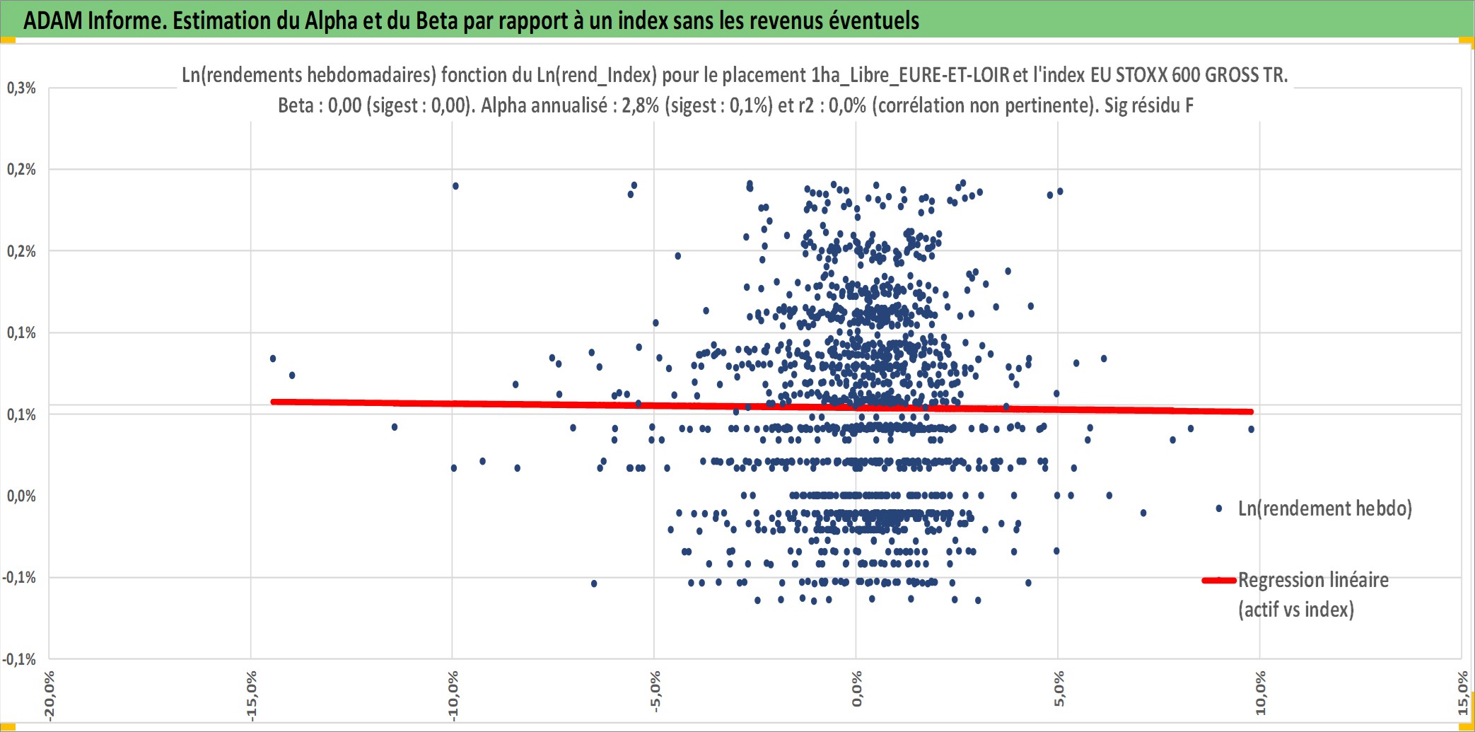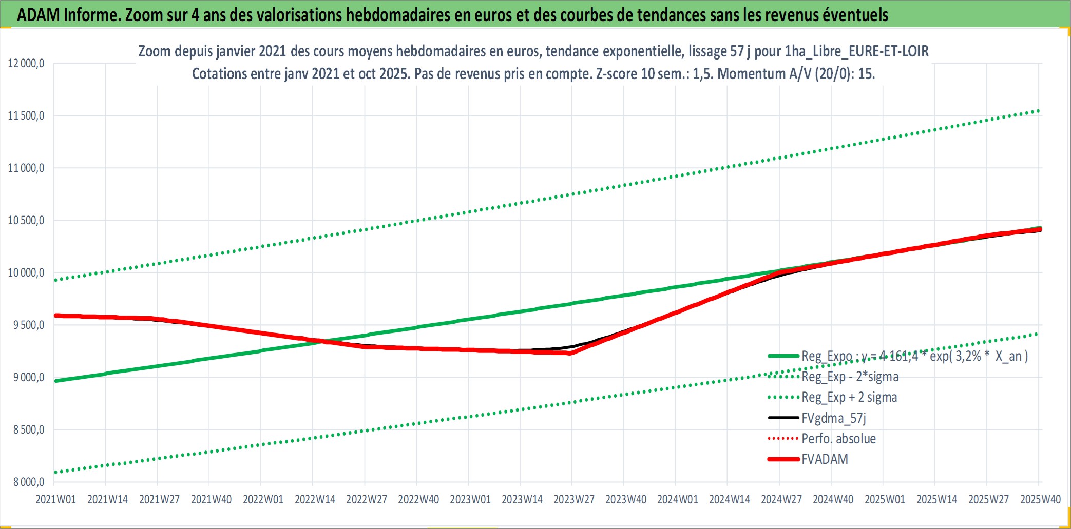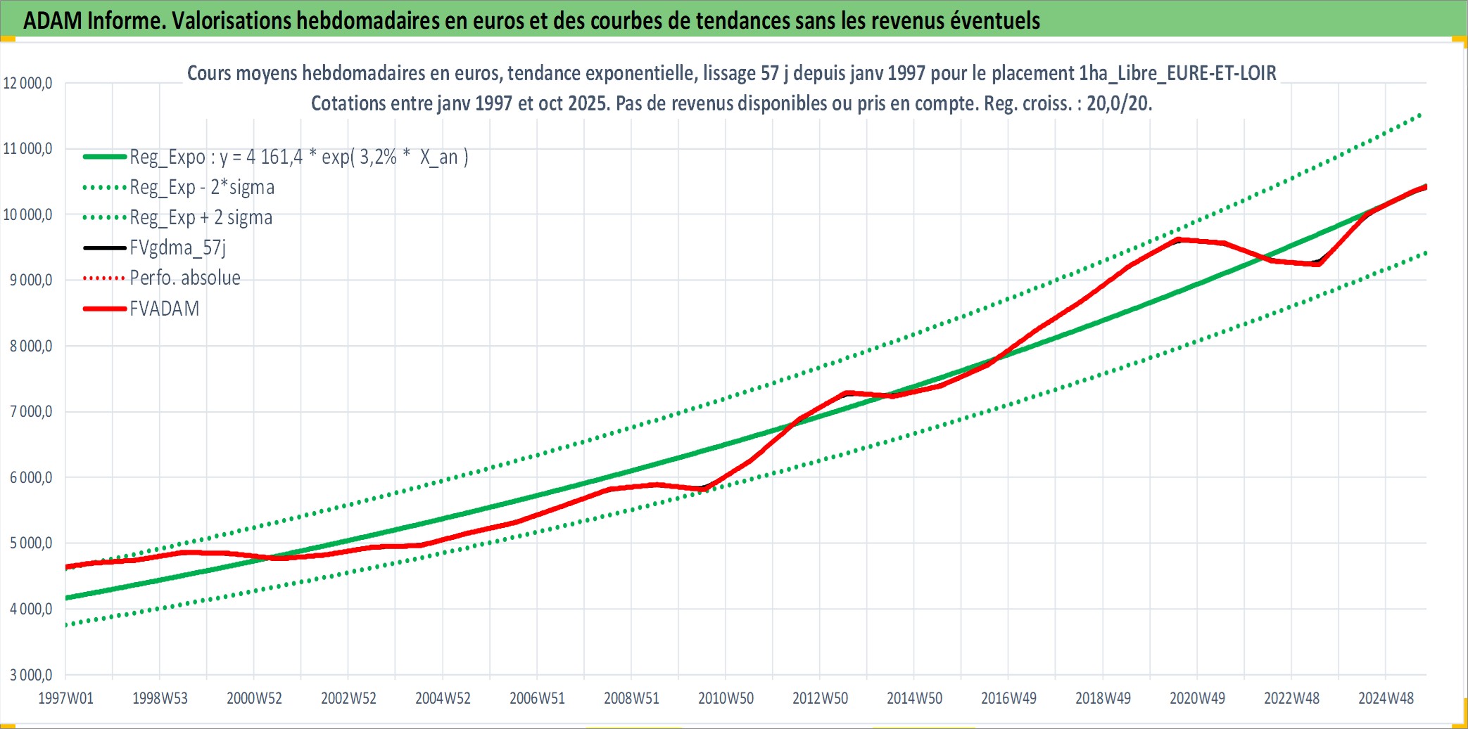 Site dédié aux investisseursPage dédiée sur site financeAnalyse des valorisations hebdomadaires de l'actif 1ha_Libre_EURE-ET-LOIR. Cet actif est cote en EUR. Les valorisations couvrent les semaines 1997W01 a 2025W40. Les fermages de ce bien foncier sont pris egaux a 2,5% annuels de la valeur venale du bien.