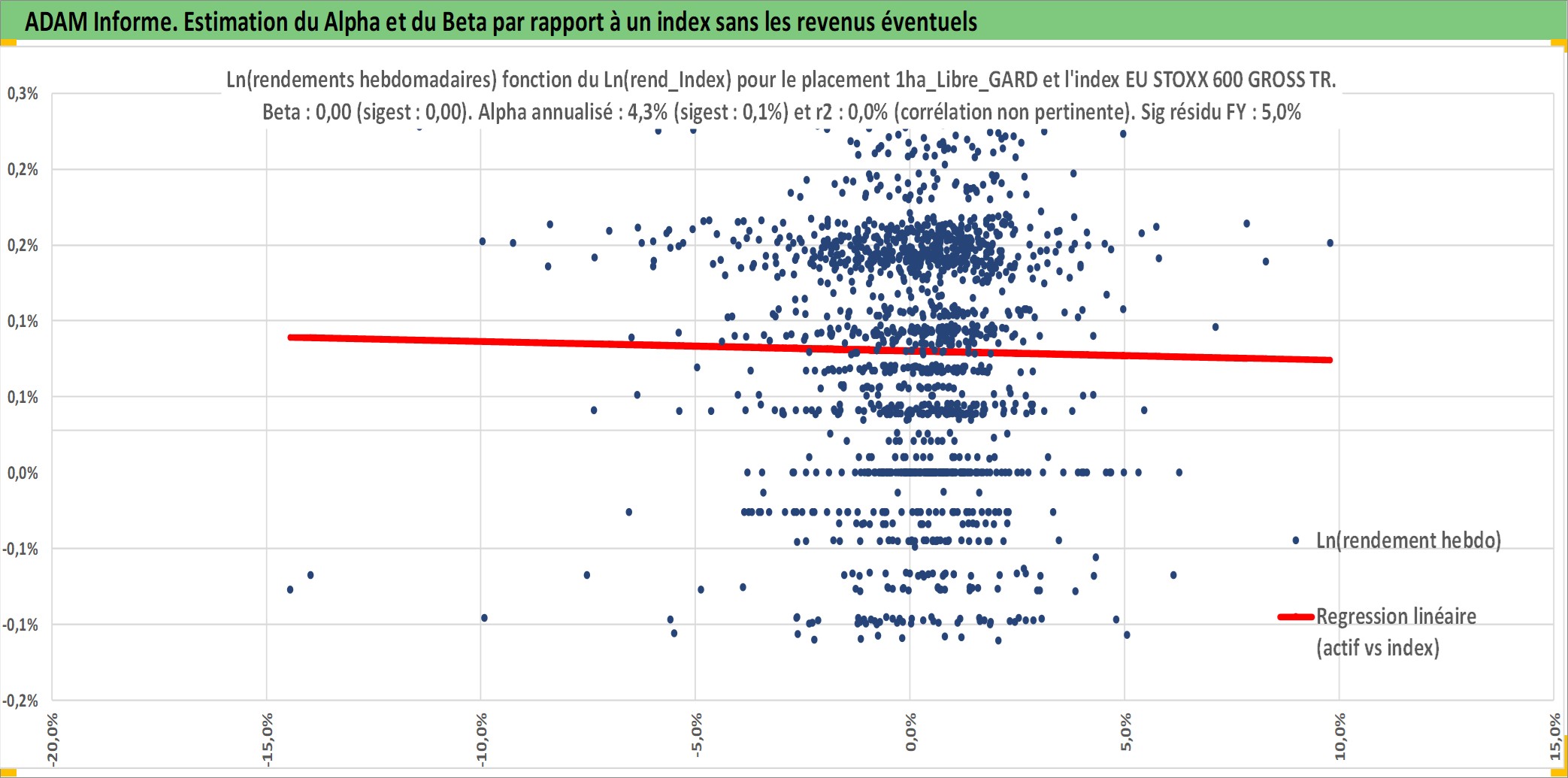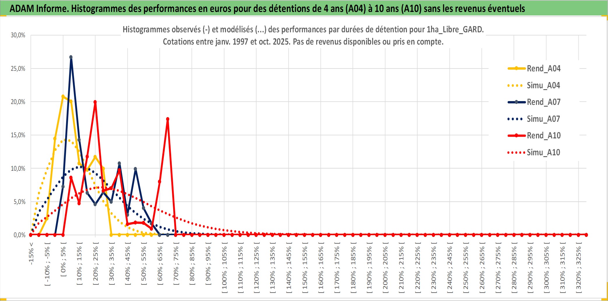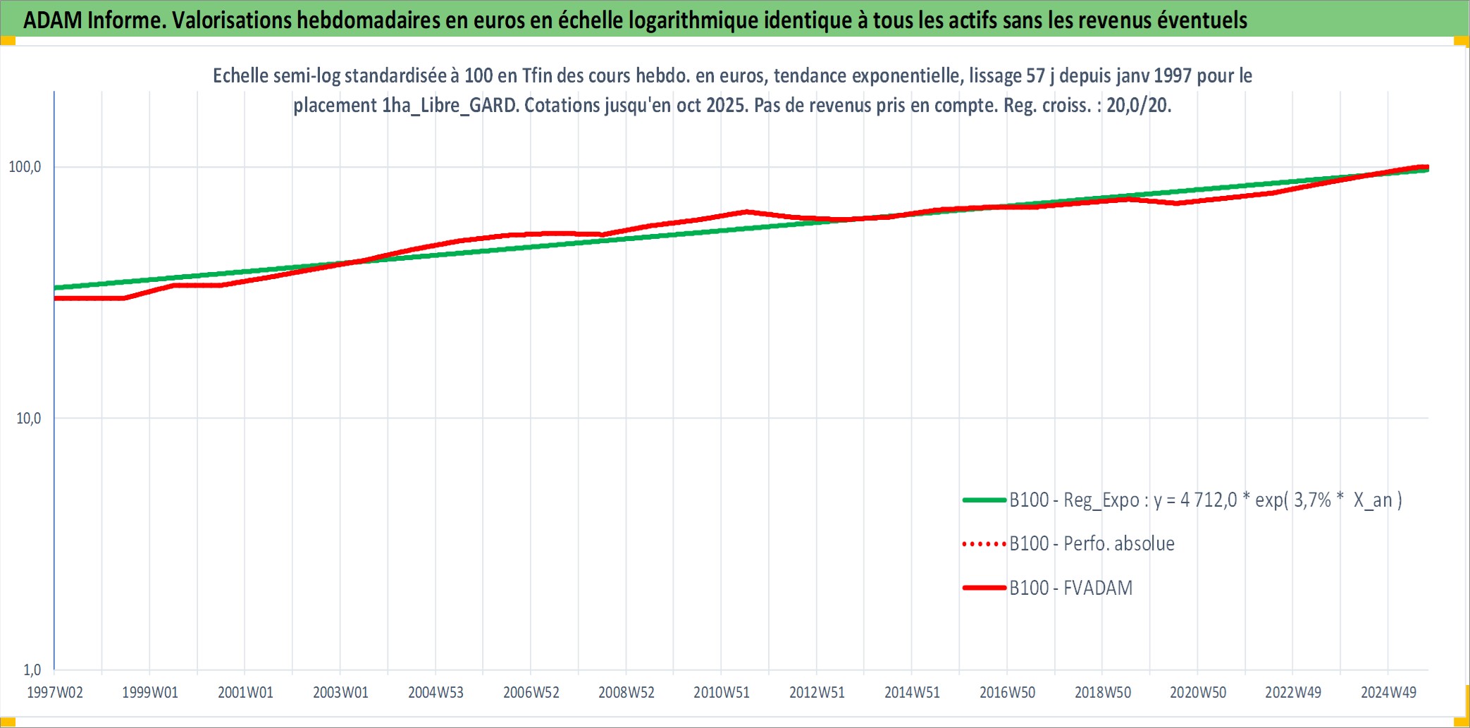 Site dédié aux investisseursPage dédiée sur site financeAnalyse des valorisations hebdomadaires de l'actif 1ha_Libre_GARD. Cet actif est cote en EUR. Les valorisations couvrent les semaines 1997W01 a 2025W40. Les fermages de ce bien foncier sont pris egaux a 2,5% annuels de la valeur venale du bien.