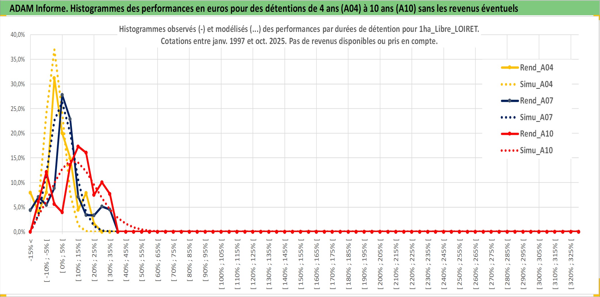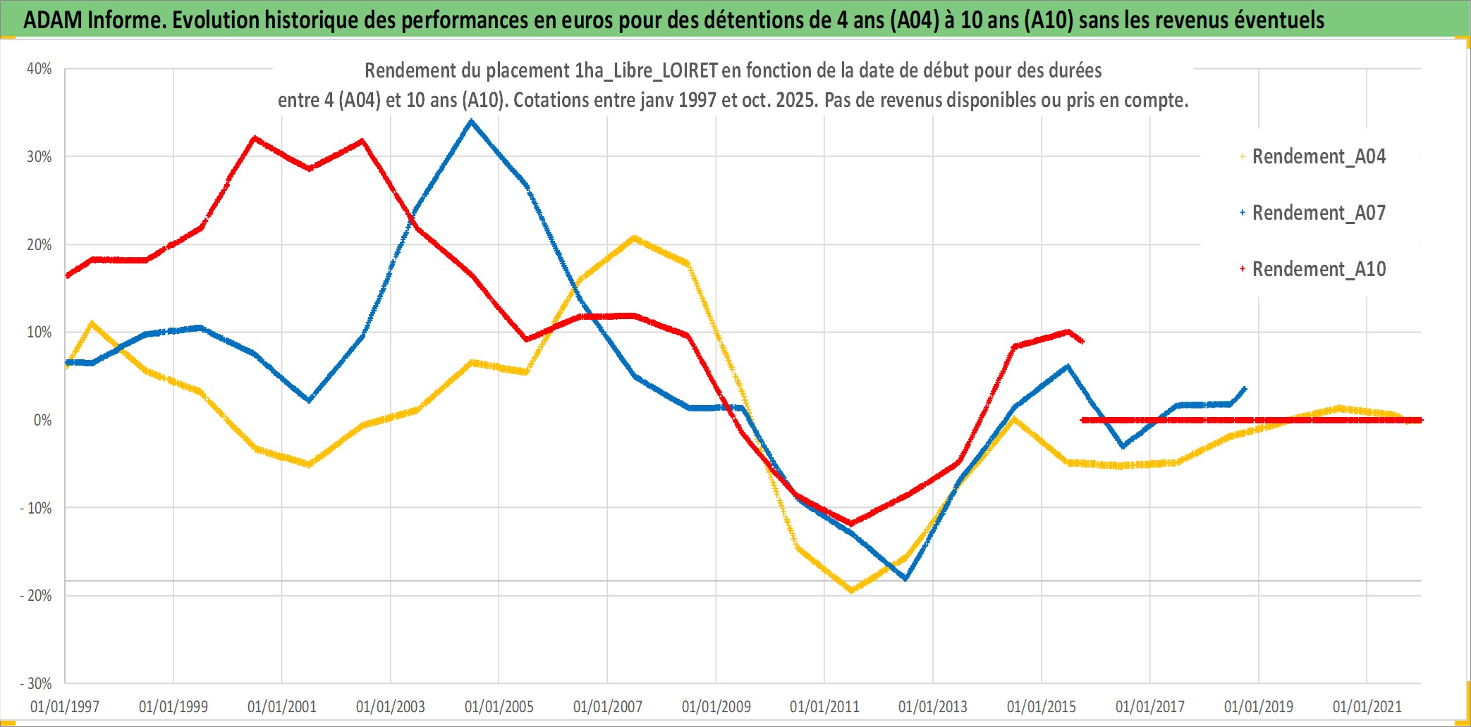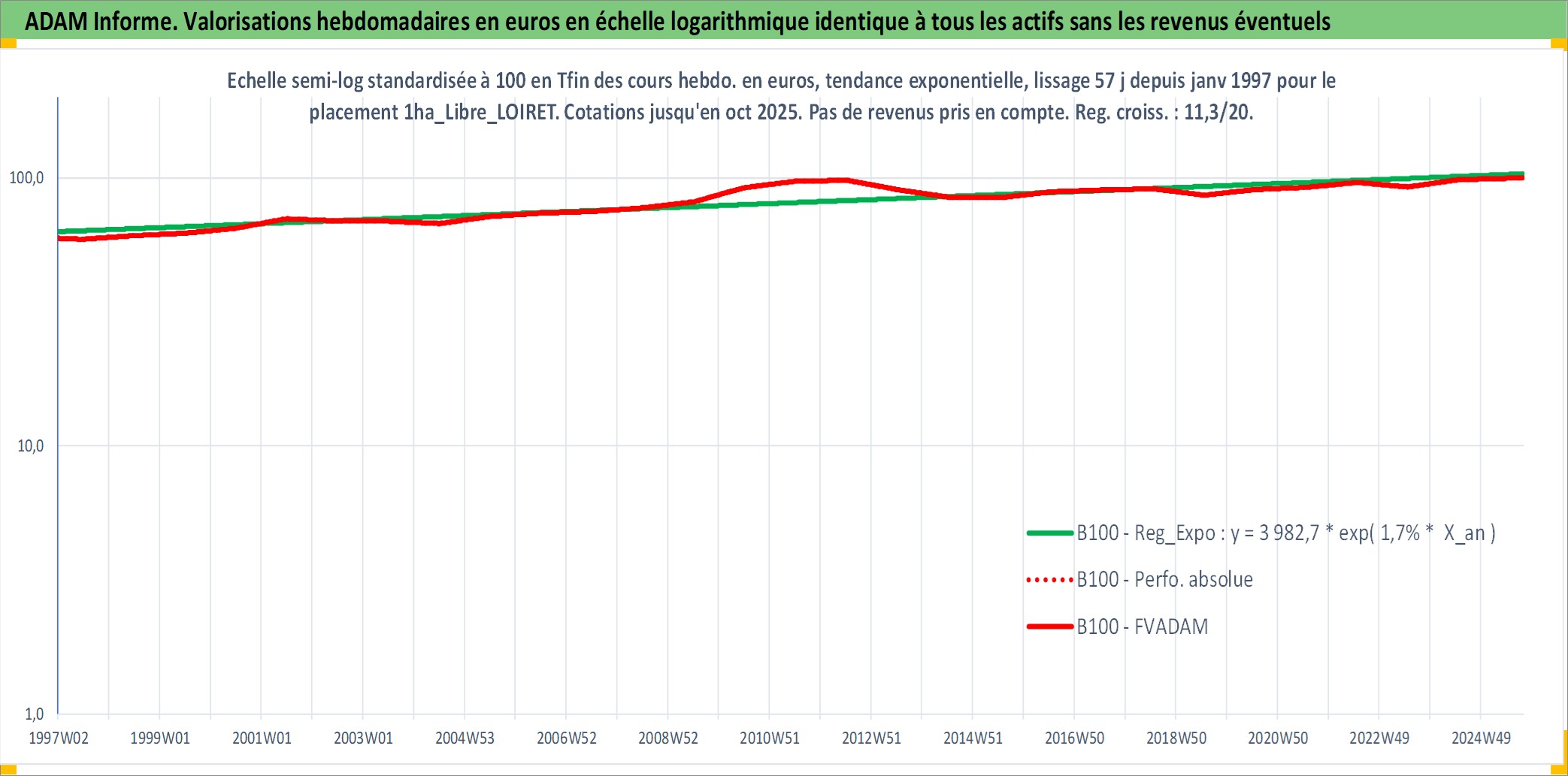 Site dédié aux investisseursPage dédiée sur site financeAnalyse des valorisations hebdomadaires de l'actif 1ha_Libre_LOIRET. Cet actif est cote en EUR. Les valorisations couvrent les semaines 1997W01 a 2025W40. Les fermages de ce bien foncier sont pris egaux a 2,5% annuels de la valeur venale du bien.