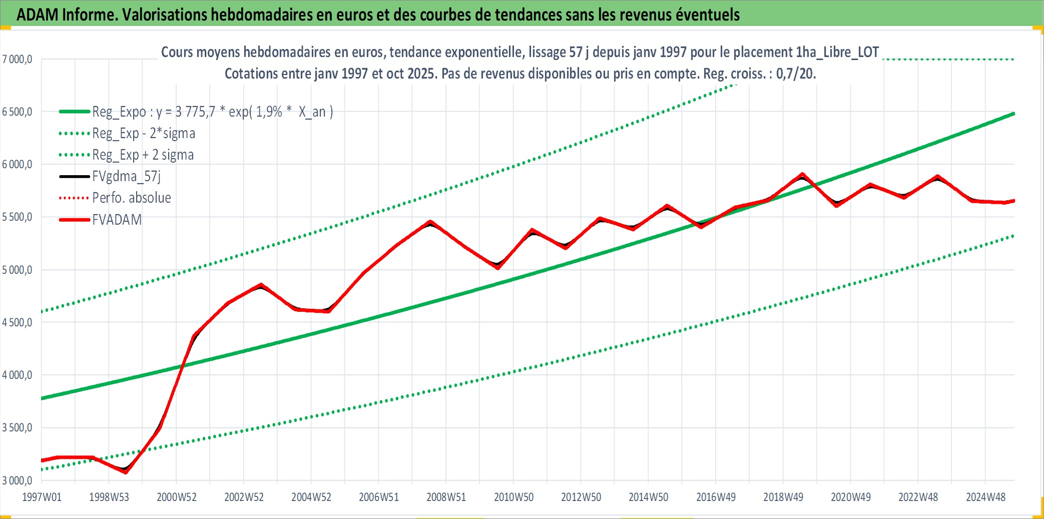 Site dédié aux investisseursPage dédiée sur site financeAnalyse des valorisations hebdomadaires de l'actif 1ha_Libre_LOT. Cet actif est cote en EUR. Les valorisations couvrent les semaines 1997W01 a 2025W40. Les fermages de ce bien foncier sont pris egaux a 2,5% annuels de la valeur venale du bien.