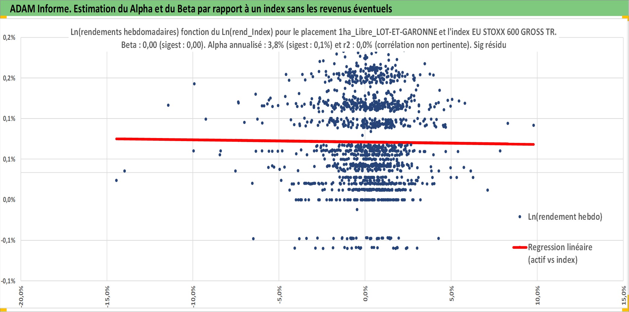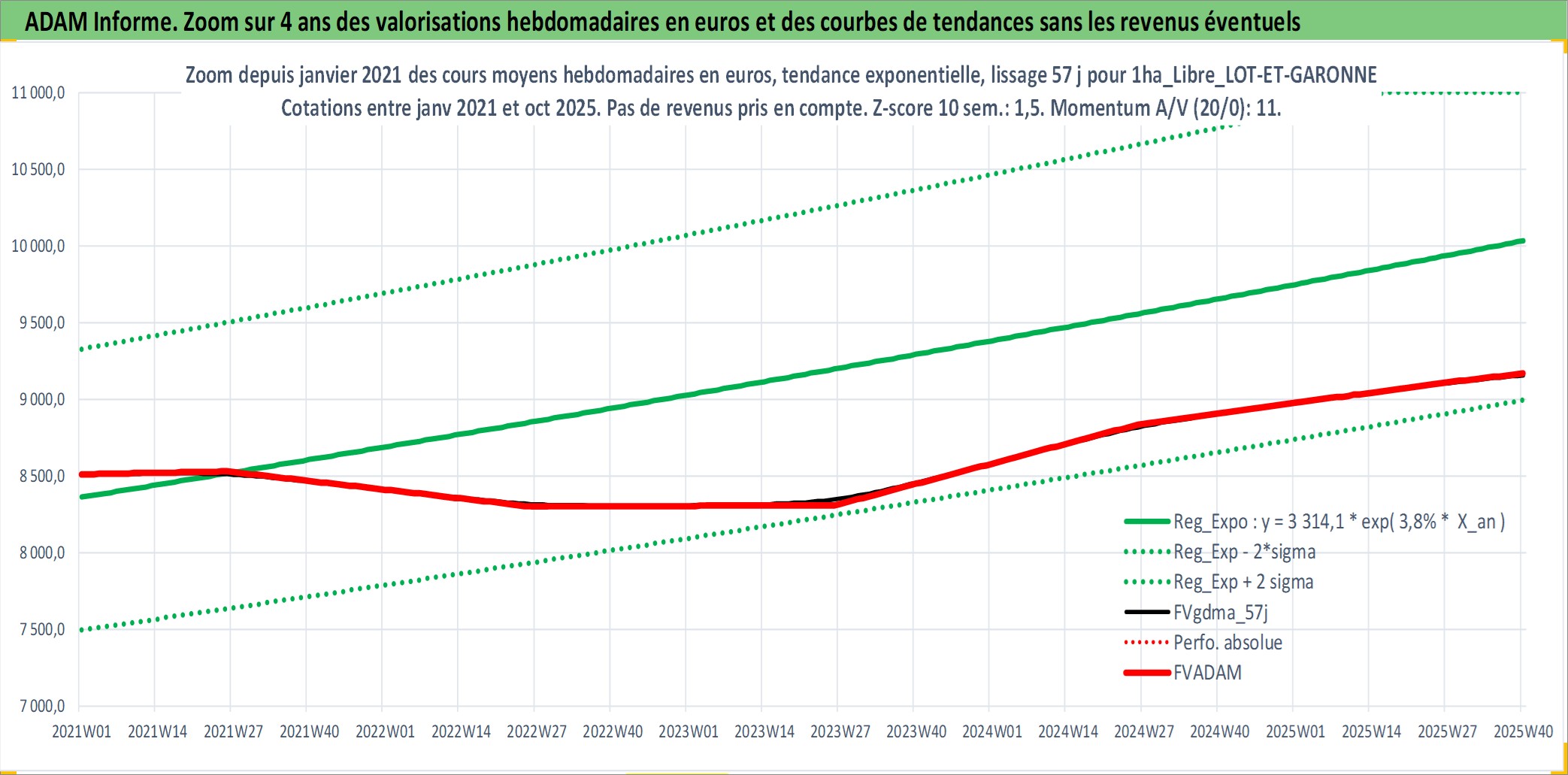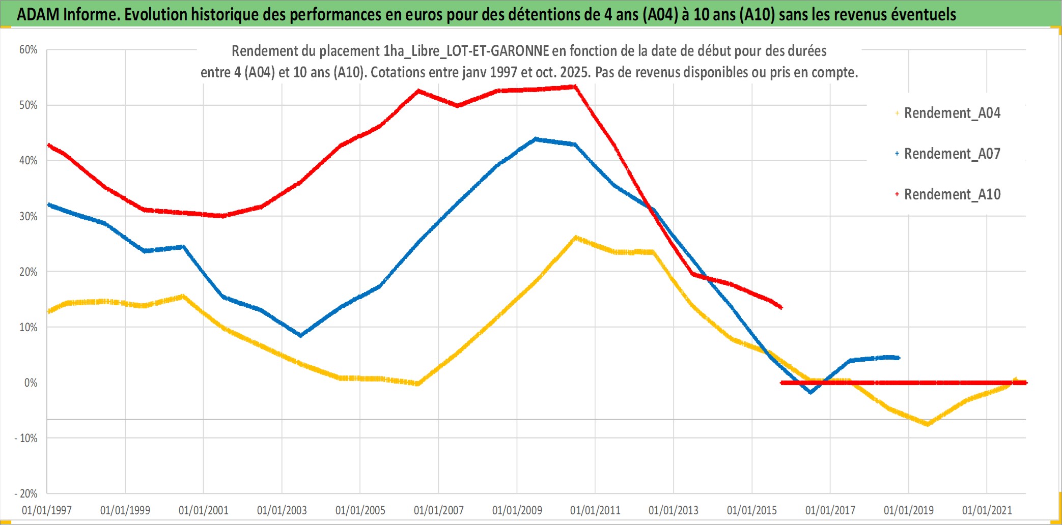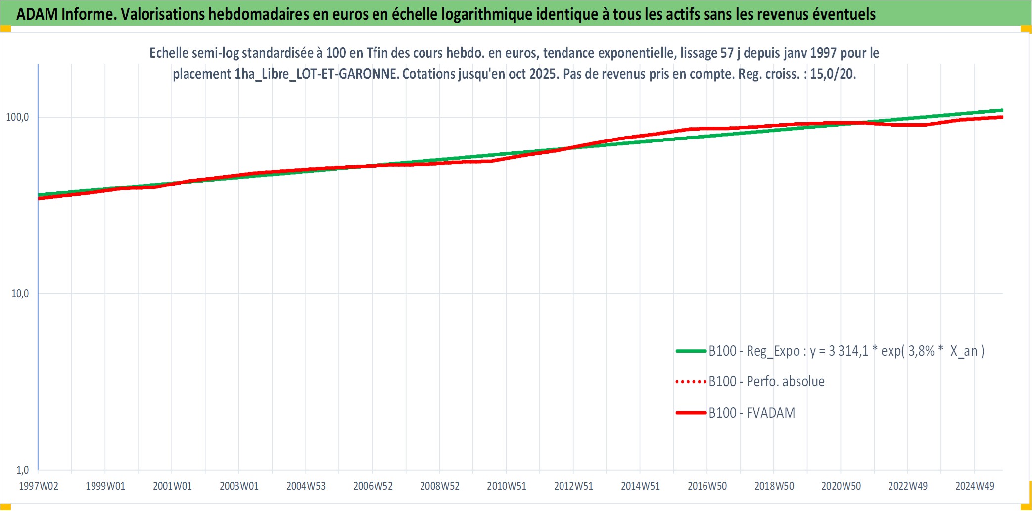 Site dédié aux investisseursPage dédiée sur site financeAnalyse des valorisations hebdomadaires de l'actif 1ha_Libre_LOT-ET-GARONNE. Cet actif est cote en EUR. Les valorisations couvrent les semaines 1997W01 a 2025W40. Les fermages de ce bien foncier sont pris egaux a 2,5% annuels de la valeur venale du bien.
