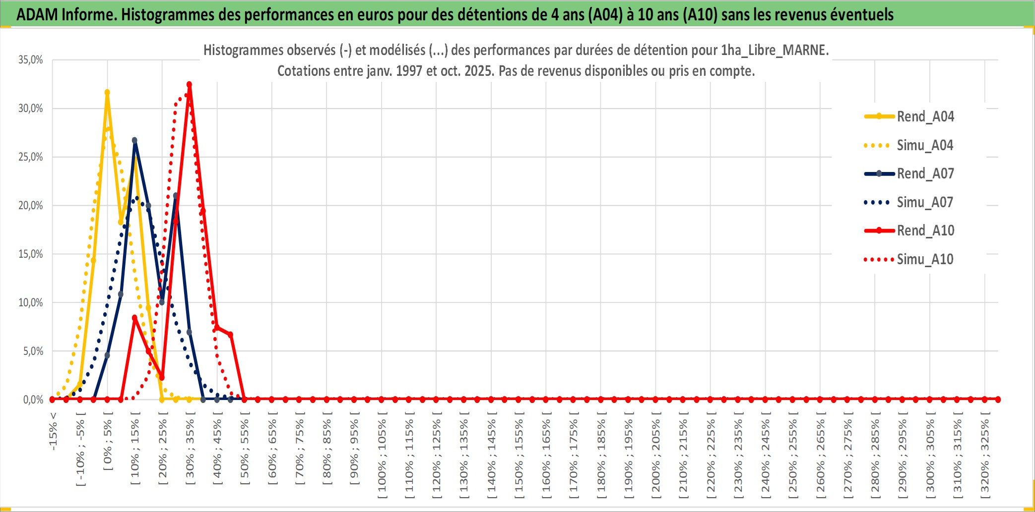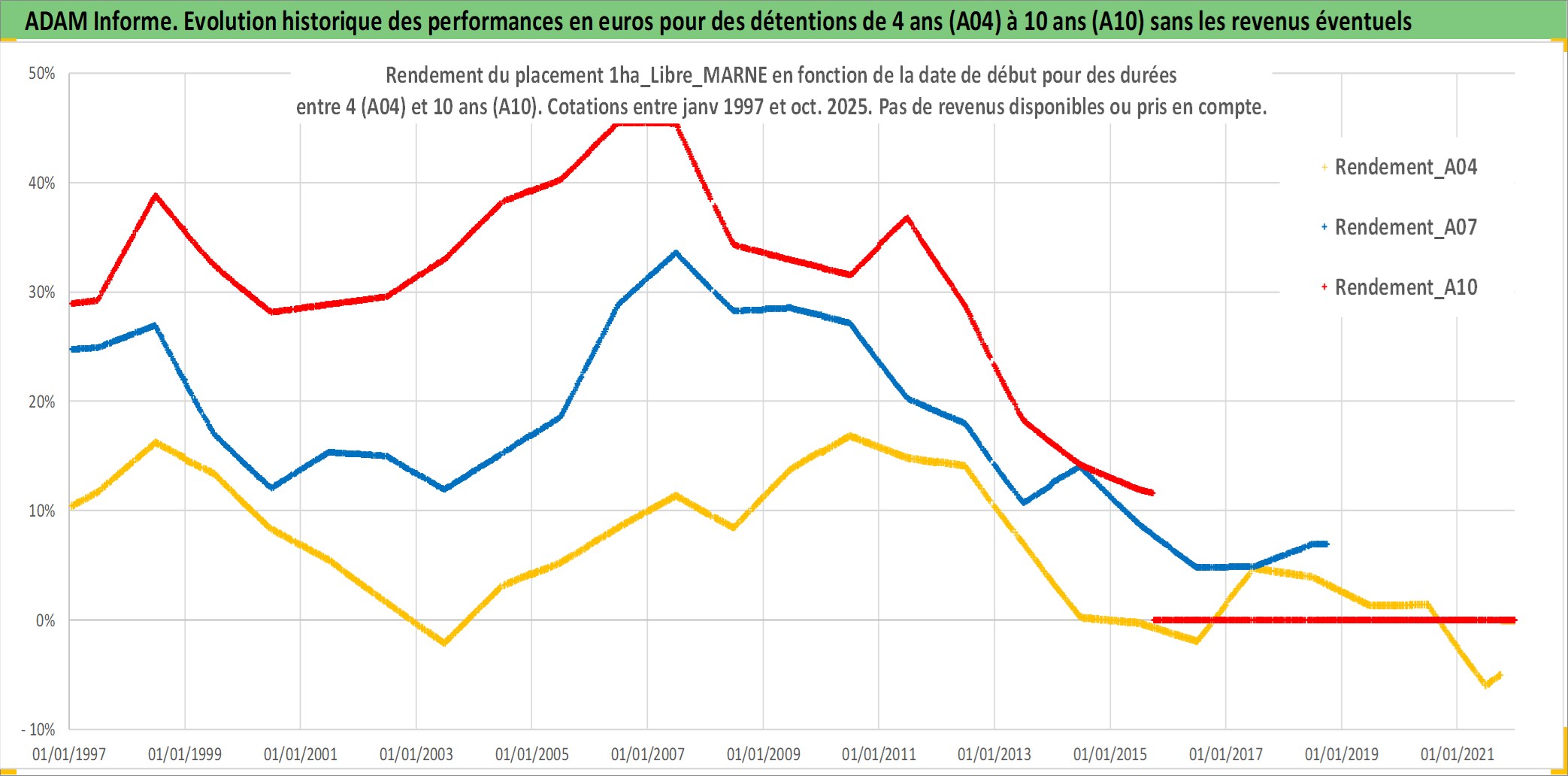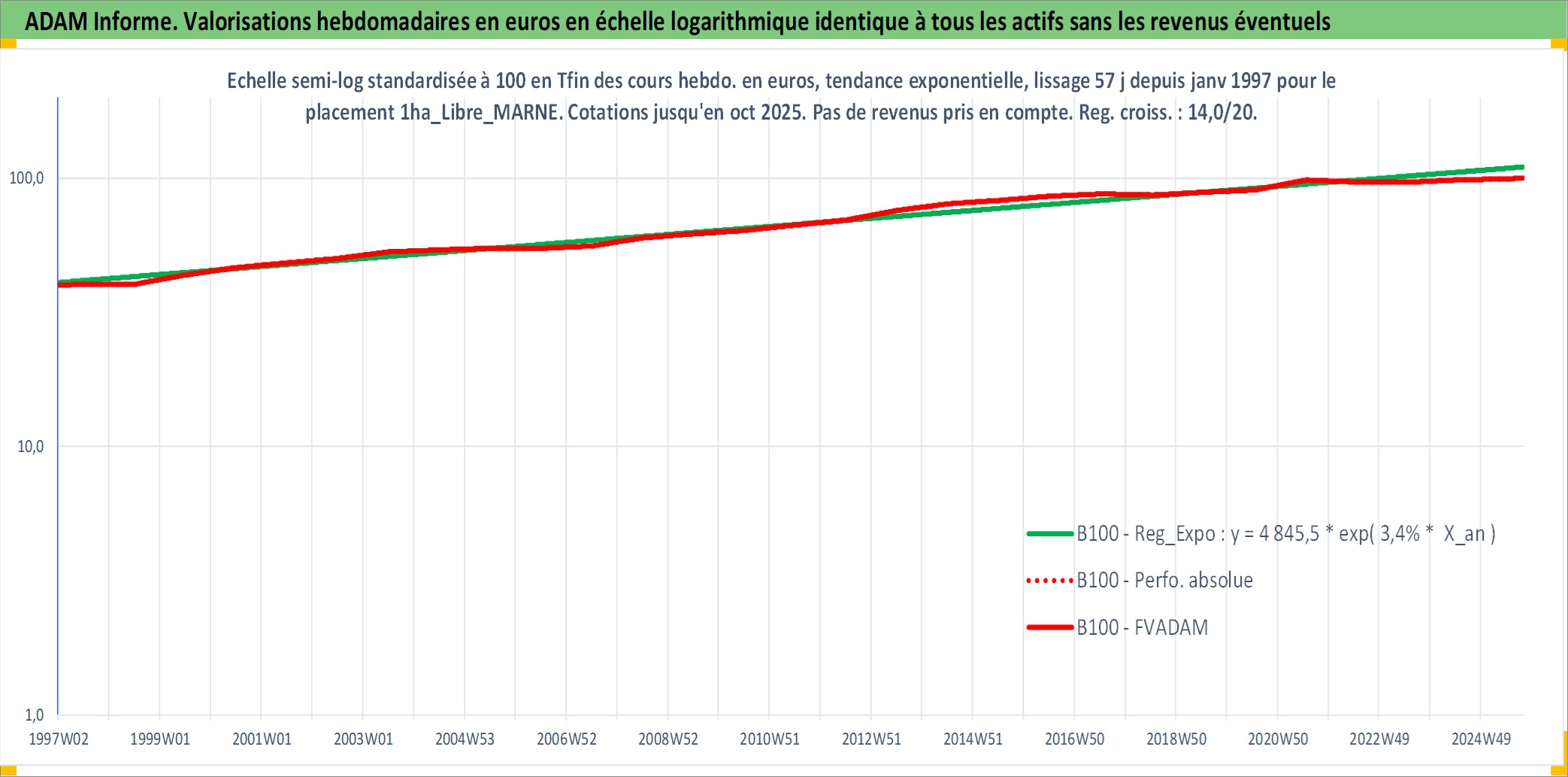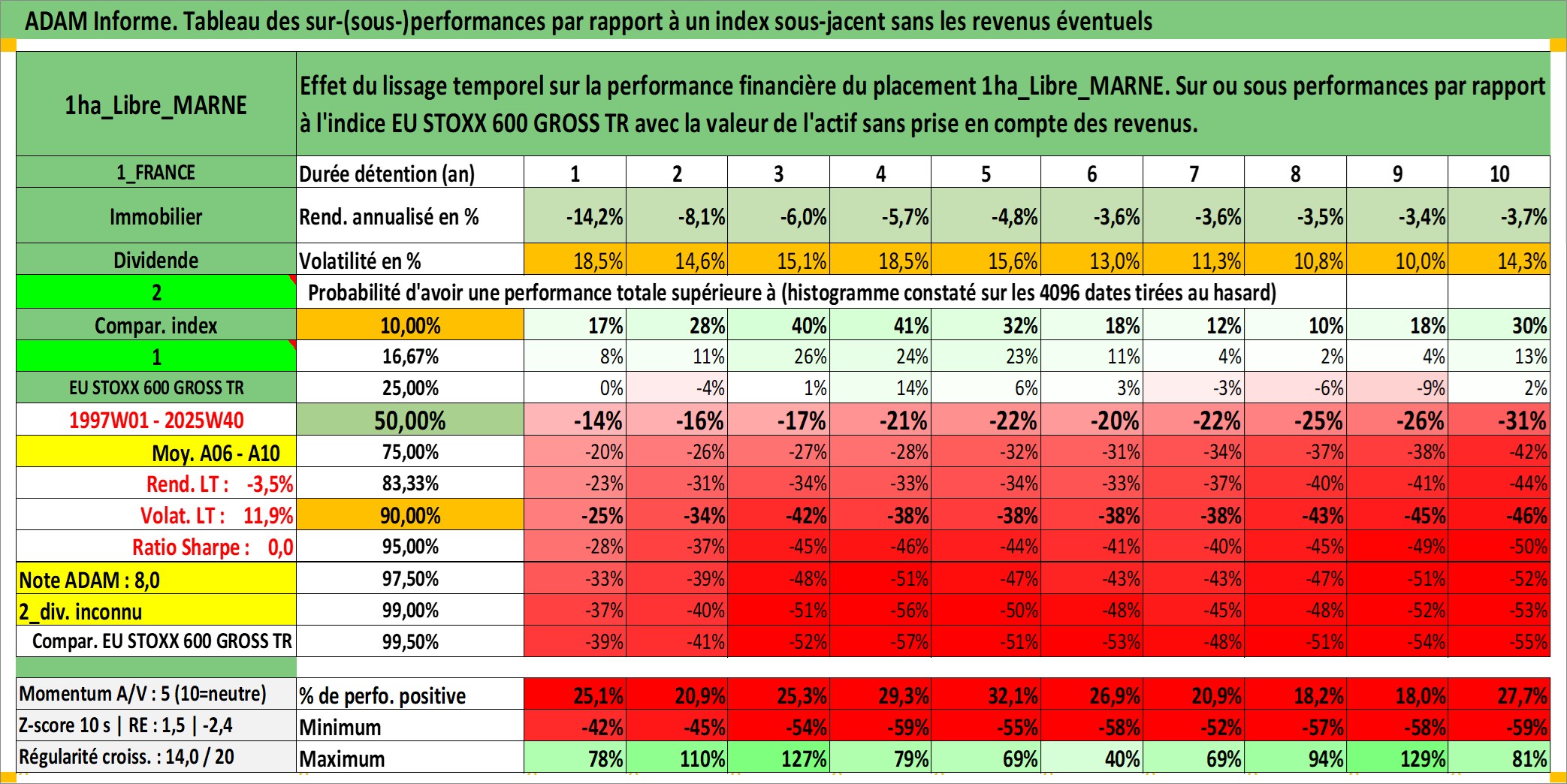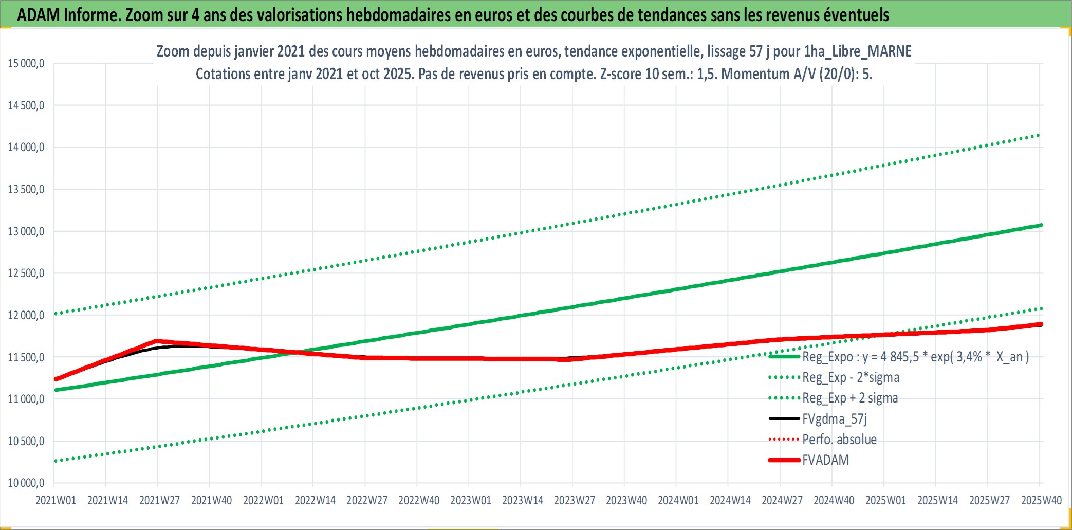 Site dédié aux investisseursPage dédiée sur site financeAnalyse des valorisations hebdomadaires de l'actif 1ha_Libre_MARNE. Cet actif est cote en EUR. Les valorisations couvrent les semaines 1997W01 a 2025W40. Les fermages de ce bien foncier sont pris egaux a 2,5% annuels de la valeur venale du bien.