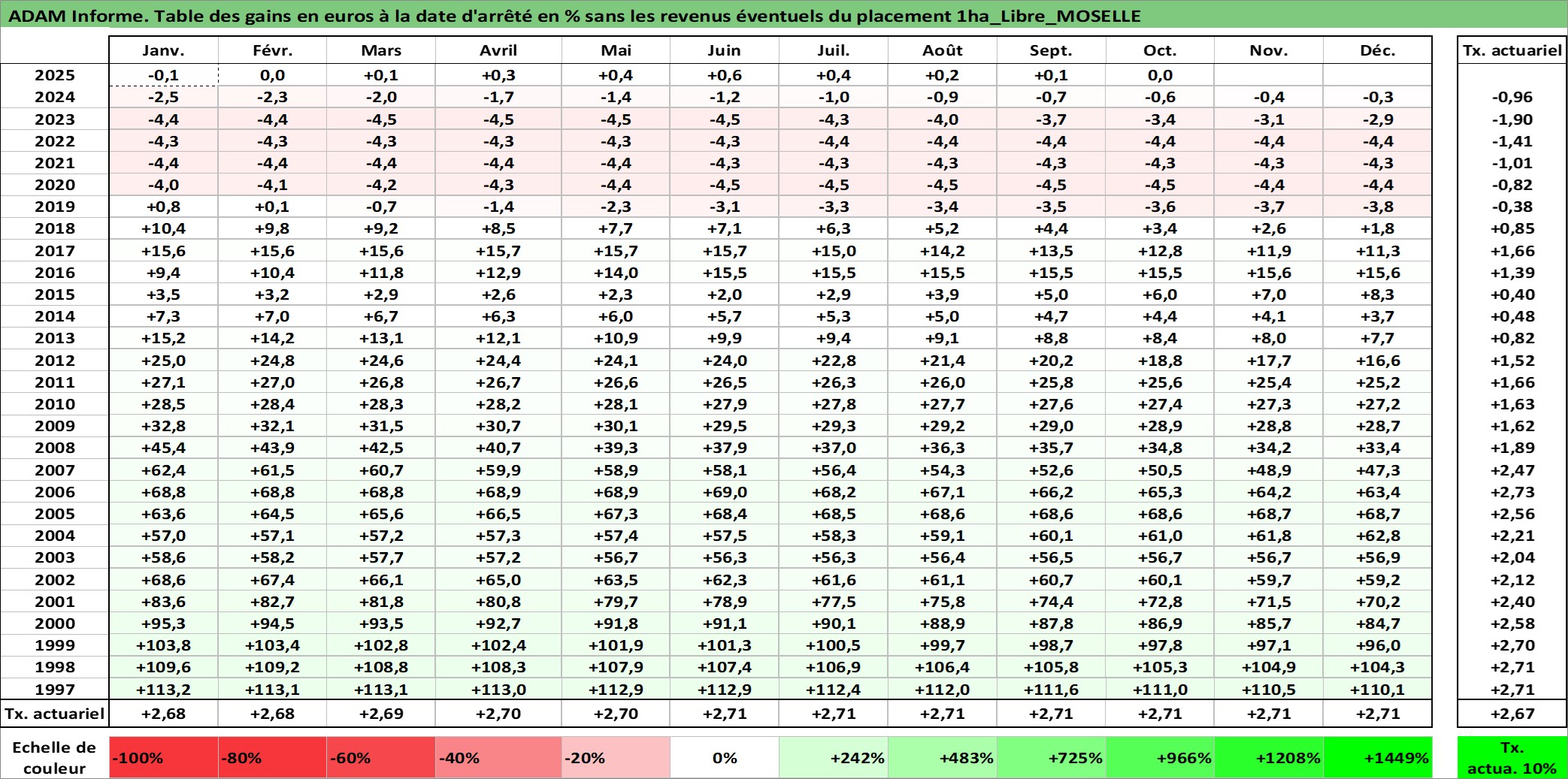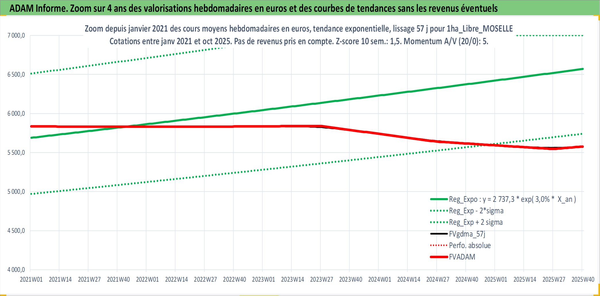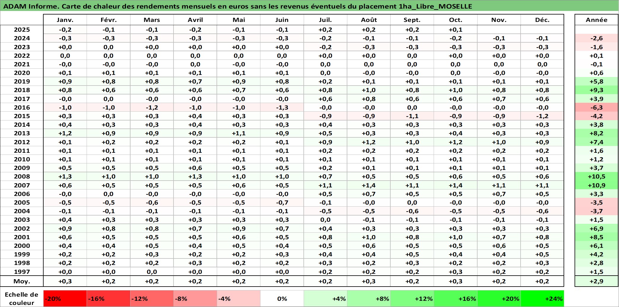 Site dédié aux investisseursPage dédiée sur site financeAnalyse des valorisations hebdomadaires de l'actif 1ha_Libre_MOSELLE. Cet actif est cote en EUR. Les valorisations couvrent les semaines 1997W01 a 2025W40. Les fermages de ce bien foncier sont pris egaux a 2,5% annuels de la valeur venale du bien.