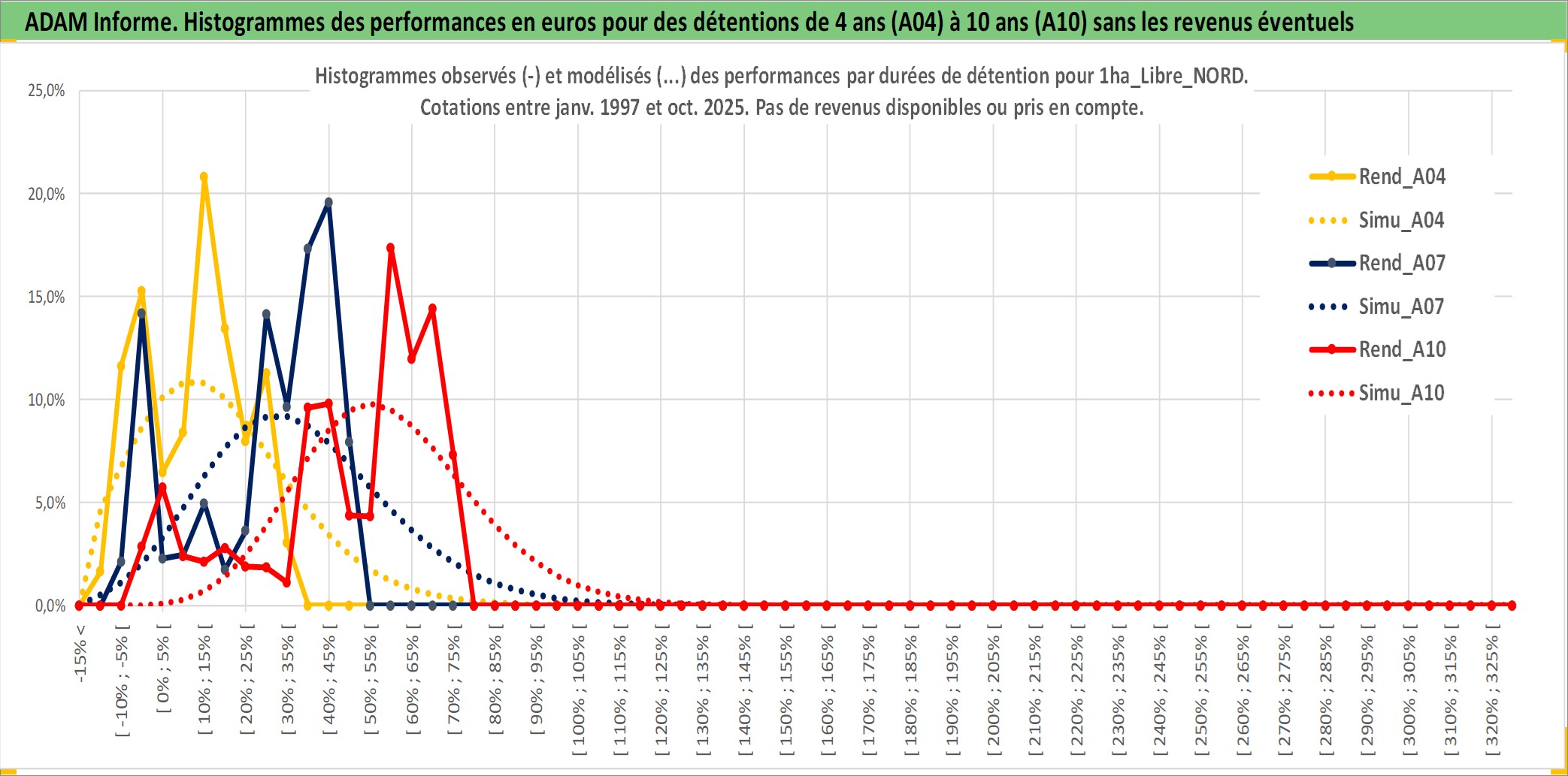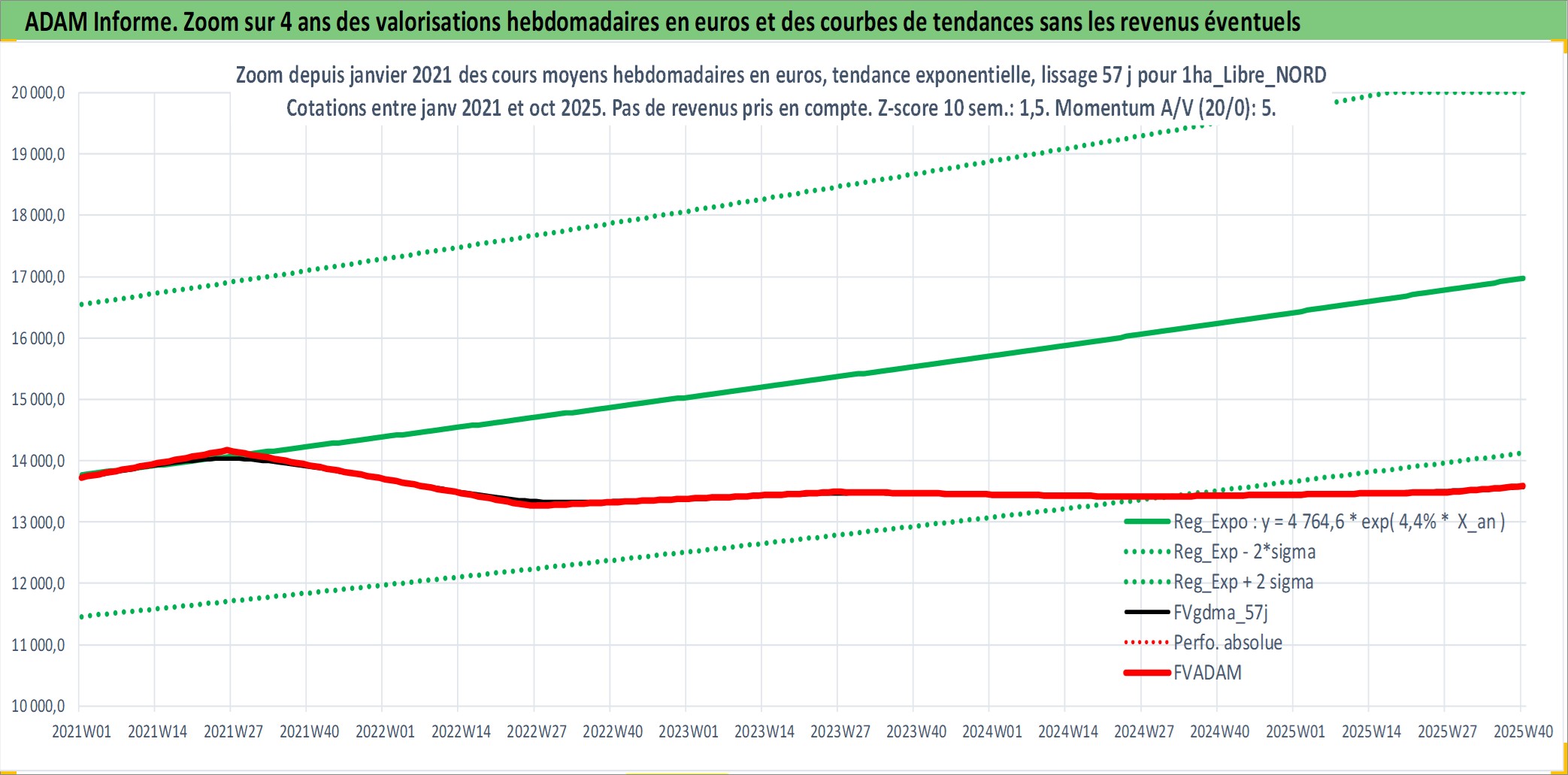 Site dédié aux investisseursPage dédiée sur site financeAnalyse des valorisations hebdomadaires de l'actif 1ha_Libre_NORD. Cet actif est cote en EUR. Les valorisations couvrent les semaines 1997W01 a 2025W40. Les fermages de ce bien foncier sont pris egaux a 2,5% annuels de la valeur venale du bien.