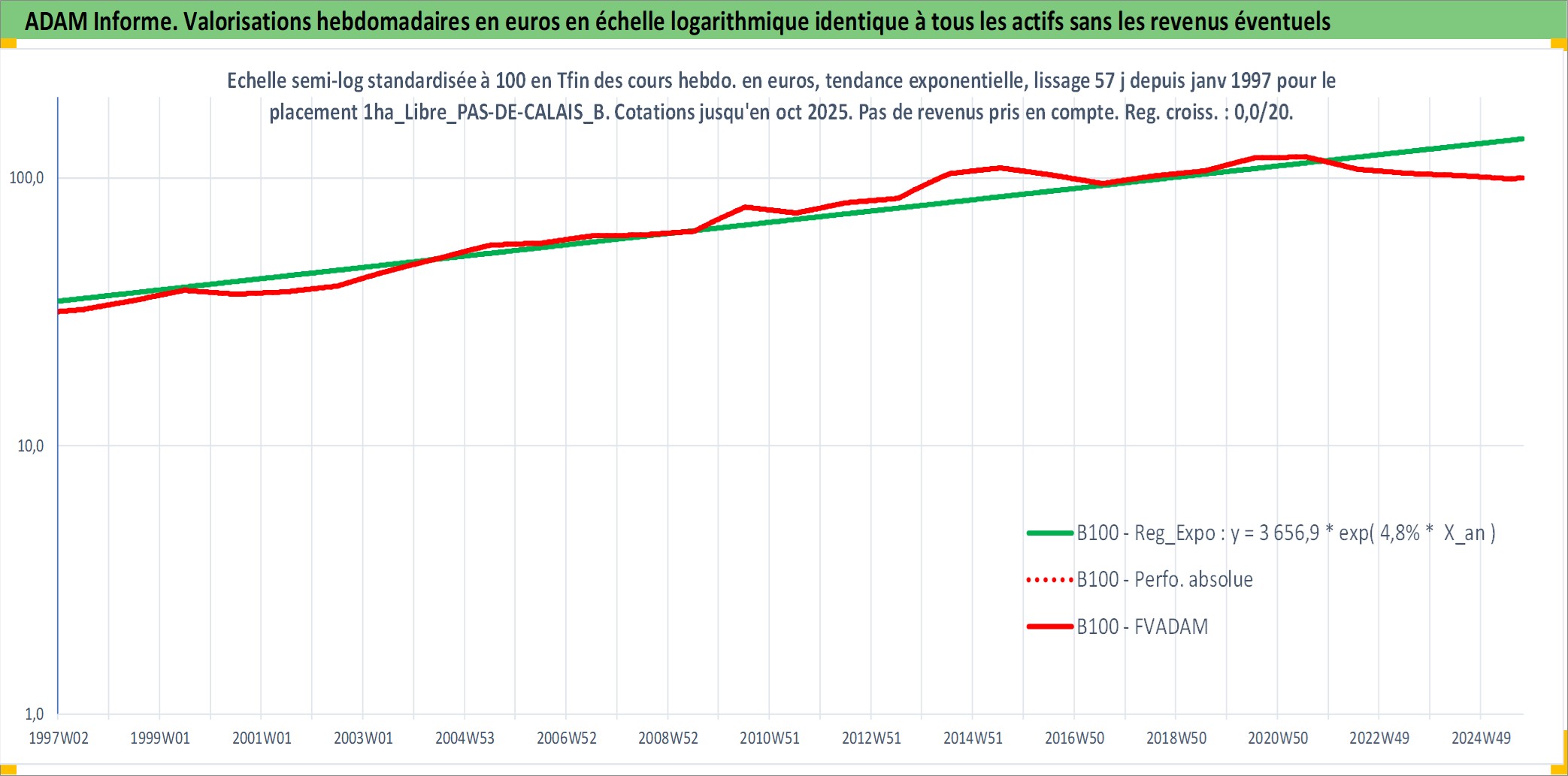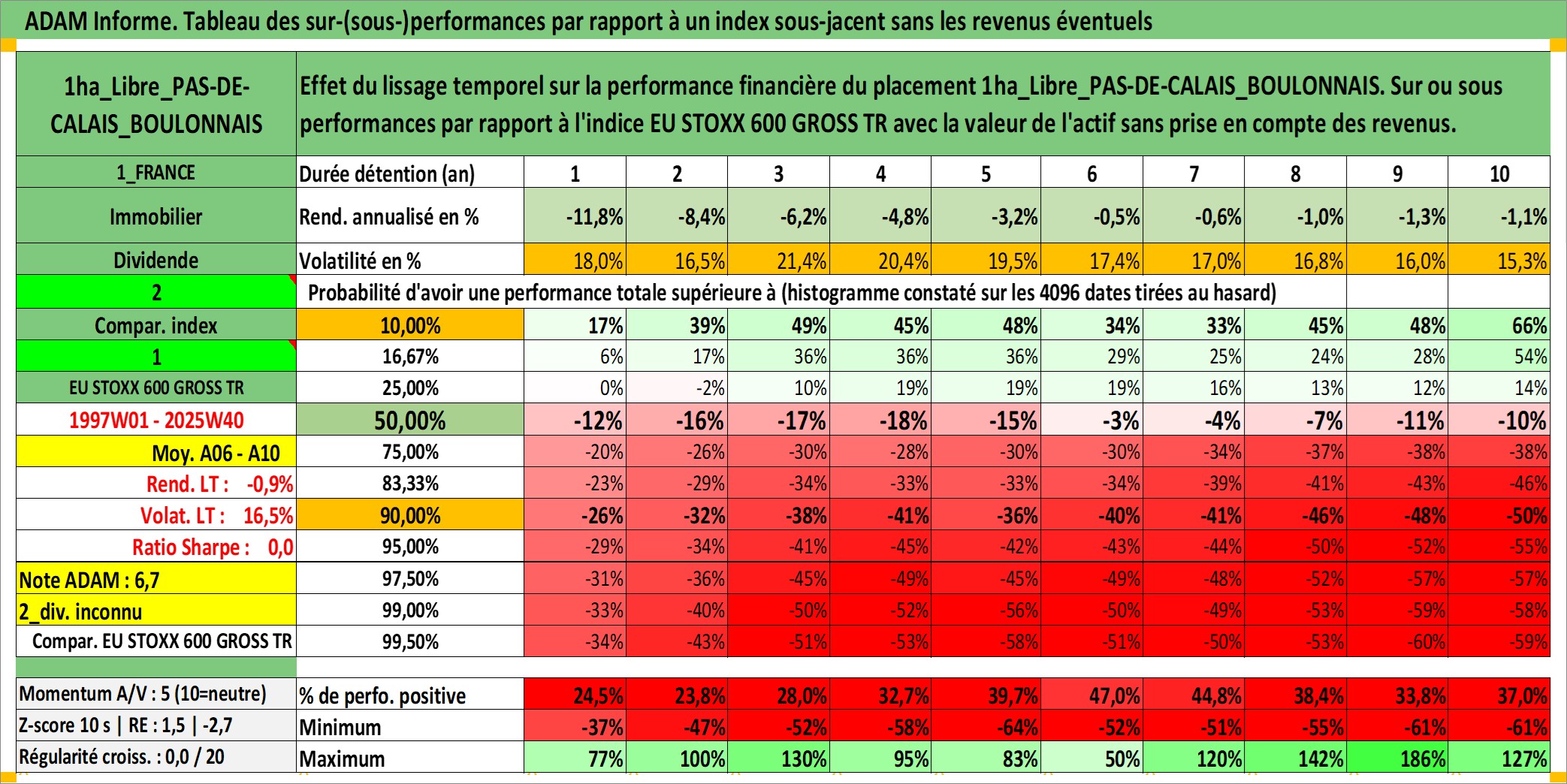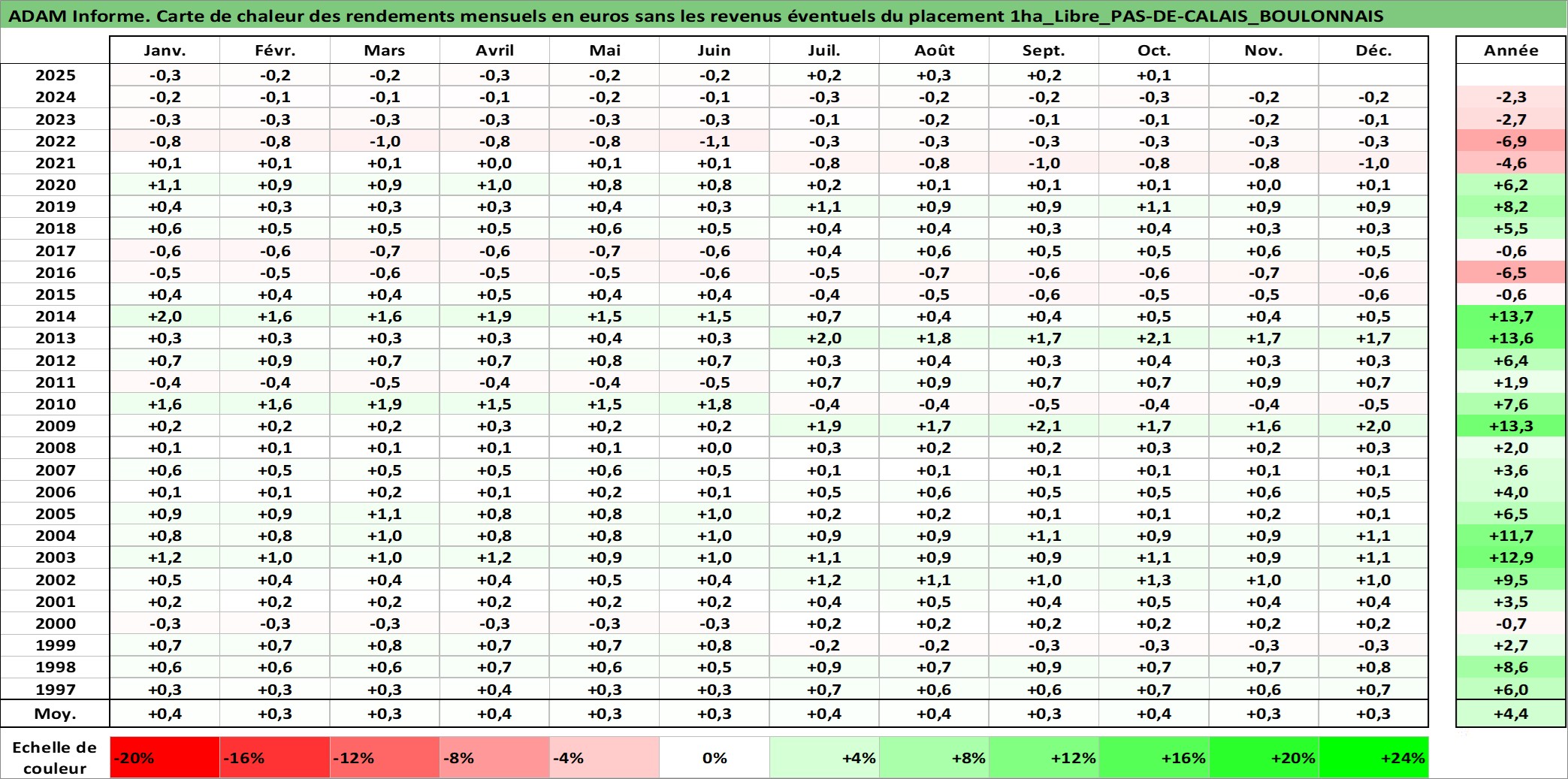 Site dédié aux investisseursPage dédiée sur site financeAnalyse des valorisations hebdomadaires de l'actif 1ha_Libre_PAS-DE-CALAIS_BOULONNAIS. Cet actif est cote en EUR. Les valorisations couvrent les semaines 1997W01 a 2025W40. Les fermages de ce bien foncier sont pris egaux a 2,5% annuels de la valeur venale du bien.