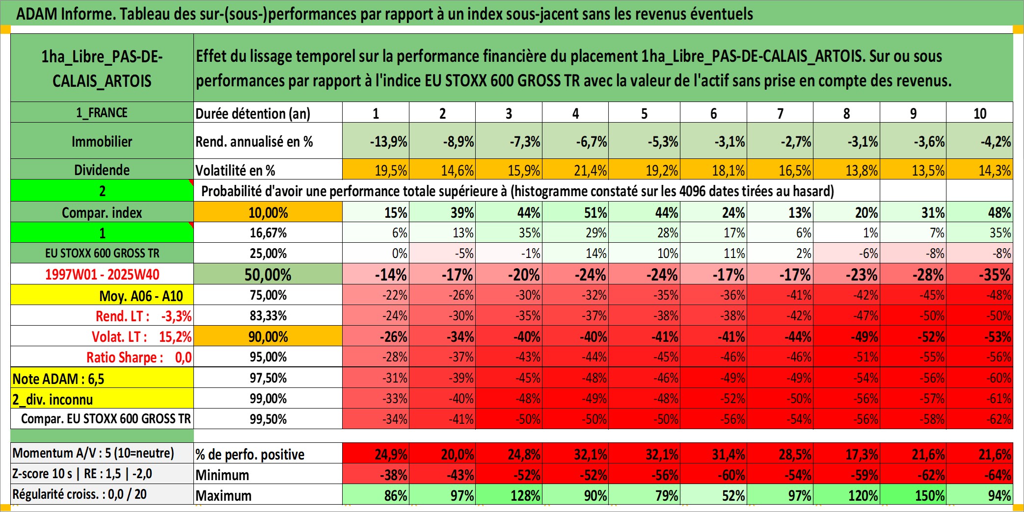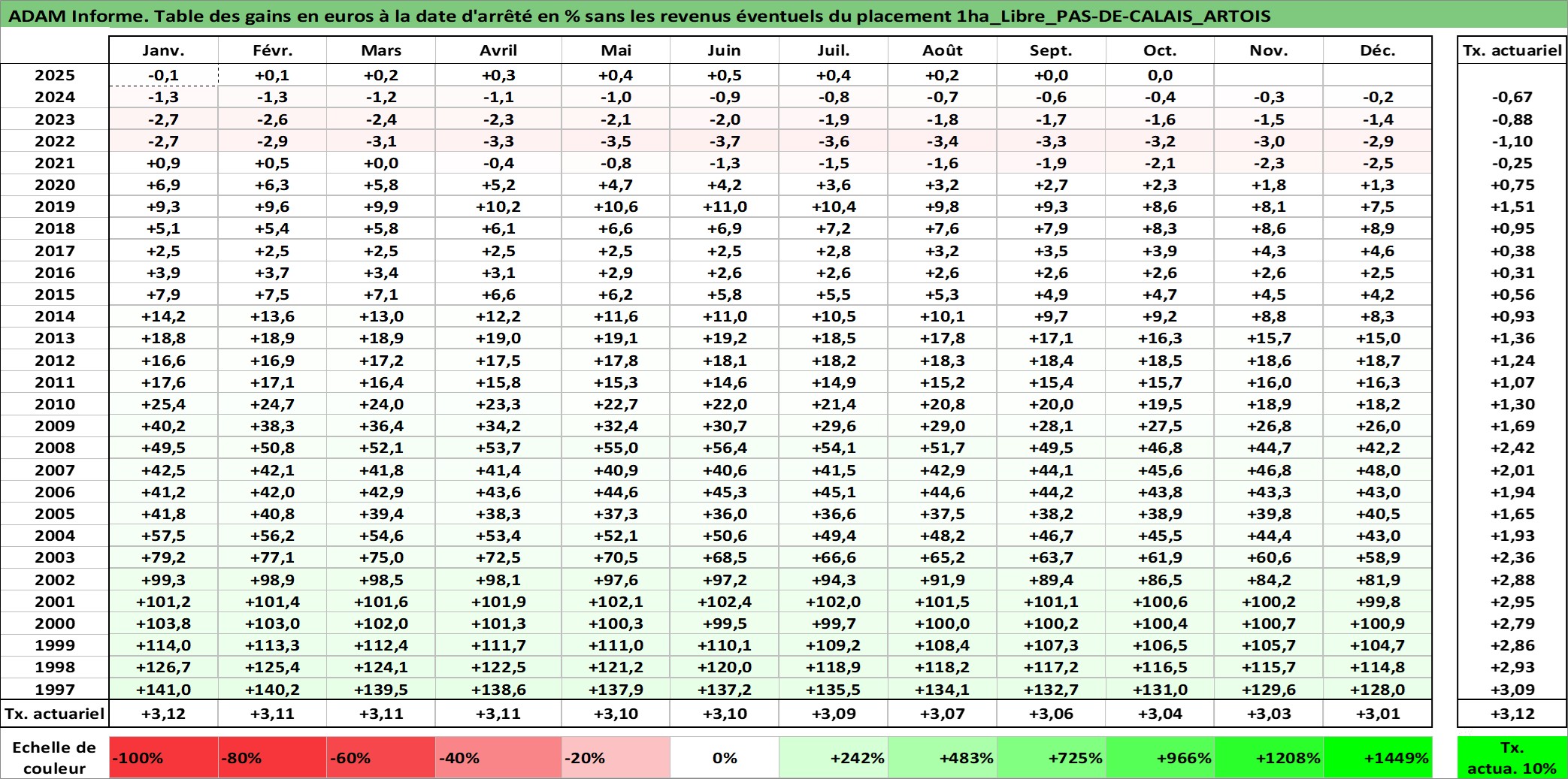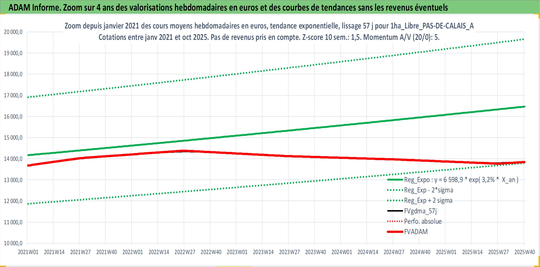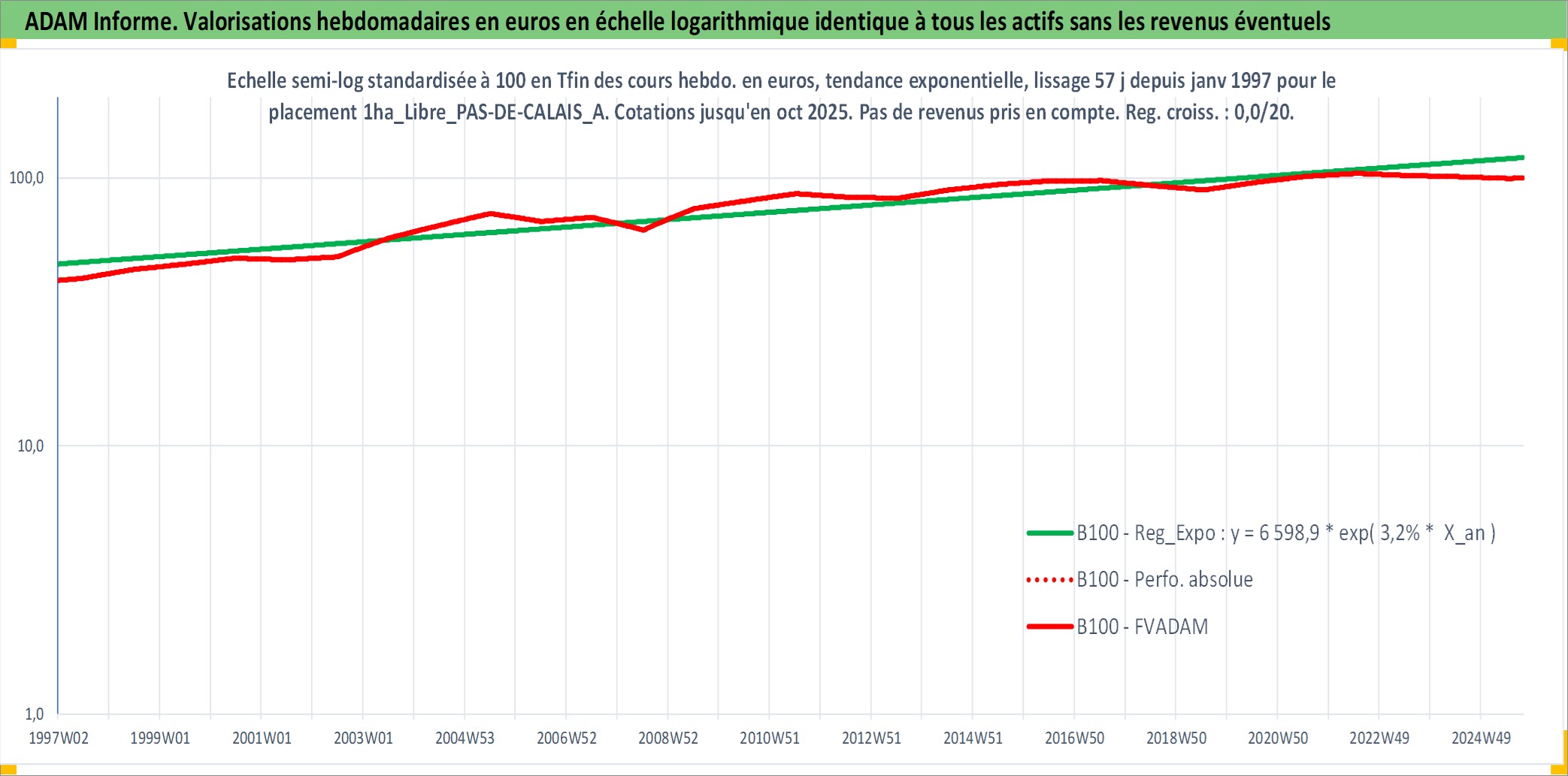 Site dédié aux investisseursPage dédiée sur site financeAnalyse des valorisations hebdomadaires de l'actif 1ha_Libre_PAS-DE-CALAIS_ARTOIS. Cet actif est cote en EUR. Les valorisations couvrent les semaines 1997W01 a 2025W40. Les fermages de ce bien foncier sont pris egaux a 2,5% annuels de la valeur venale du bien.