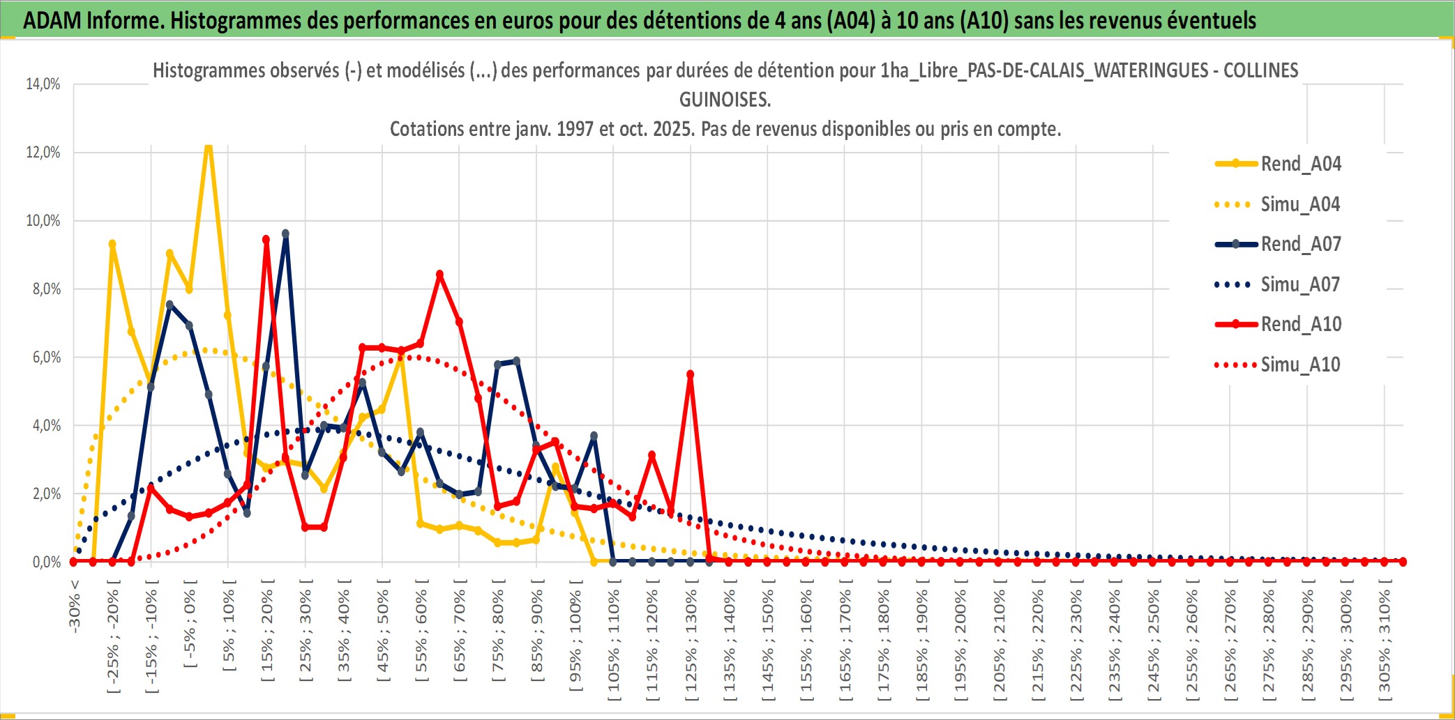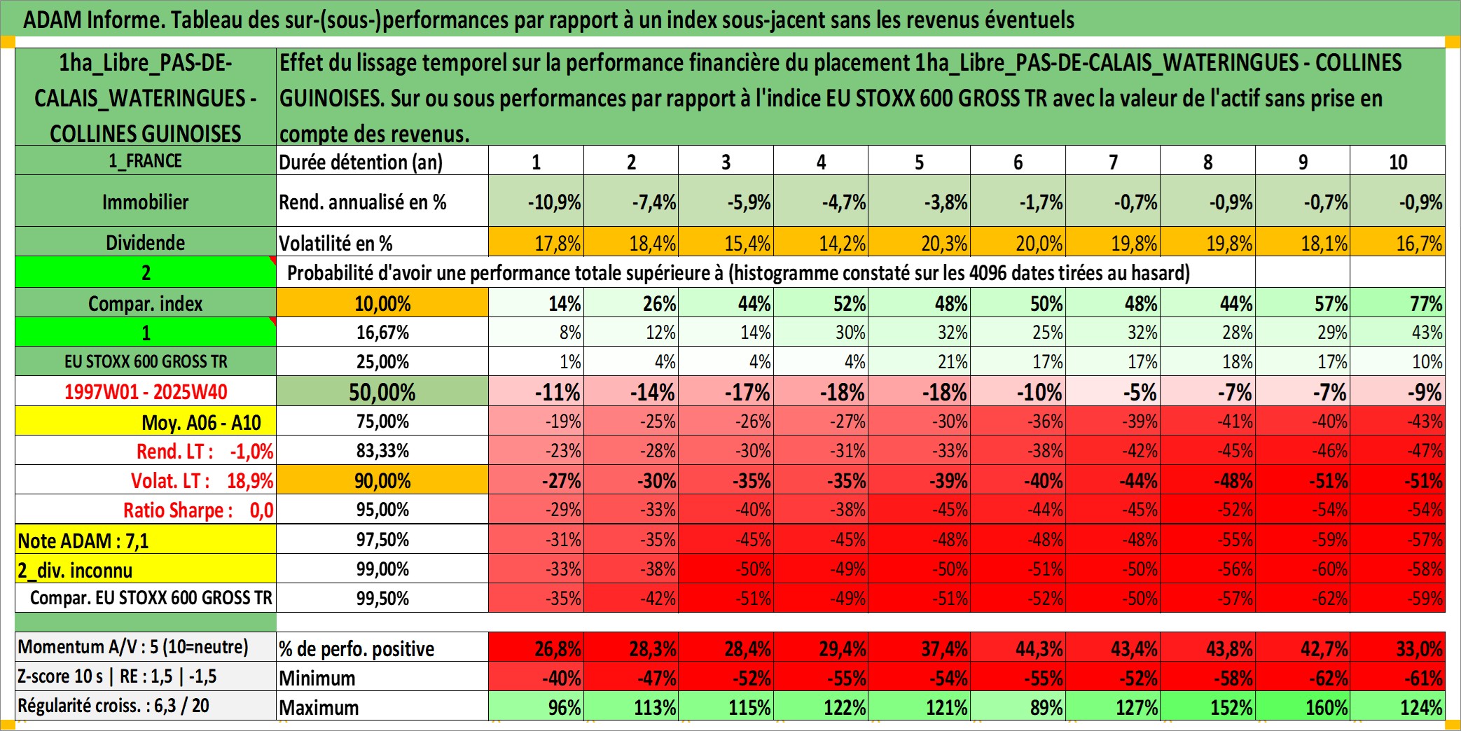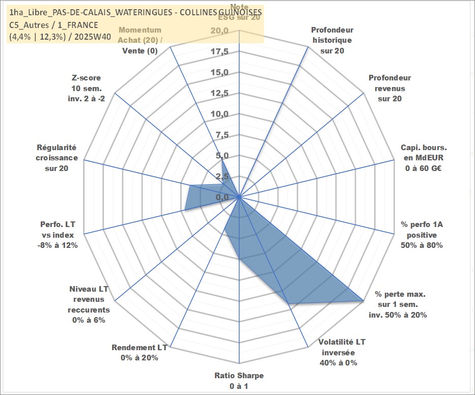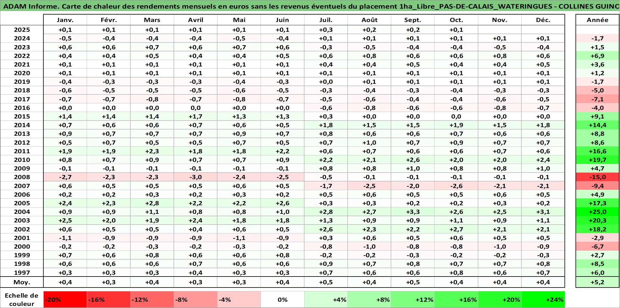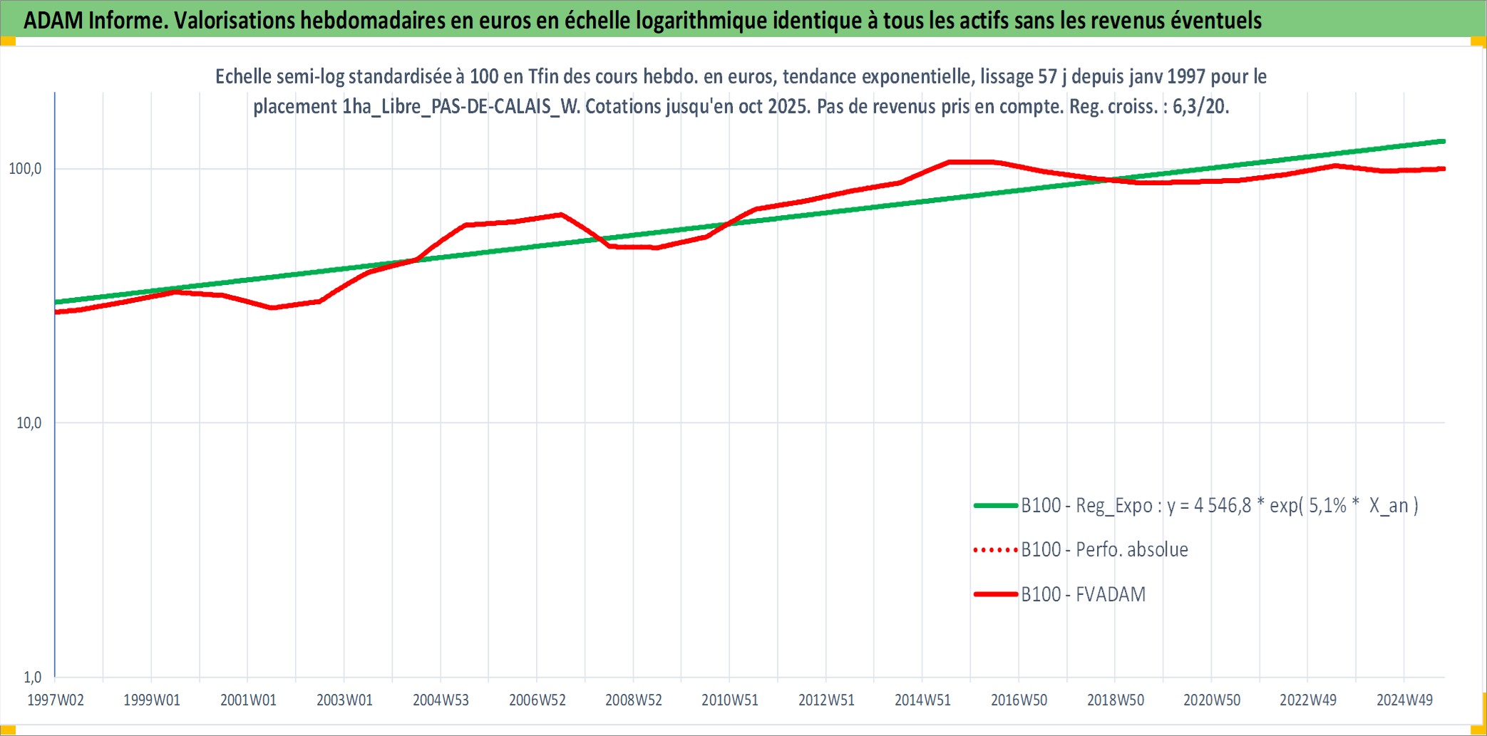 Site dédié aux investisseursPage dédiée sur site financeAnalyse des valorisations hebdomadaires de l'actif 1ha_Libre_PAS-DE-CALAIS_WATERINGUES - COLLINES GUINOISES. Cet actif est cote en EUR. Les valorisations couvrent les semaines 1997W01 a 2025W40. Les fermages de ce bien foncier sont pris egaux a 2,5% annuels de la valeur venale du bien.