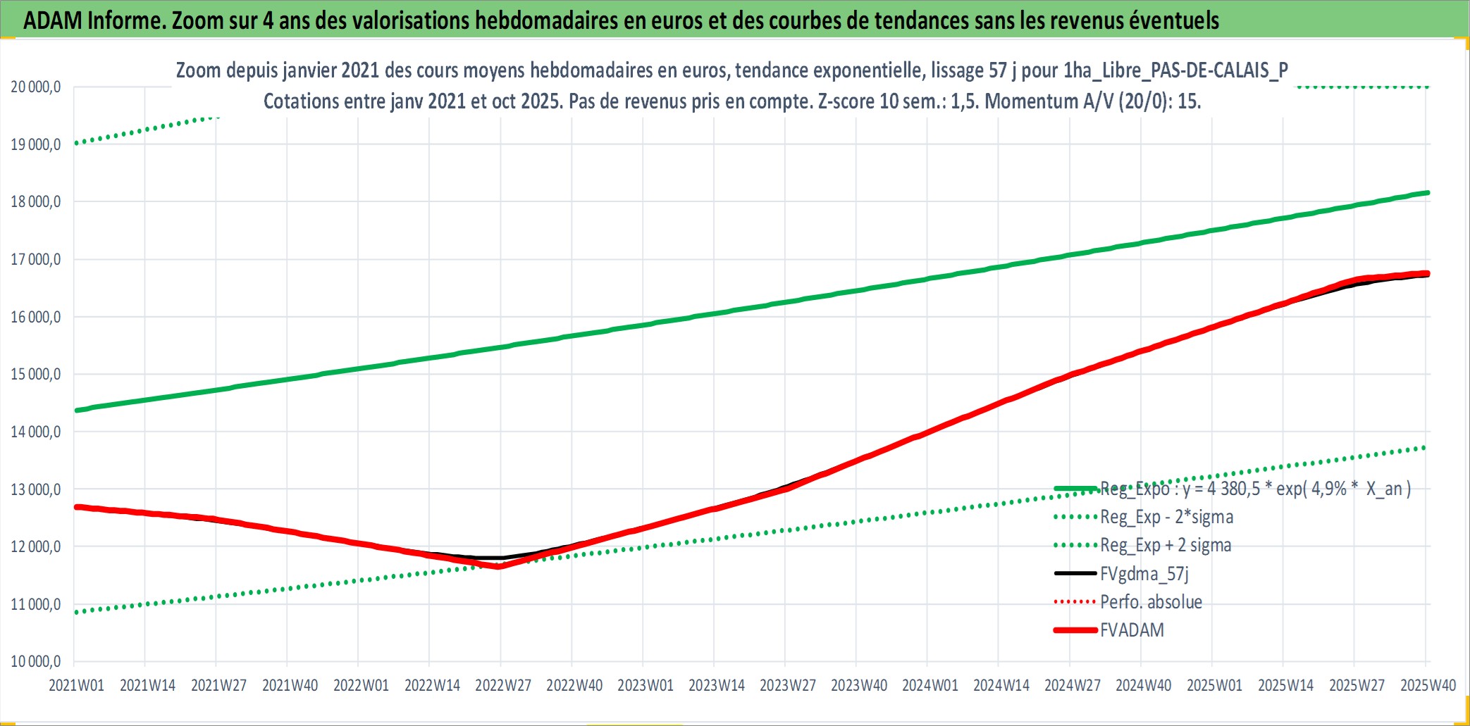 Site dédié aux investisseursPage dédiée sur site financeAnalyse des valorisations hebdomadaires de l'actif 1ha_Libre_PAS-DE-CALAIS_PAYS AIRE - PLAINE DE LA LYS - BETHUNOIS. Cet actif est cote en EUR. Les valorisations couvrent les semaines 1997W01 a 2025W40. Les fermages de ce bien foncier sont pris egaux a 2,5% annuels de la valeur venale du bien.