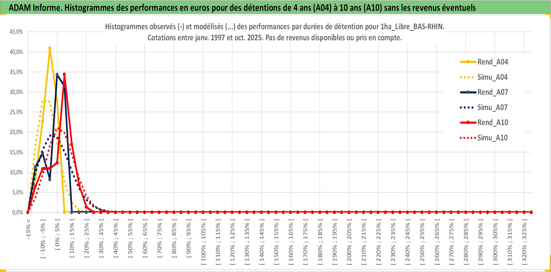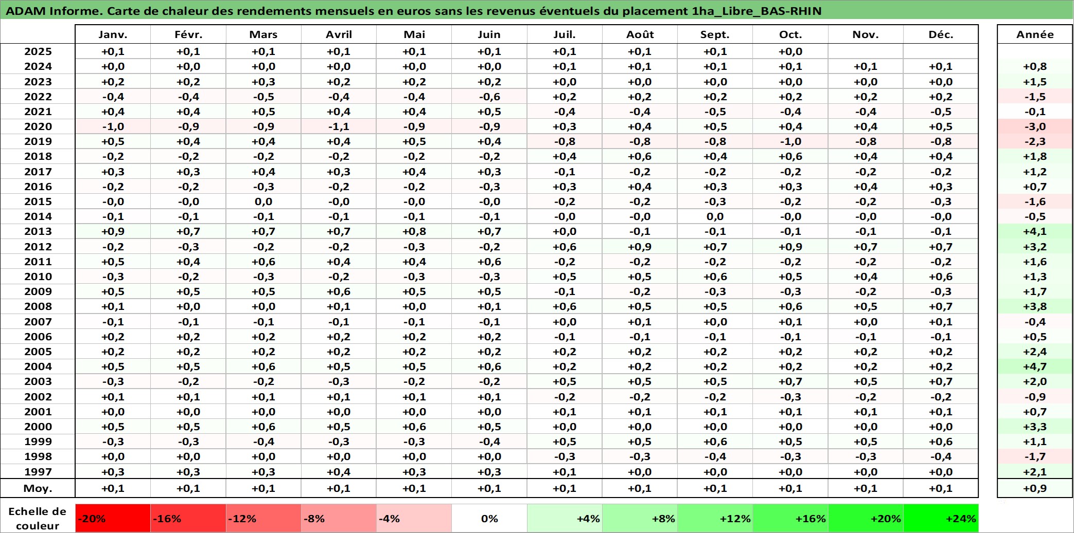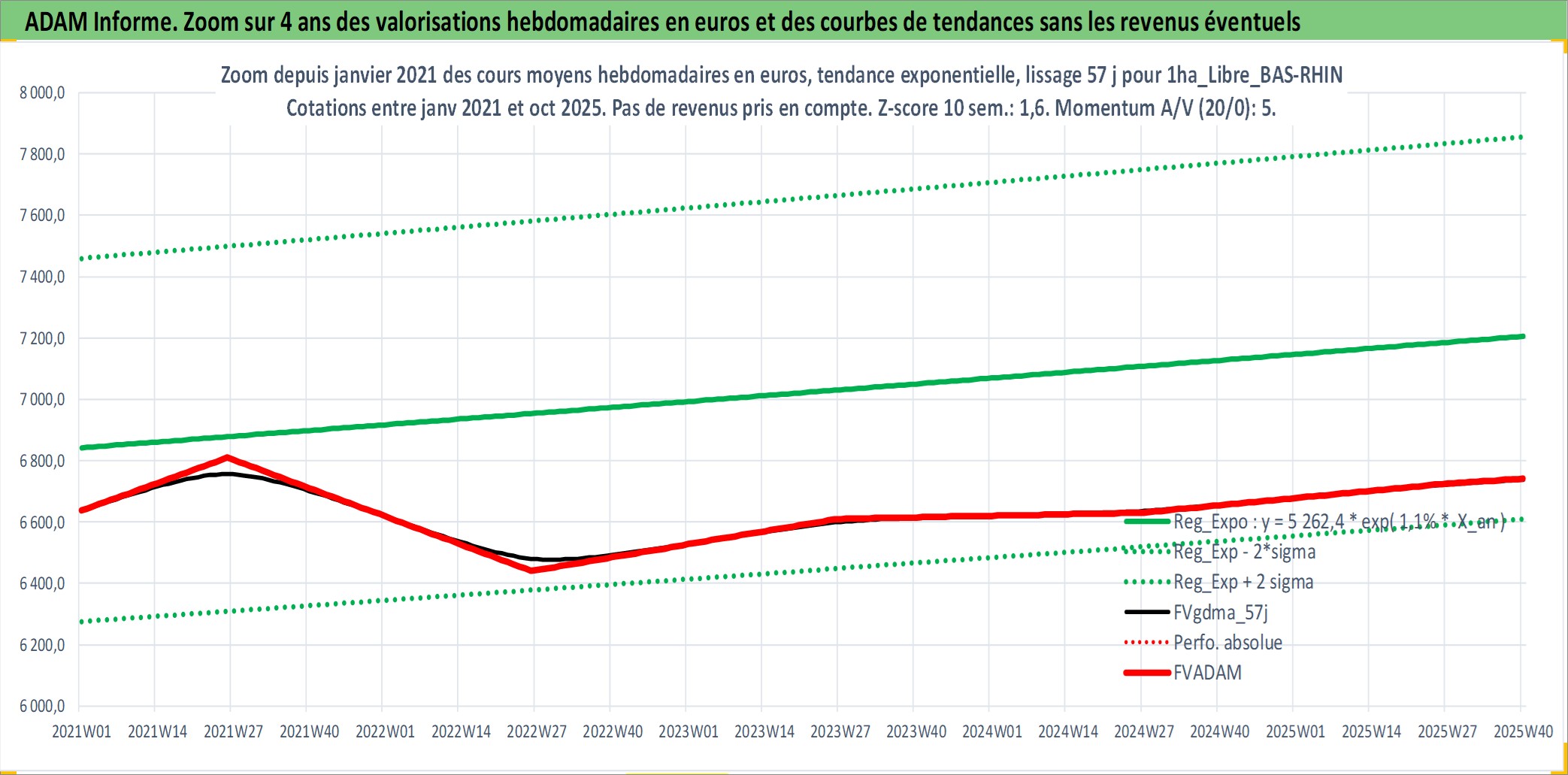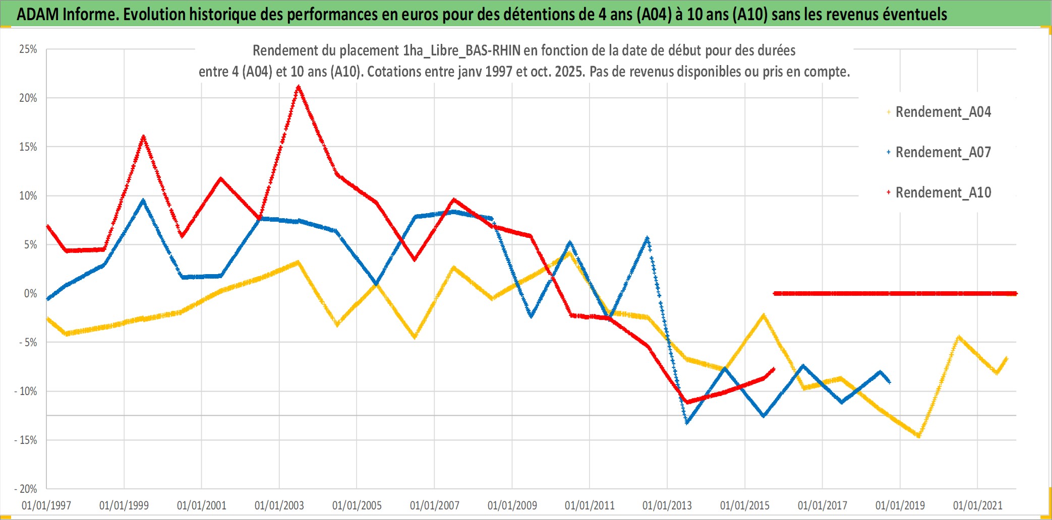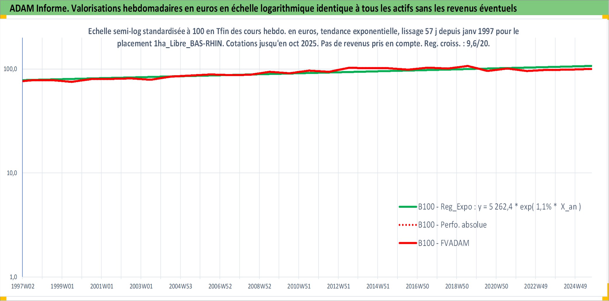 Site dédié aux investisseursPage dédiée sur site financeAnalyse des valorisations hebdomadaires de l'actif 1ha_Libre_BAS-RHIN. Cet actif est cote en EUR. Les valorisations couvrent les semaines 1997W01 a 2025W40. Les fermages de ce bien foncier sont pris egaux a 2,5% annuels de la valeur venale du bien.