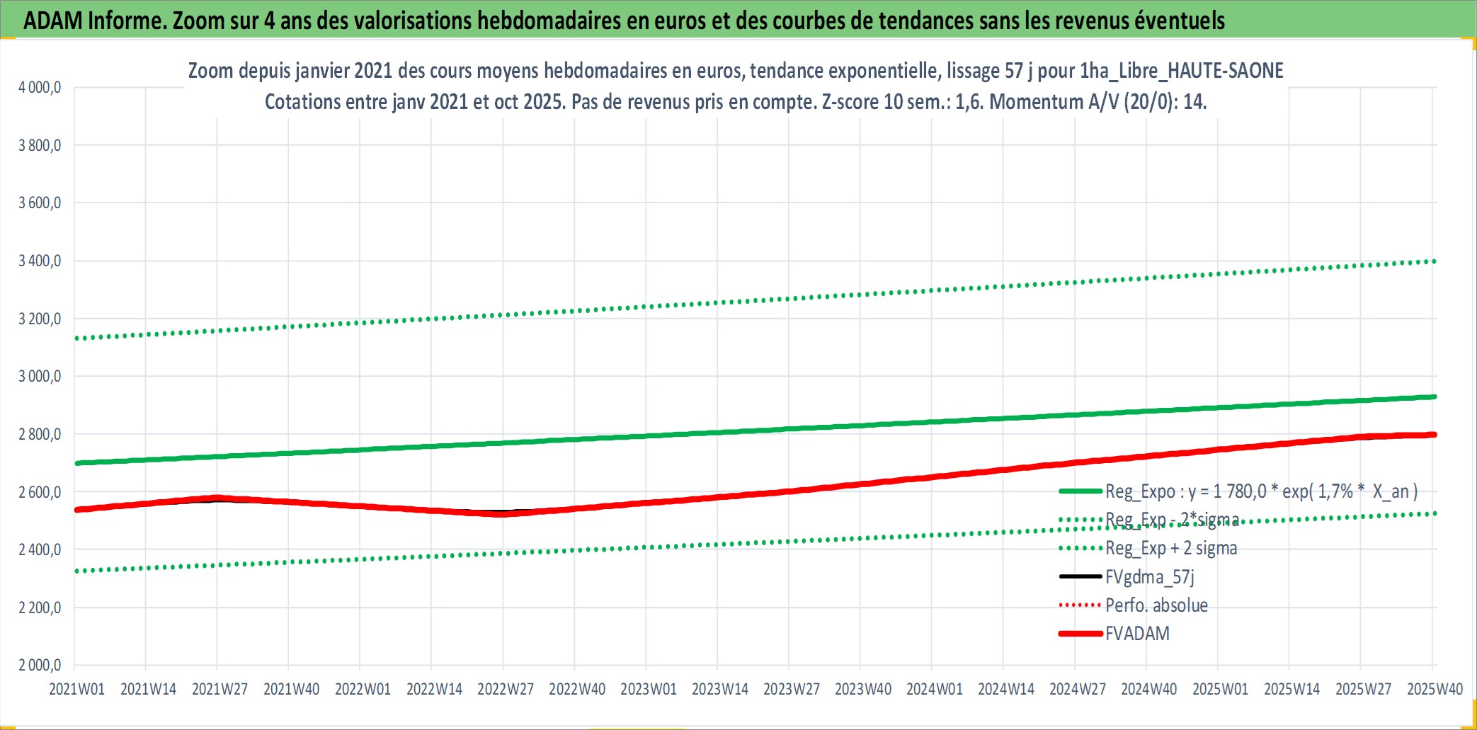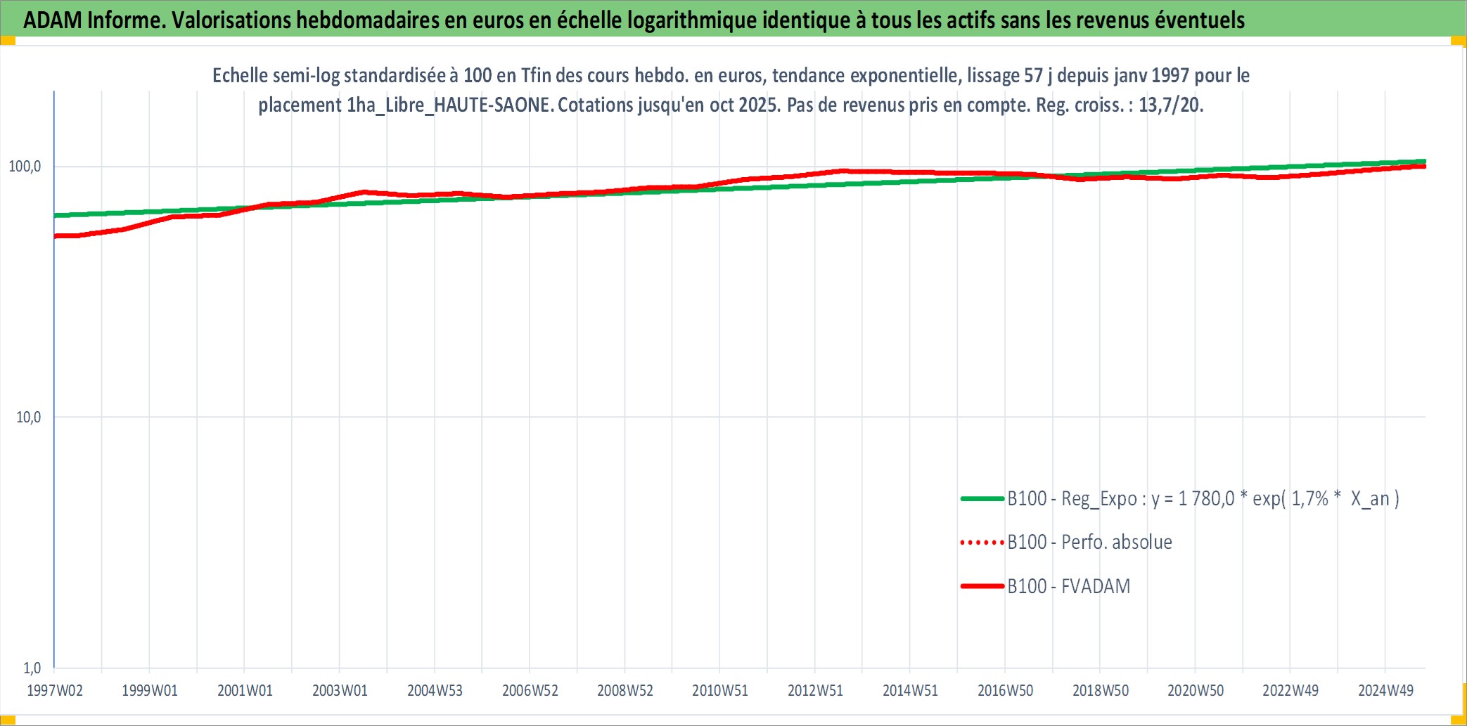 Site dédié aux investisseursPage dédiée sur site financeAnalyse des valorisations hebdomadaires de l'actif 1ha_Libre_HAUTE-SAONE. Cet actif est cote en EUR. Les valorisations couvrent les semaines 1997W01 a 2025W40. Les fermages de ce bien foncier sont pris egaux a 2,5% annuels de la valeur venale du bien.