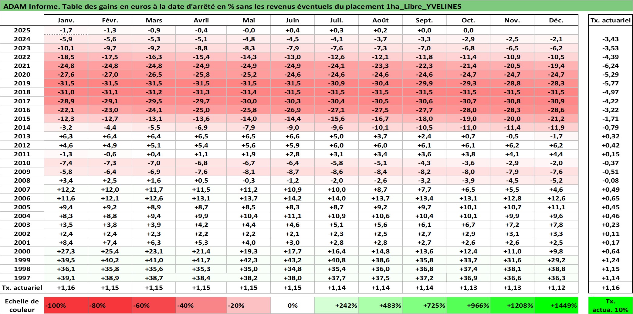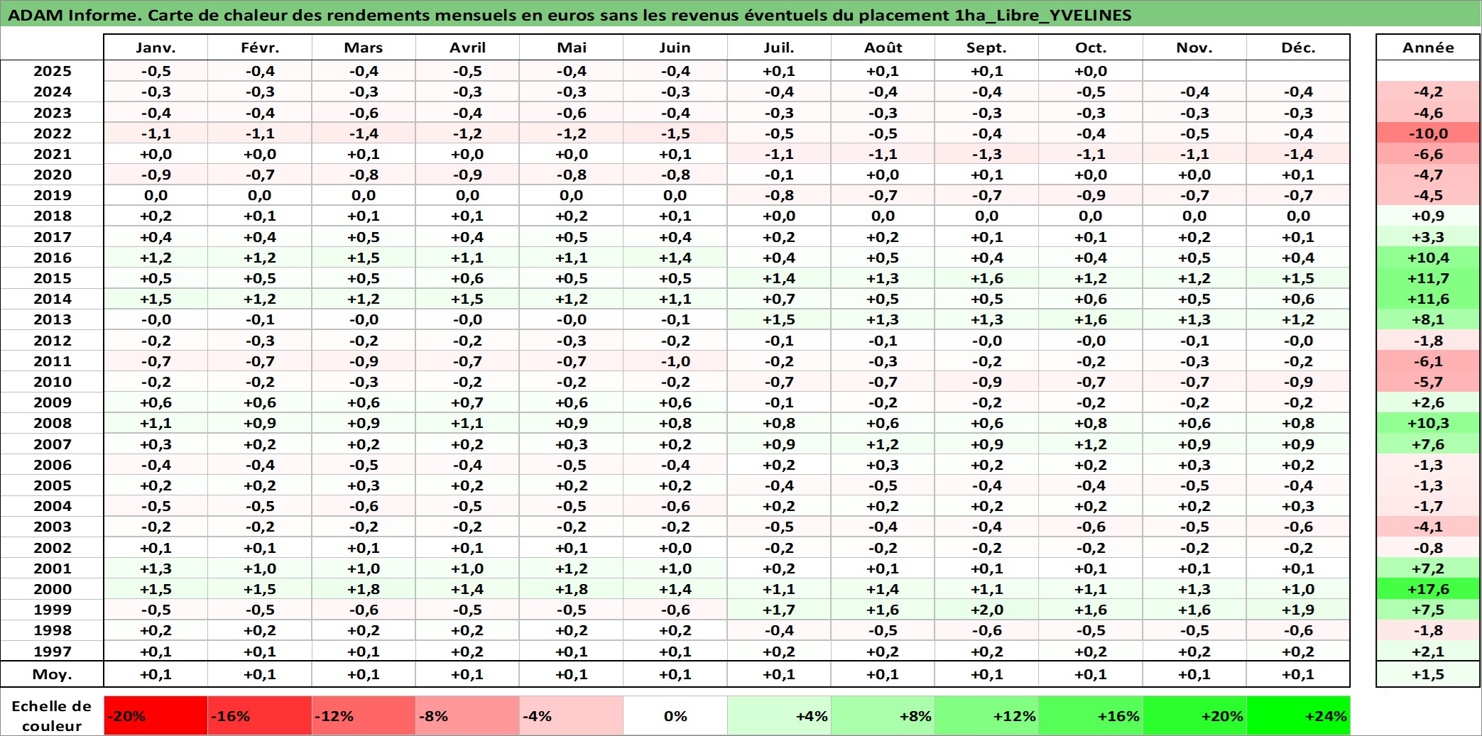 Site dédié aux investisseursPage dédiée sur site financeAnalyse des valorisations hebdomadaires de l'actif 1ha_Libre_YVELINES. Cet actif est cote en EUR. Les valorisations couvrent les semaines 1997W01 a 2025W40. Les fermages de ce bien foncier sont pris egaux a 2,5% annuels de la valeur venale du bien.