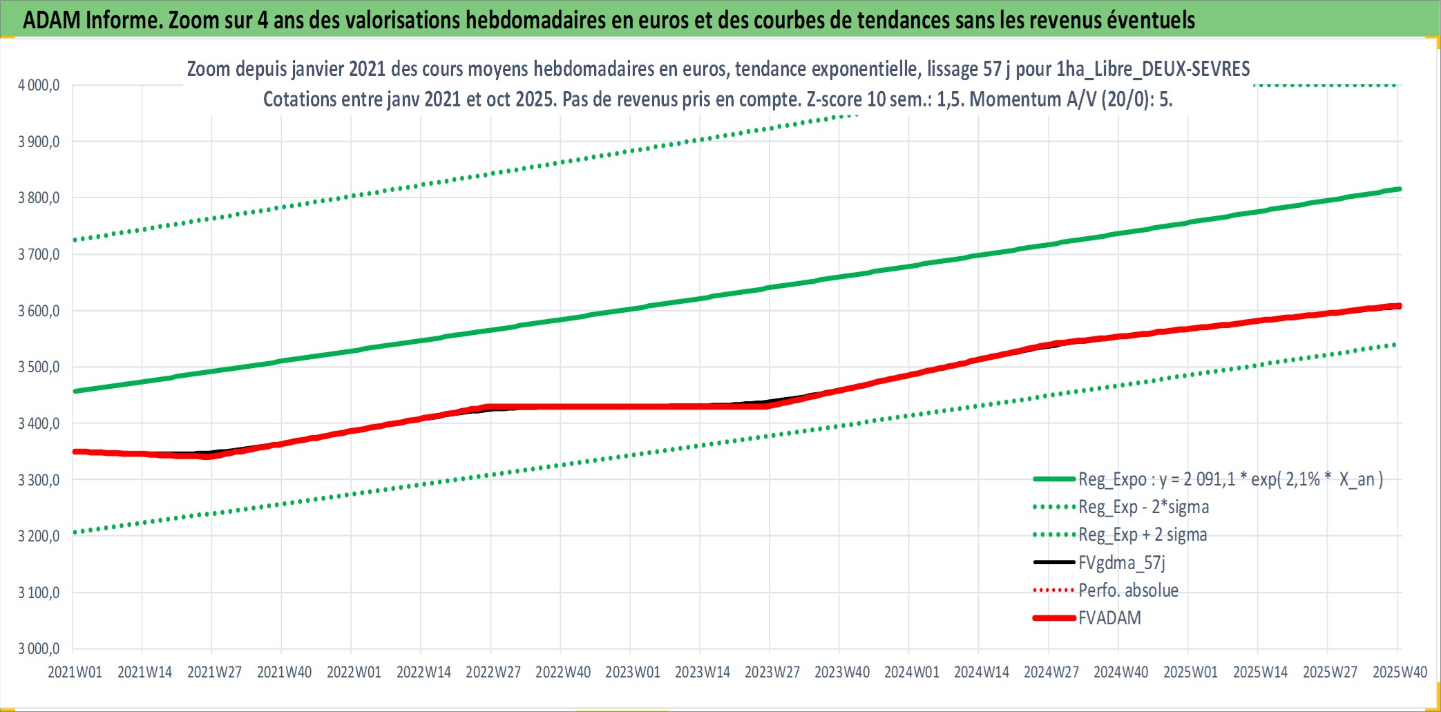 Site dédié aux investisseursPage dédiée sur site financeAnalyse des valorisations hebdomadaires de l'actif 1ha_Libre_DEUX-SEVRES. Cet actif est cote en EUR. Les valorisations couvrent les semaines 1997W01 a 2025W40. Les fermages de ce bien foncier sont pris egaux a 2,5% annuels de la valeur venale du bien.