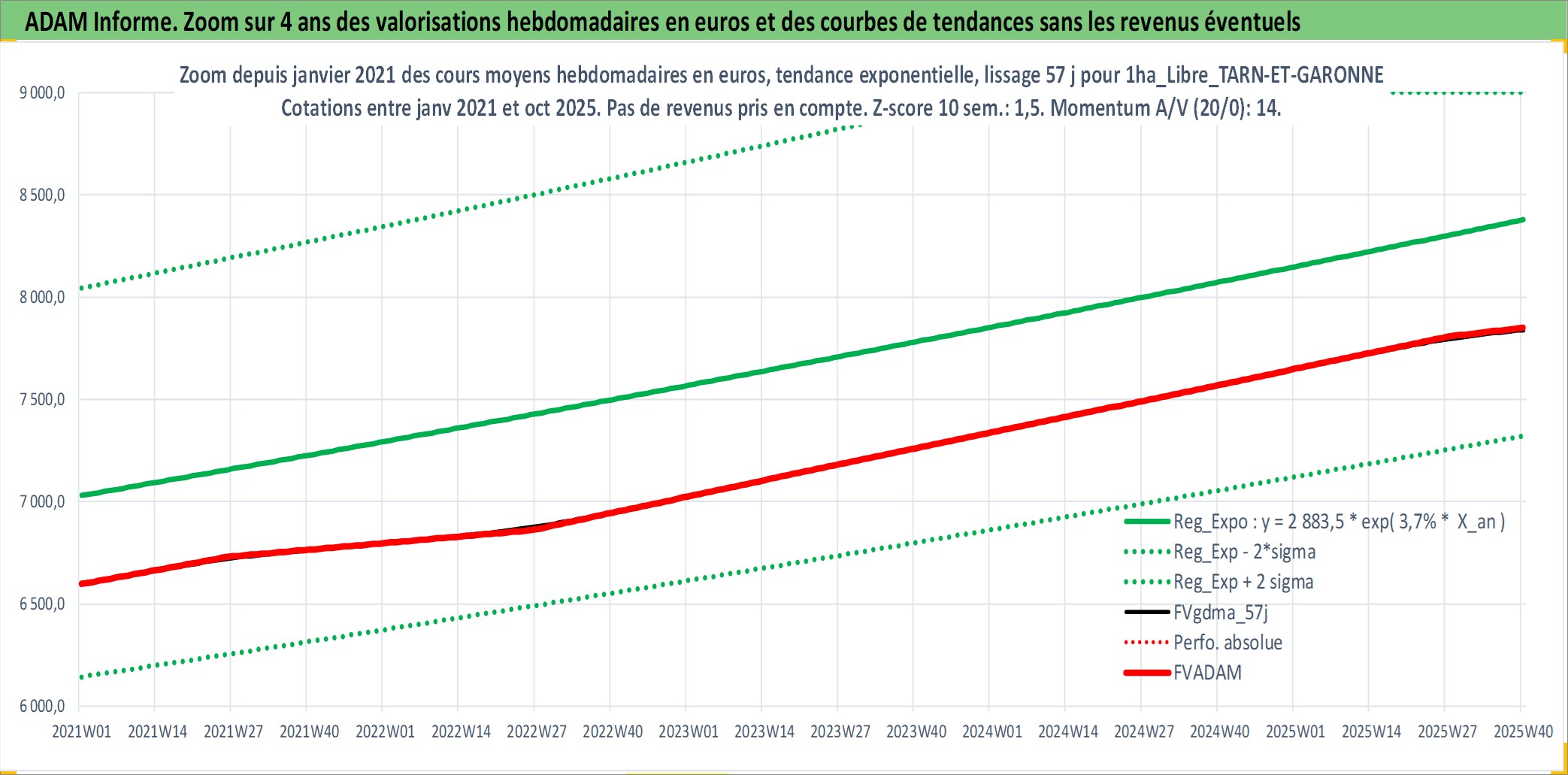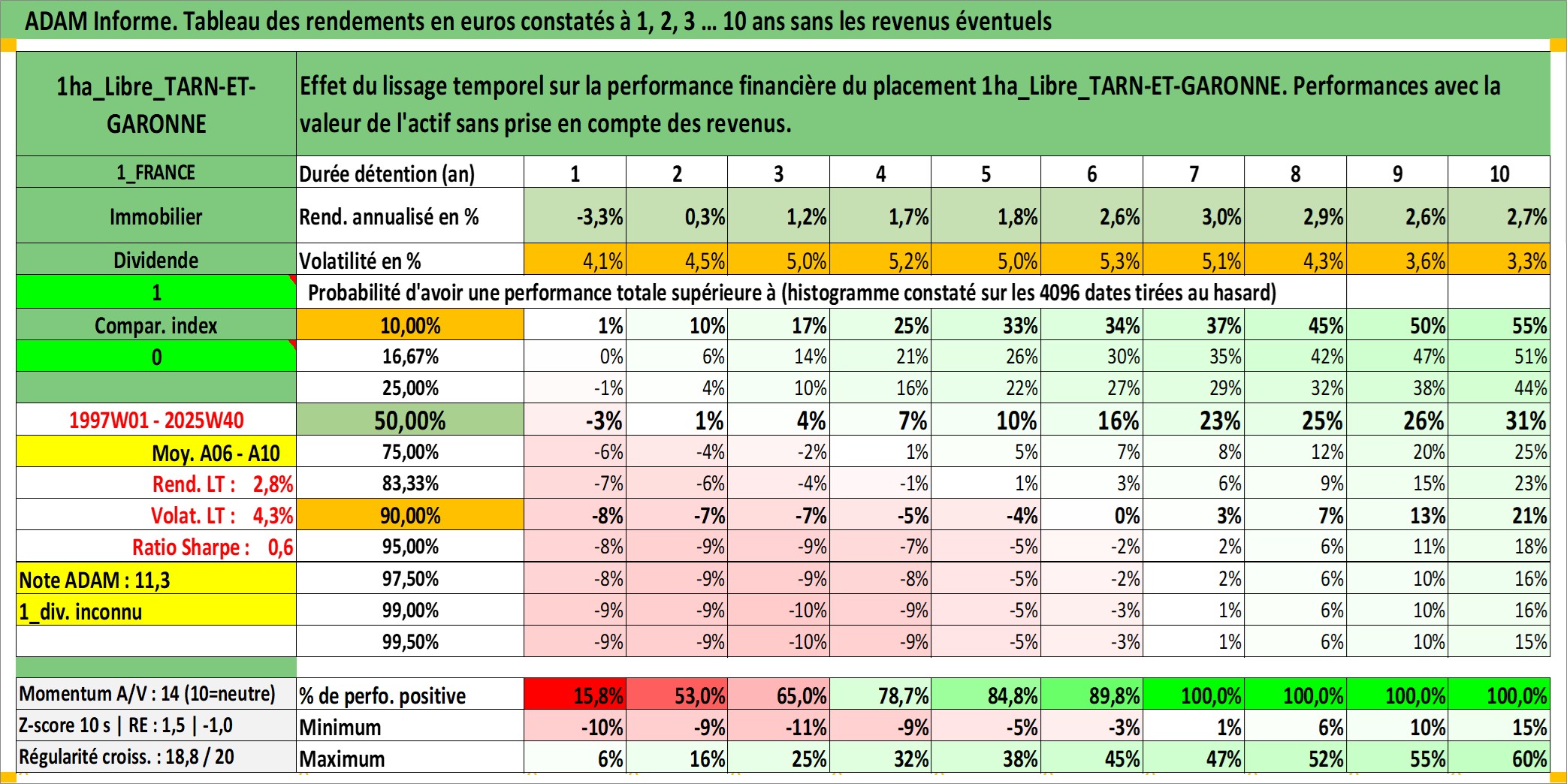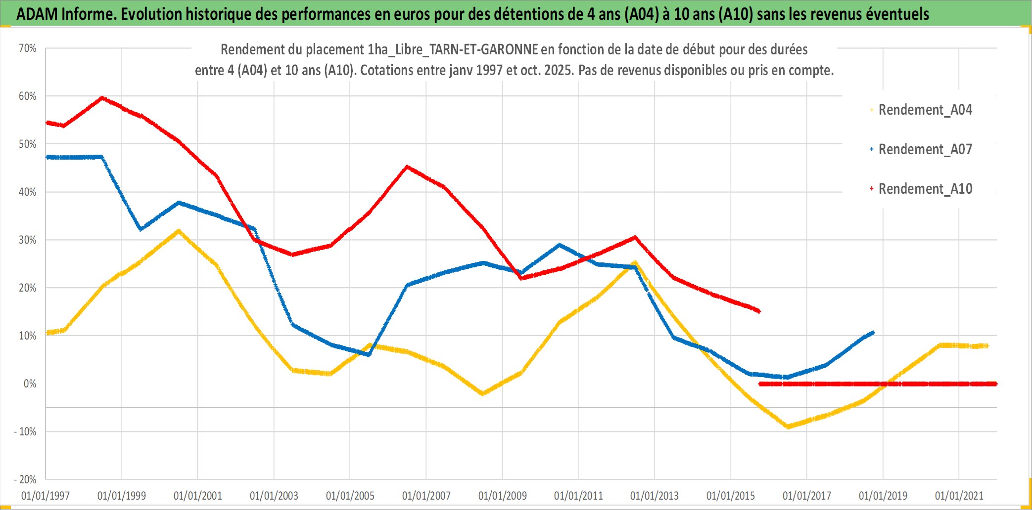 Site dédié aux investisseursPage dédiée sur site financeAnalyse des valorisations hebdomadaires de l'actif 1ha_Libre_TARN-ET-GARONNE. Cet actif est cote en EUR. Les valorisations couvrent les semaines 1997W01 a 2025W40. Les fermages de ce bien foncier sont pris egaux a 2,5% annuels de la valeur venale du bien.
