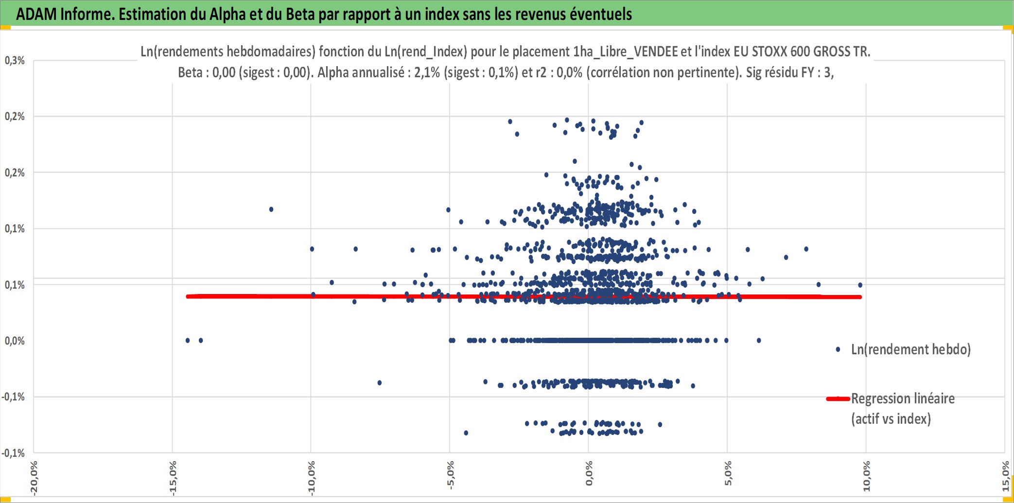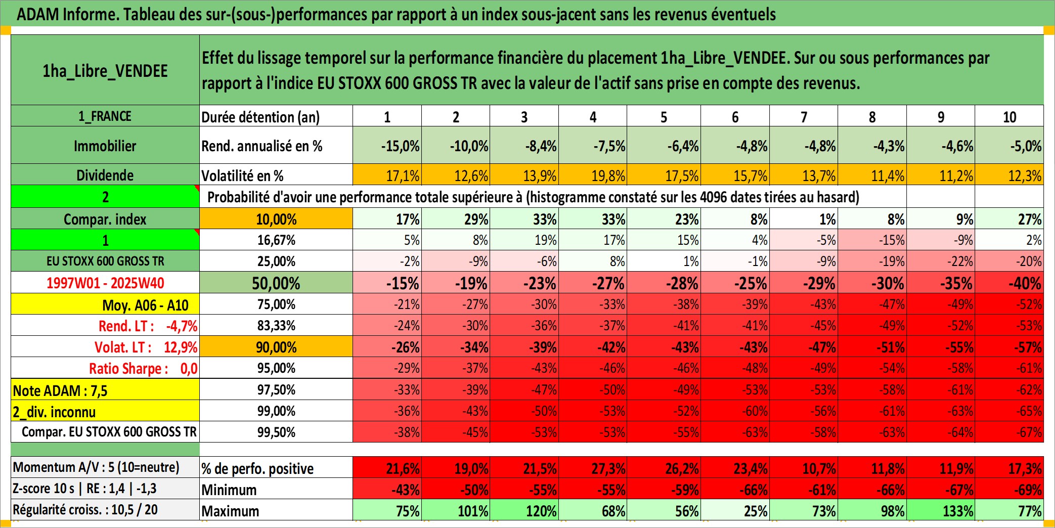 Site dédié aux investisseursPage dédiée sur site financeAnalyse des valorisations hebdomadaires de l'actif 1ha_Libre_VENDEE. Cet actif est cote en EUR. Les valorisations couvrent les semaines 1997W01 a 2025W40. Les fermages de ce bien foncier sont pris egaux a 2,5% annuels de la valeur venale du bien.