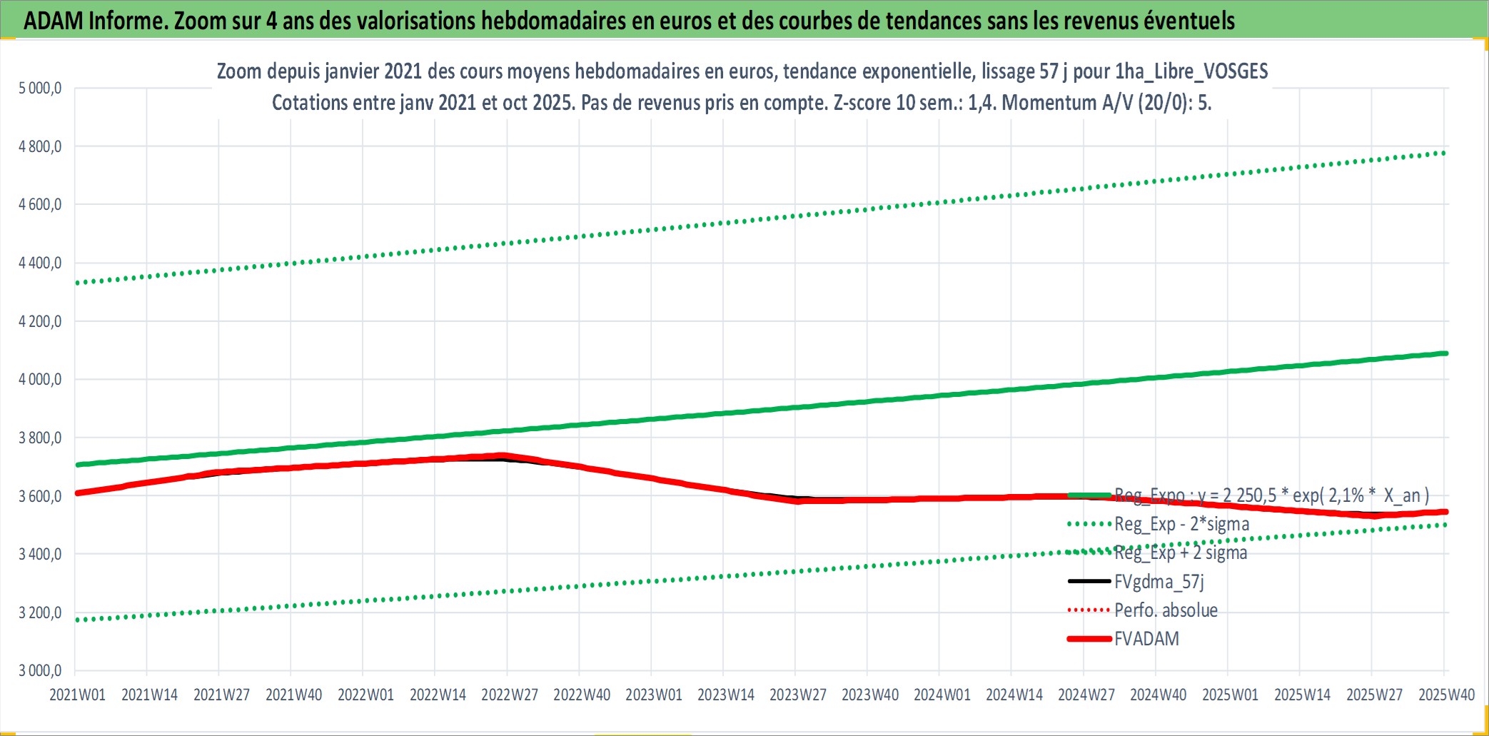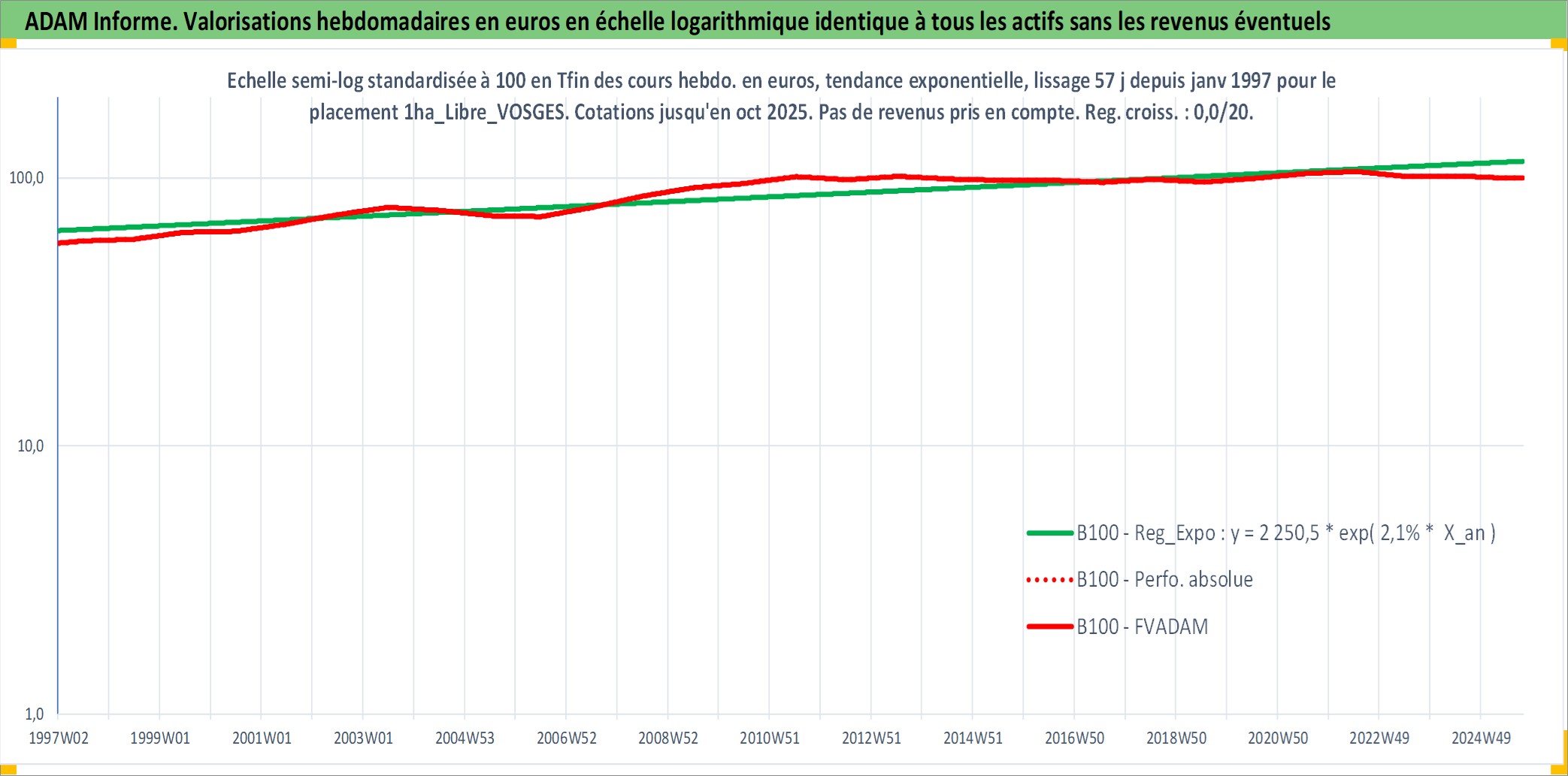 Site dédié aux investisseursPage dédiée sur site financeAnalyse des valorisations hebdomadaires de l'actif 1ha_Libre_VOSGES. Cet actif est cote en EUR. Les valorisations couvrent les semaines 1997W01 a 2025W40. Les fermages de ce bien foncier sont pris egaux a 2,5% annuels de la valeur venale du bien.