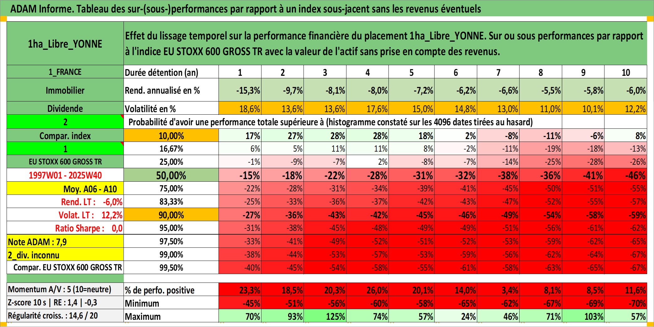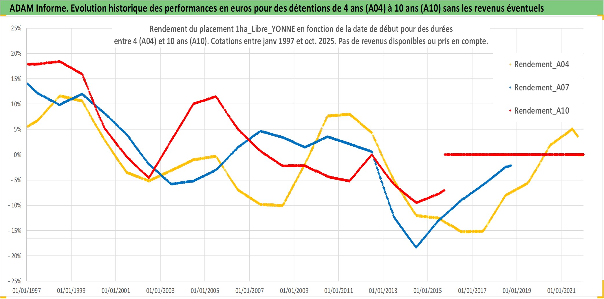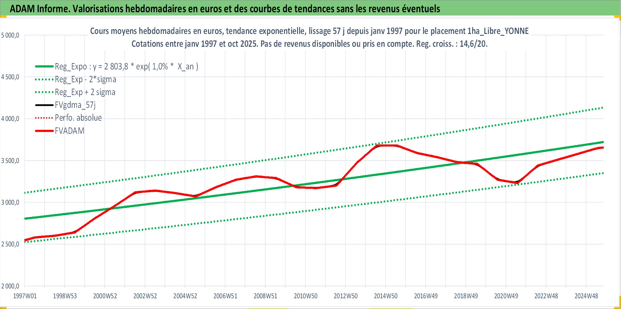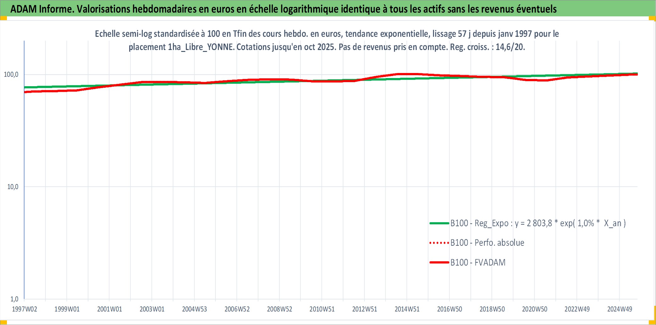 Site dédié aux investisseursPage dédiée sur site financeAnalyse des valorisations hebdomadaires de l'actif 1ha_Libre_YONNE. Cet actif est cote en EUR. Les valorisations couvrent les semaines 1997W01 a 2025W40. Les fermages de ce bien foncier sont pris egaux a 2,5% annuels de la valeur venale du bien.