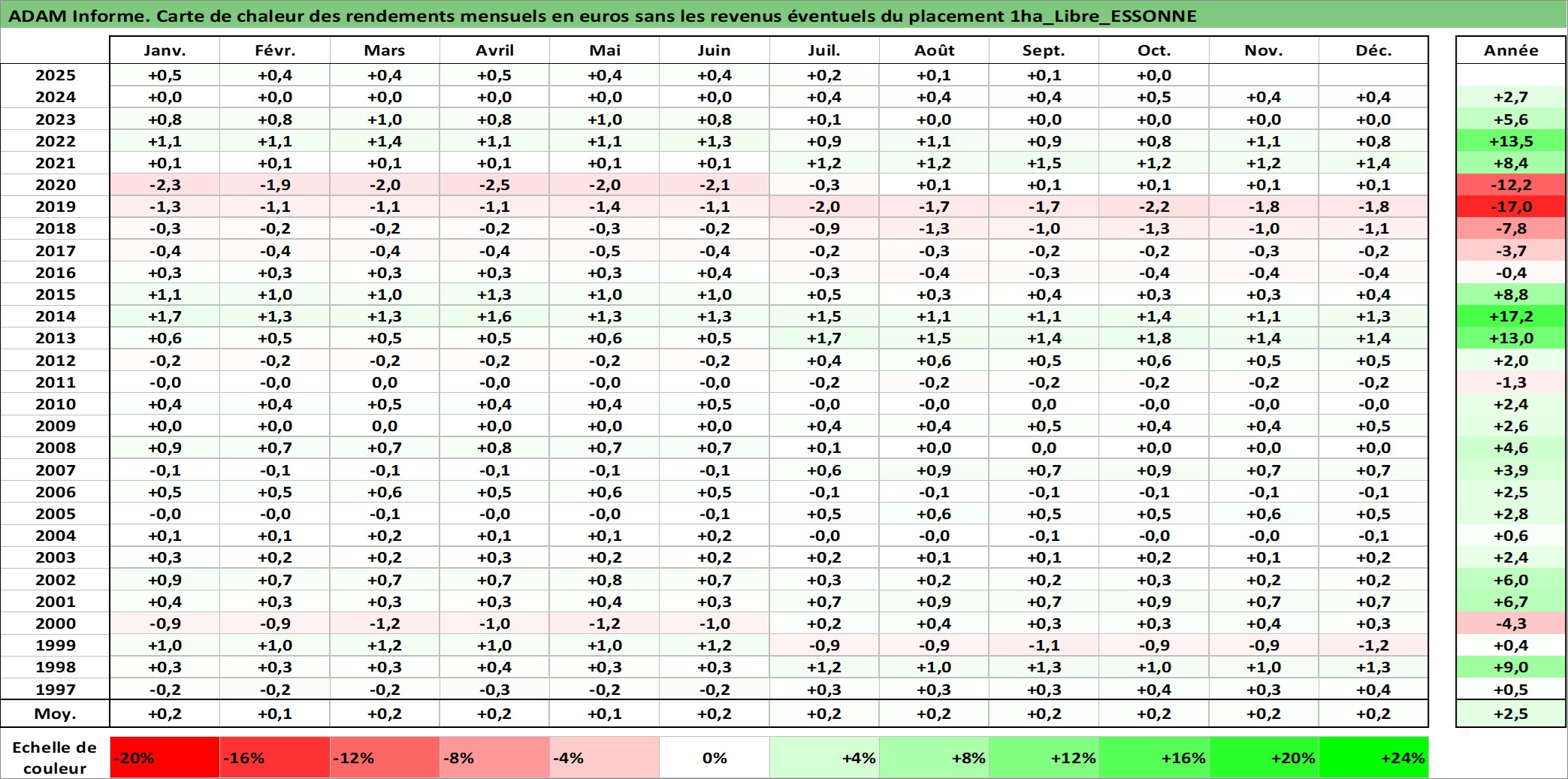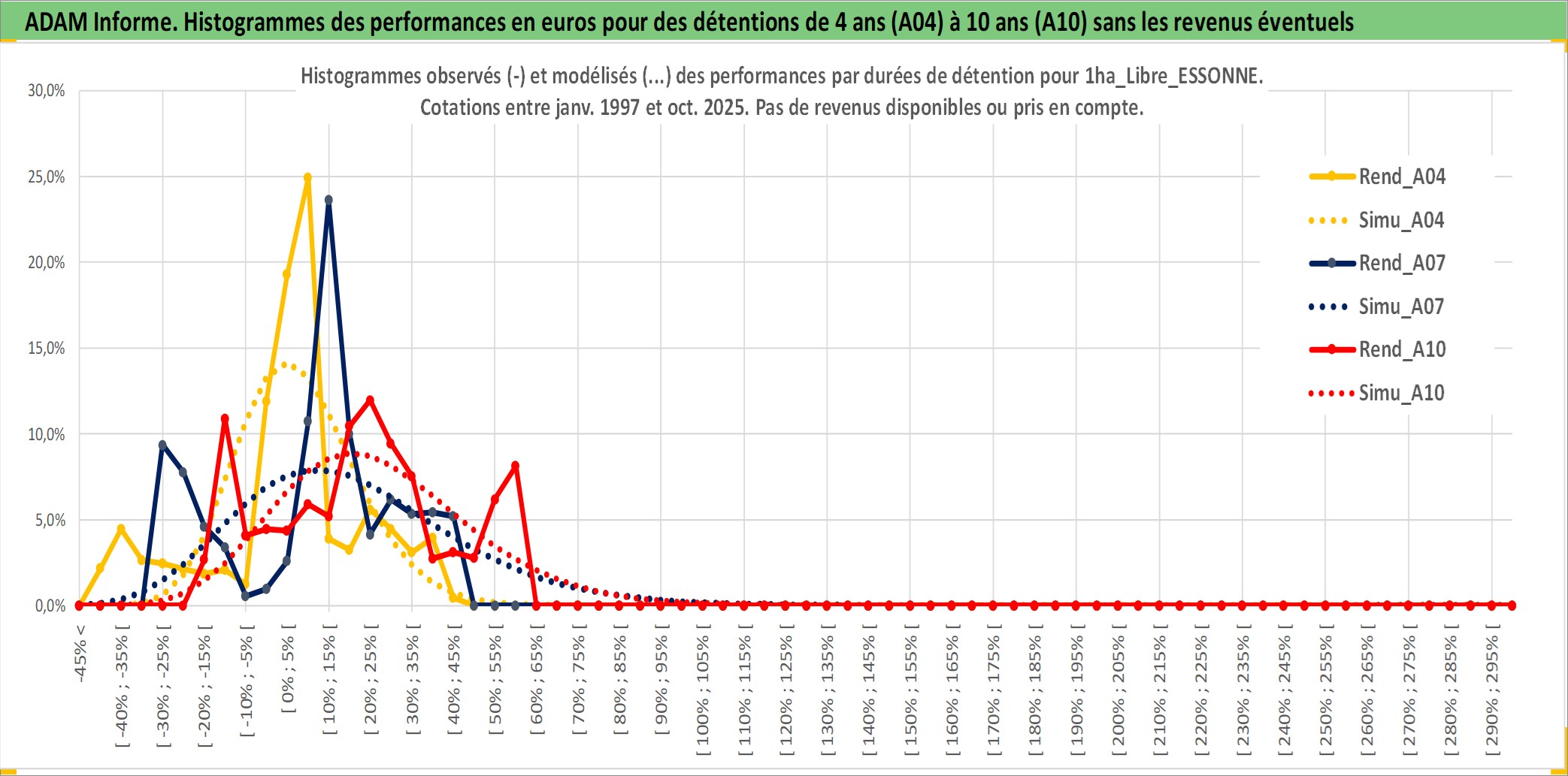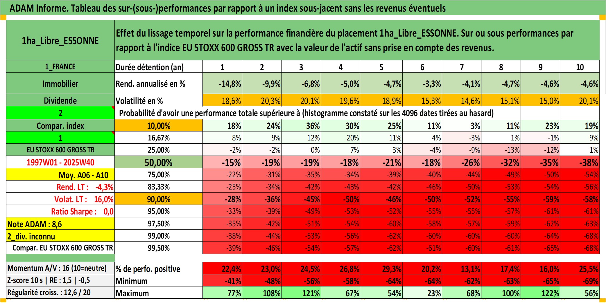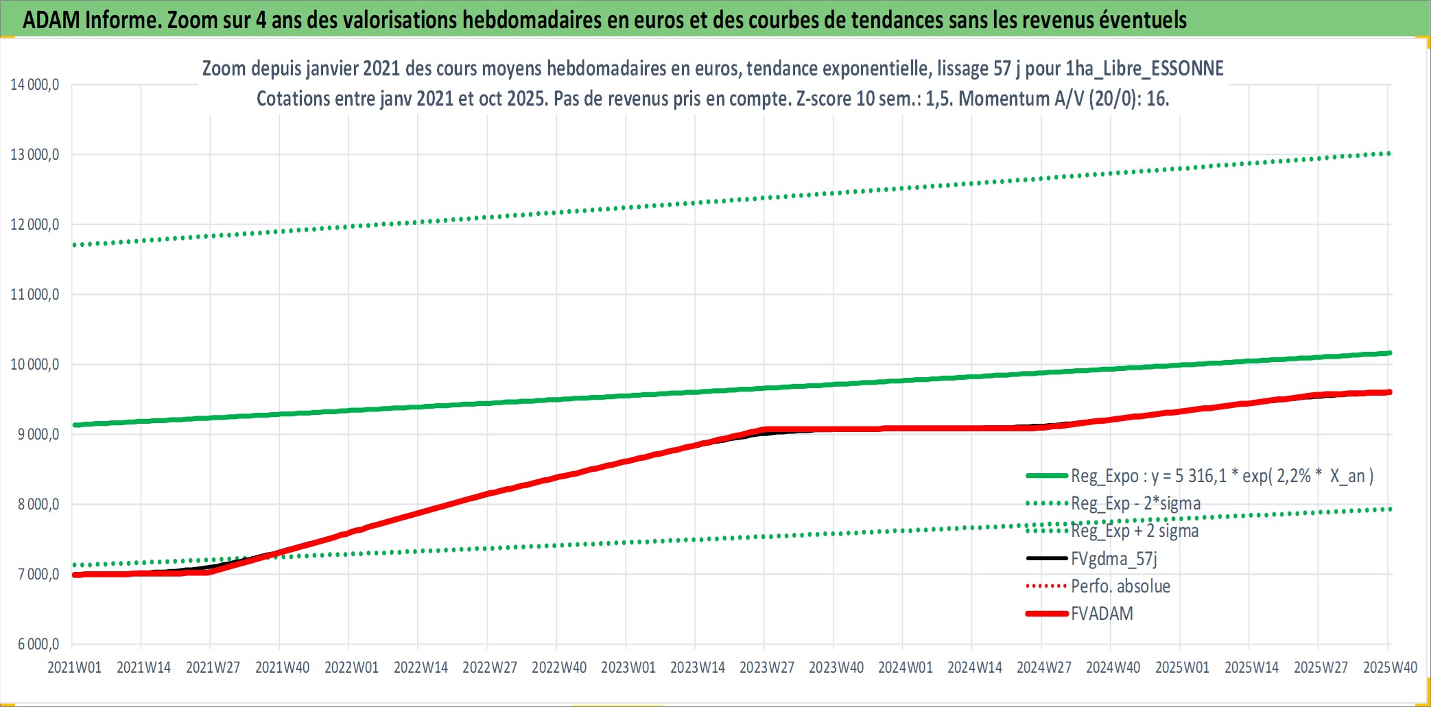 Site dédié aux investisseursPage dédiée sur site financeAnalyse des valorisations hebdomadaires de l'actif 1ha_Libre_ESSONNE. Cet actif est cote en EUR. Les valorisations couvrent les semaines 1997W01 a 2025W40. Les fermages de ce bien foncier sont pris egaux a 2,5% annuels de la valeur venale du bien.