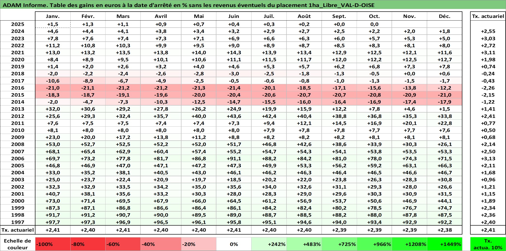 Site dédié aux investisseursPage dédiée sur site financeAnalyse des valorisations hebdomadaires de l'actif 1ha_Libre_VAL-D-OISE. Cet actif est cote en EUR. Les valorisations couvrent les semaines 1997W01 a 2025W40. Les fermages de ce bien foncier sont pris egaux a 2,5% annuels de la valeur venale du bien.