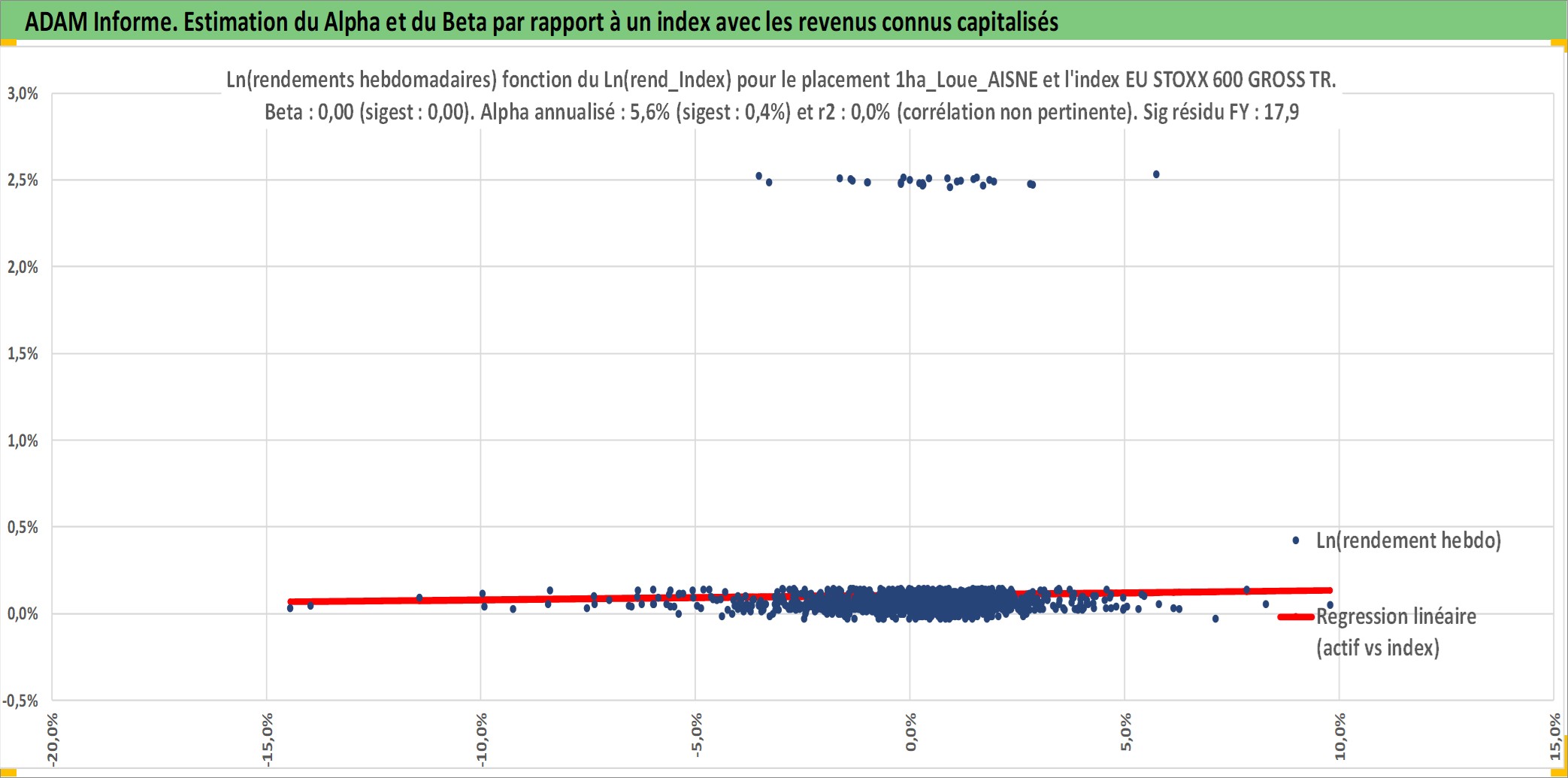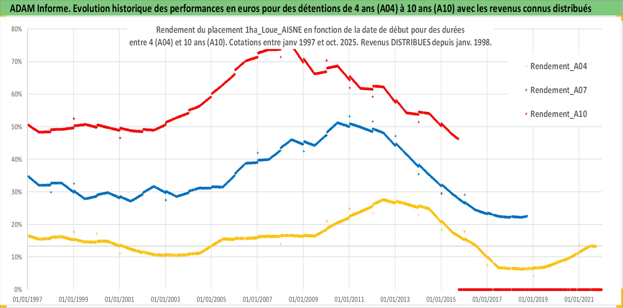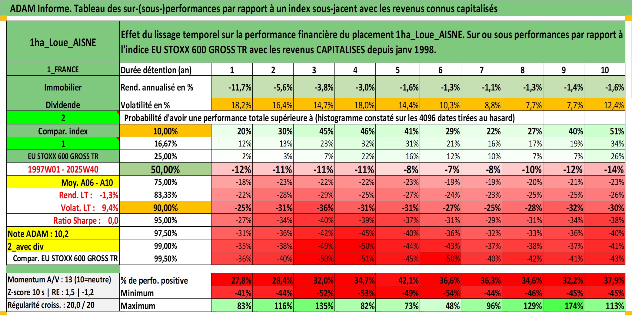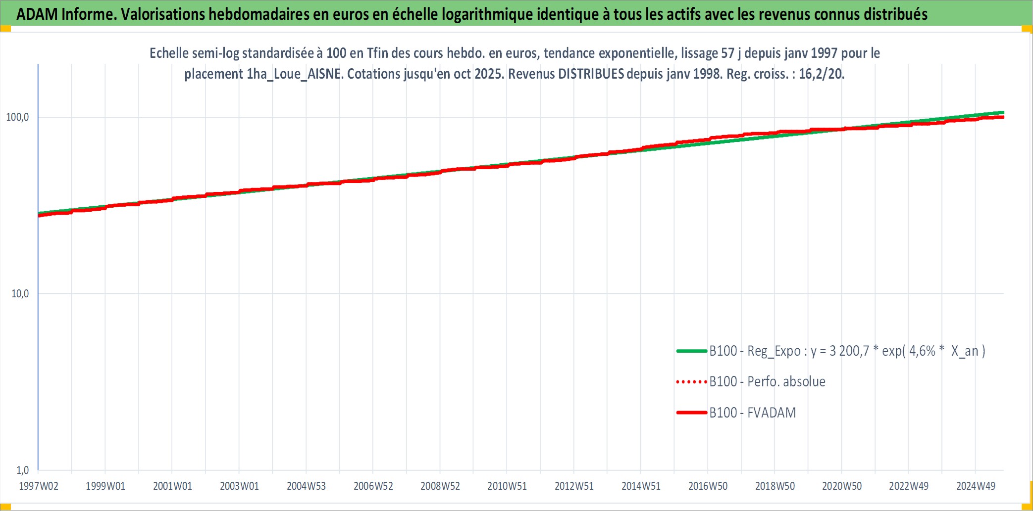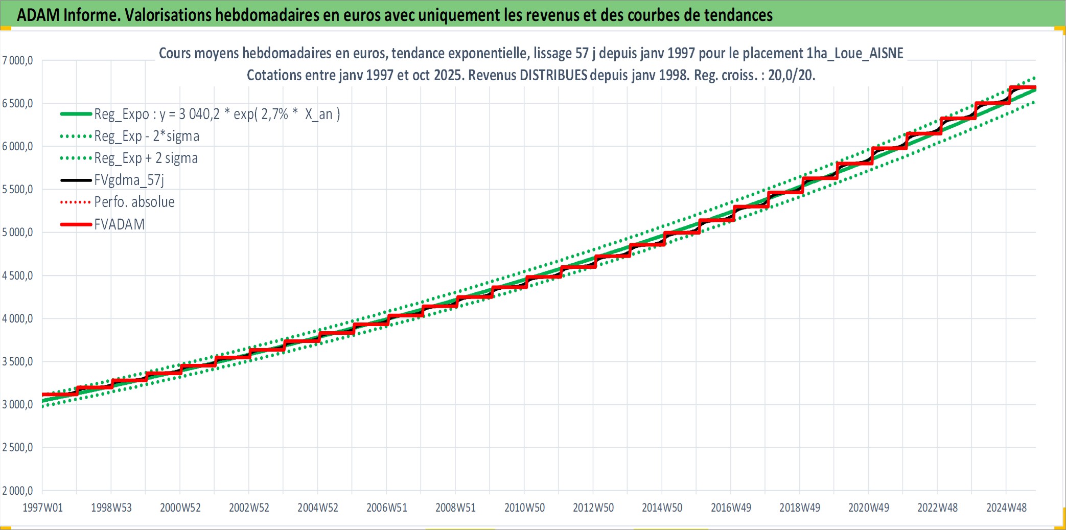 Site dédié aux investisseursPage dédiée sur site financeAnalyse des valorisations hebdomadaires de l'actif 1ha_Loue_AISNE. Cet actif est cote en EUR. Les valorisations couvrent les semaines 1997W01 a 2025W40. Les fermages de ce bien foncier sont pris egaux a 2,5% annuels de la valeur venale du bien.