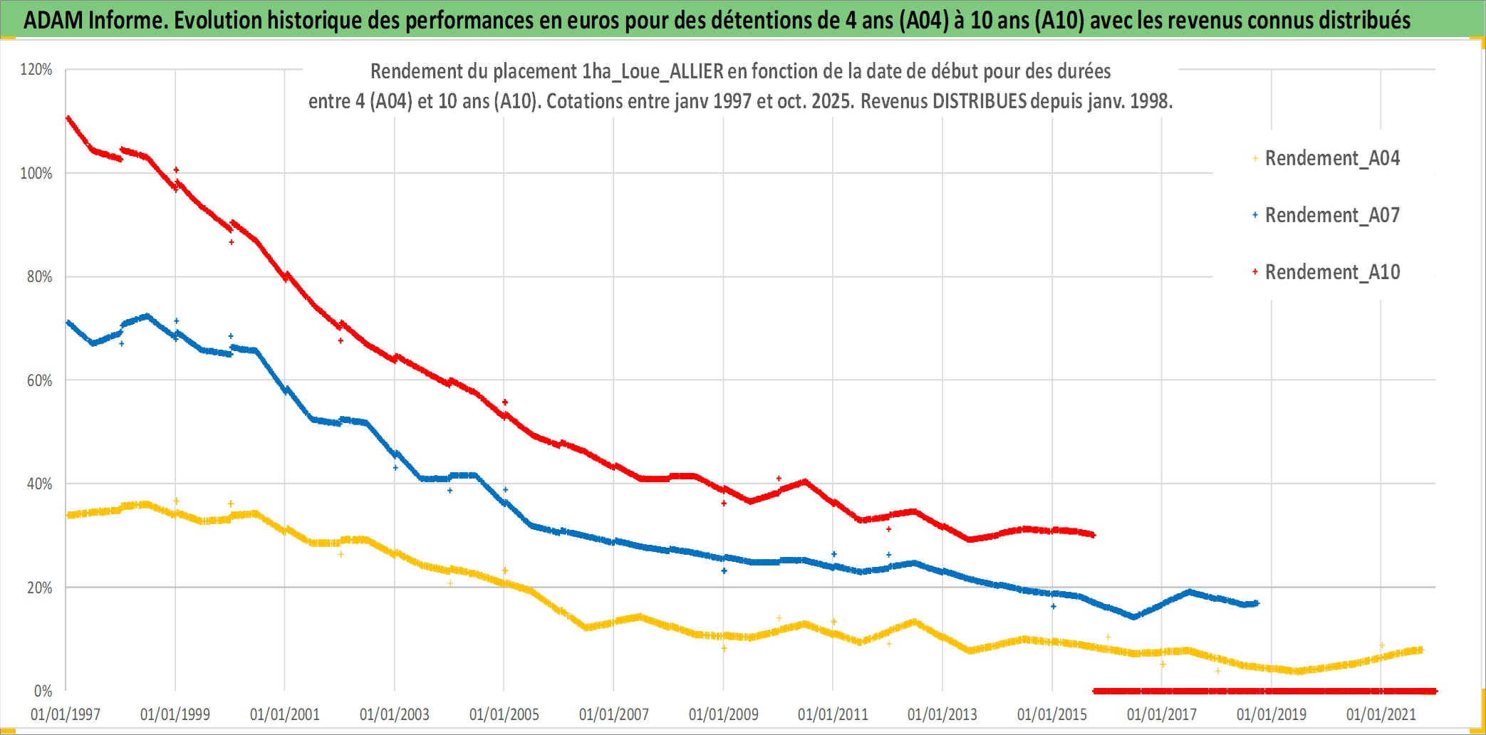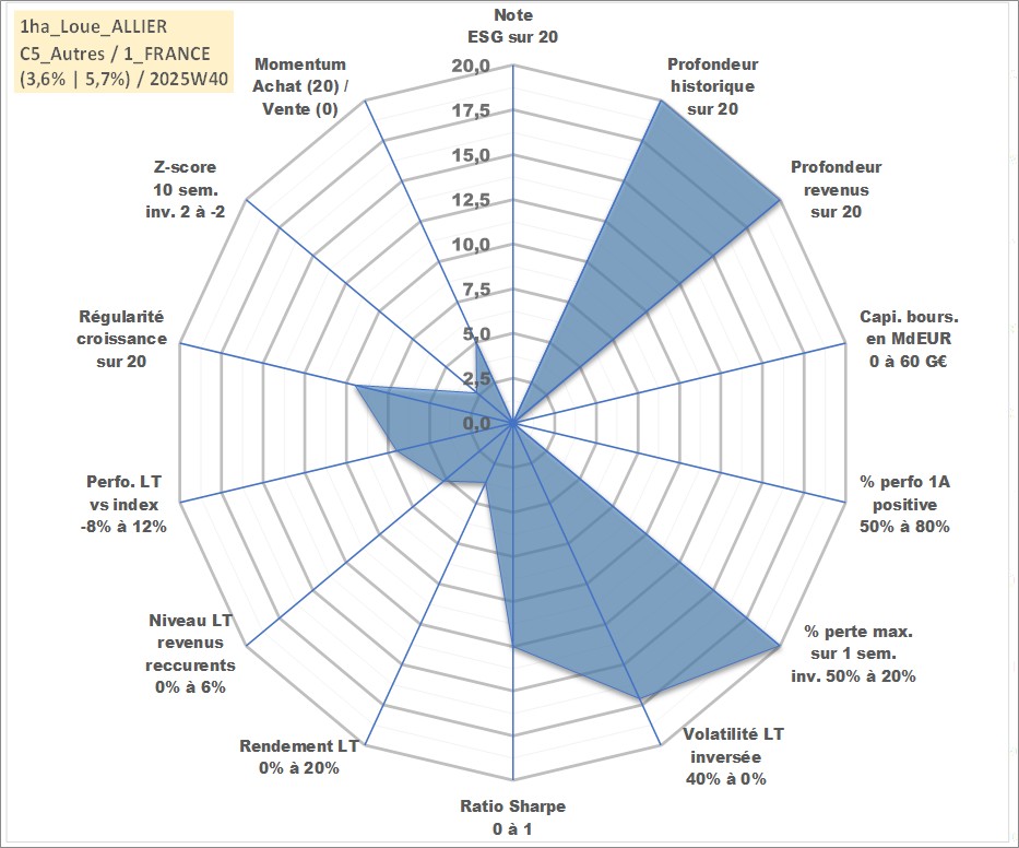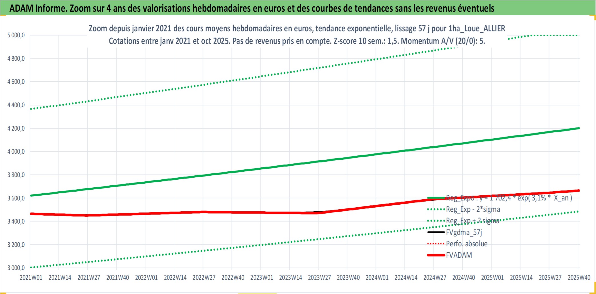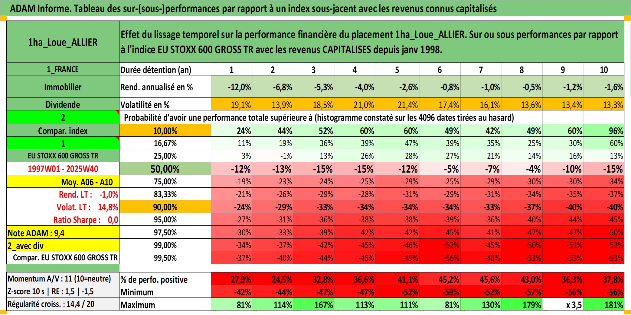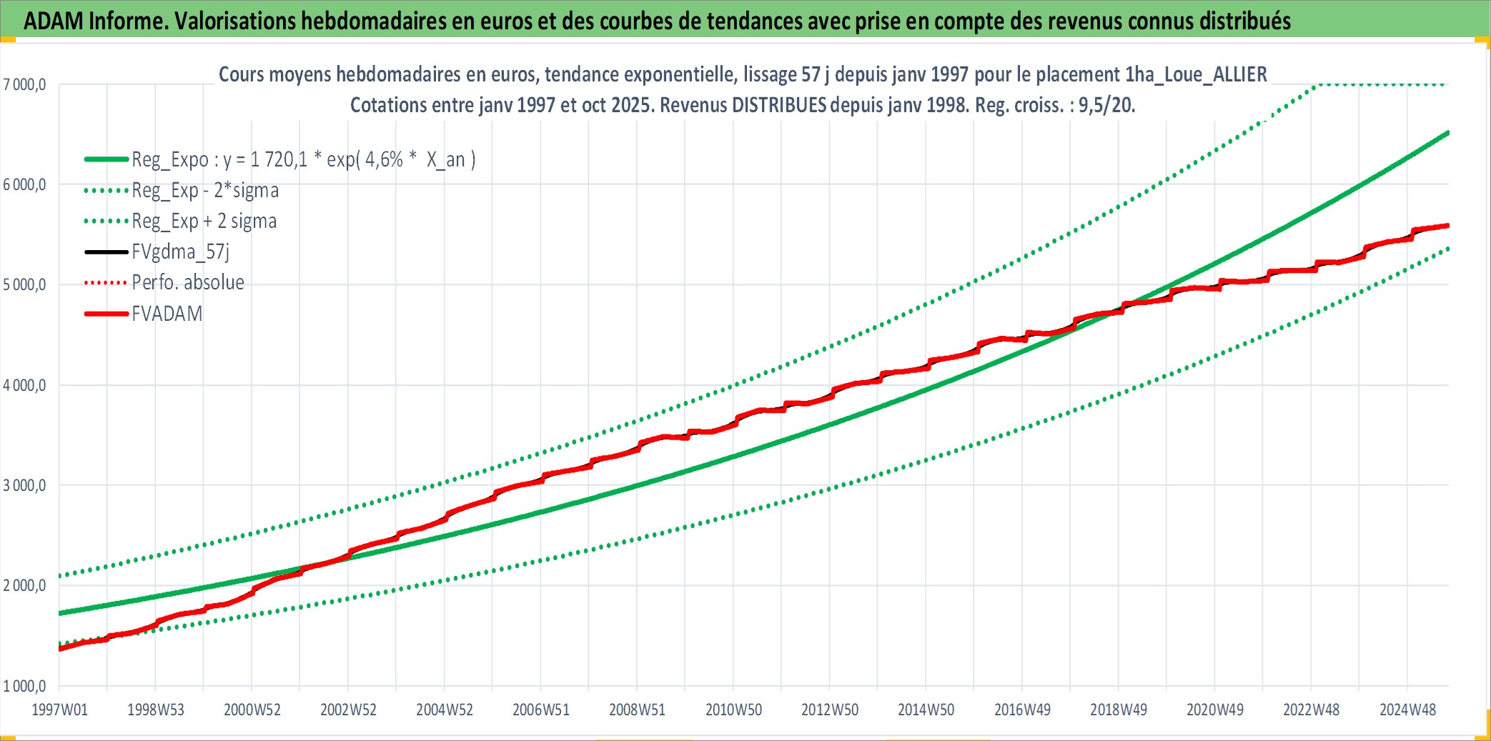 Site dédié aux investisseursPage dédiée sur site financeAnalyse des valorisations hebdomadaires de l'actif 1ha_Loue_ALLIER. Cet actif est cote en EUR. Les valorisations couvrent les semaines 1997W01 a 2025W40. Les fermages de ce bien foncier sont pris egaux a 2,5% annuels de la valeur venale du bien.