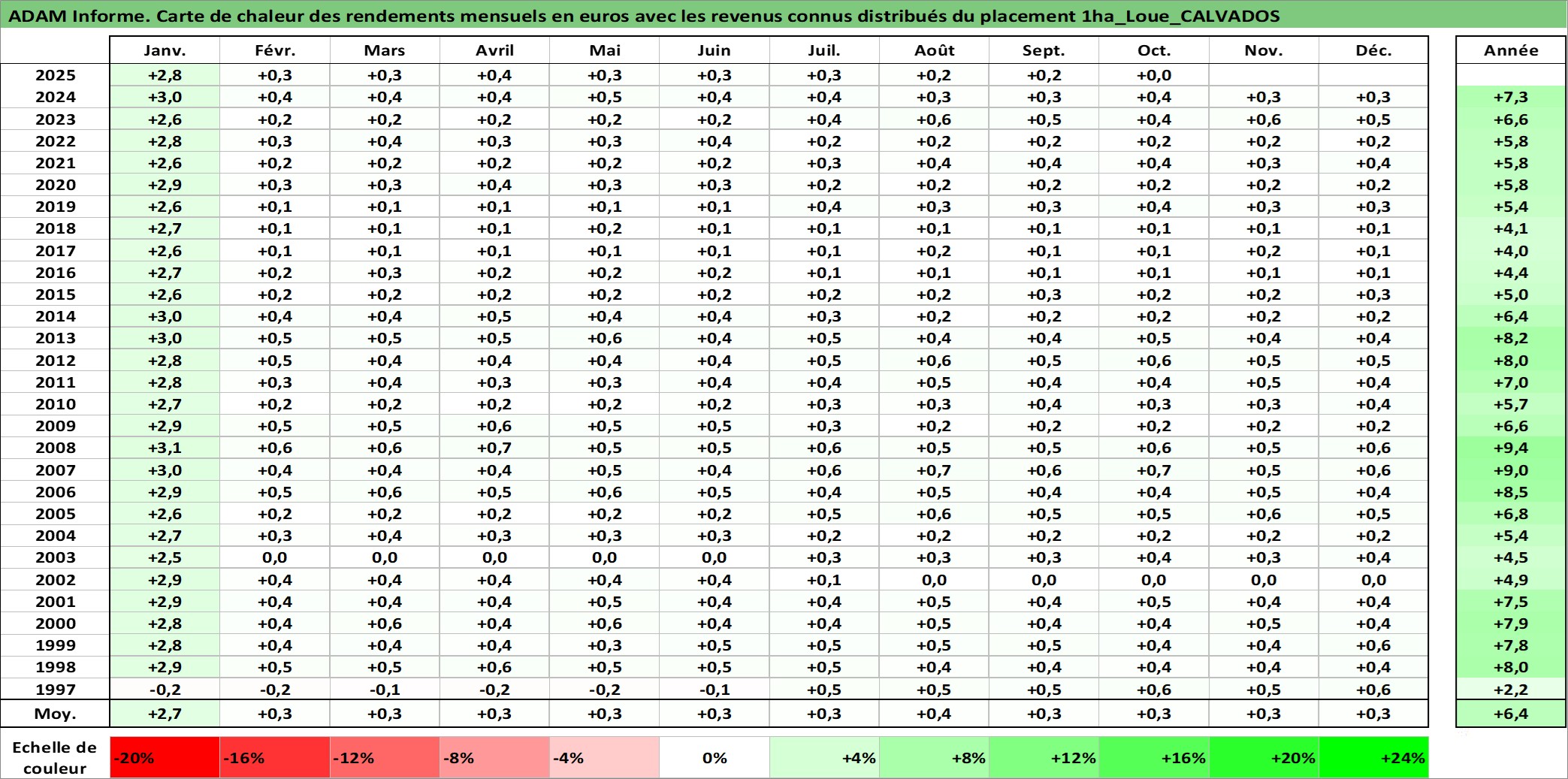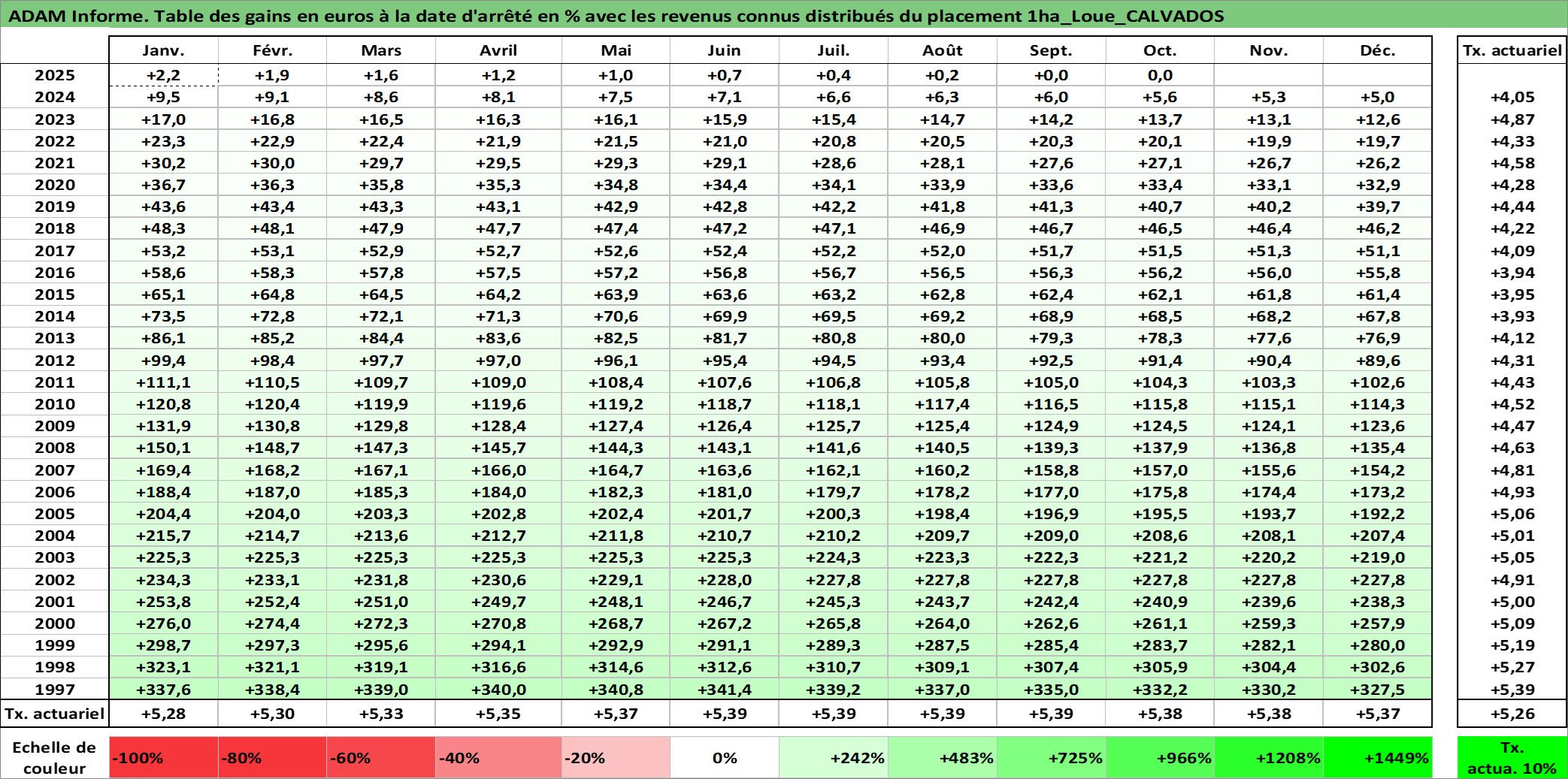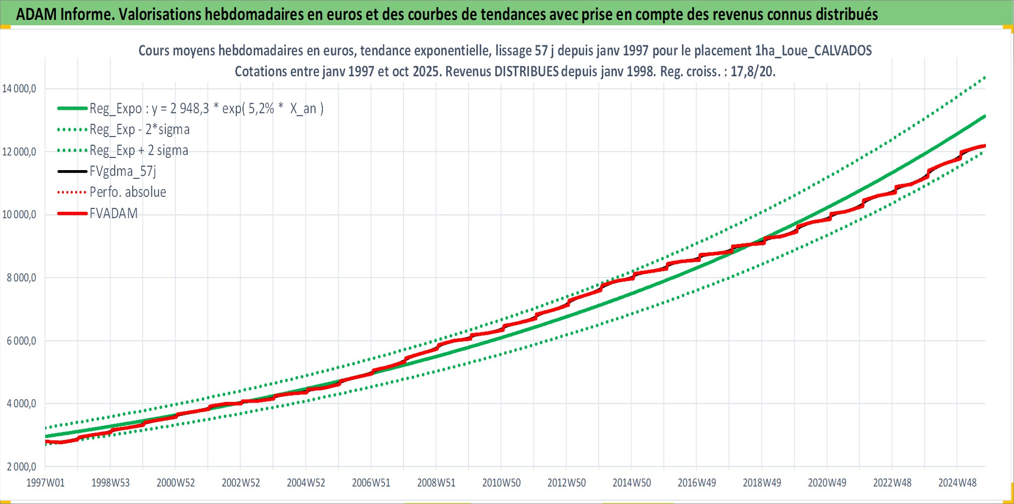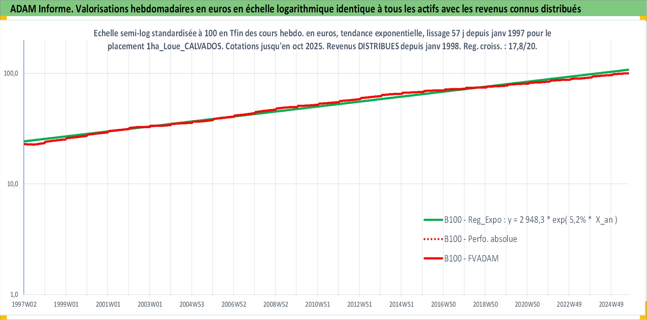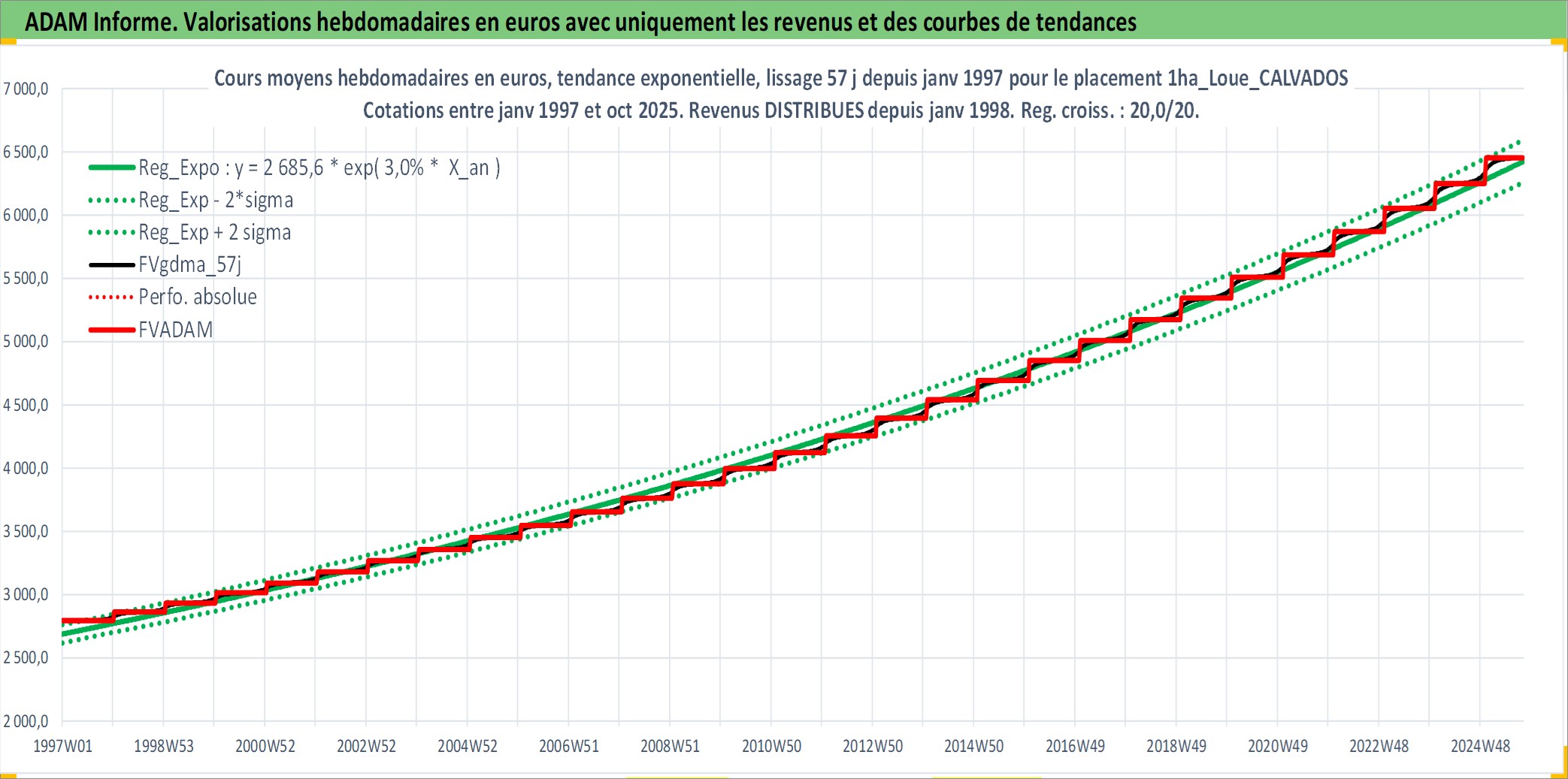 Site dédié aux investisseursPage dédiée sur site financeAnalyse des valorisations hebdomadaires de l'actif 1ha_Loue_CALVADOS. Cet actif est cote en EUR. Les valorisations couvrent les semaines 1997W01 a 2025W40. Les fermages de ce bien foncier sont pris egaux a 2,5% annuels de la valeur venale du bien.