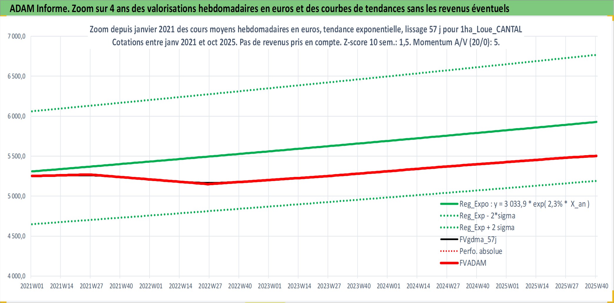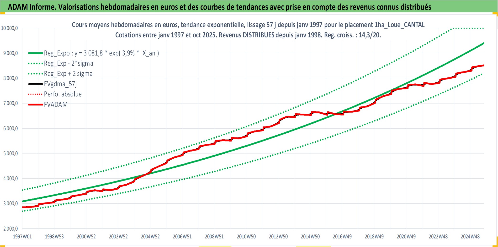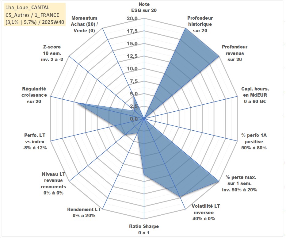 Site dédié aux investisseursPage dédiée sur site financeAnalyse des valorisations hebdomadaires de l'actif 1ha_Loue_CANTAL. Cet actif est cote en EUR. Les valorisations couvrent les semaines 1997W01 a 2025W40. Les fermages de ce bien foncier sont pris egaux a 2,5% annuels de la valeur venale du bien.