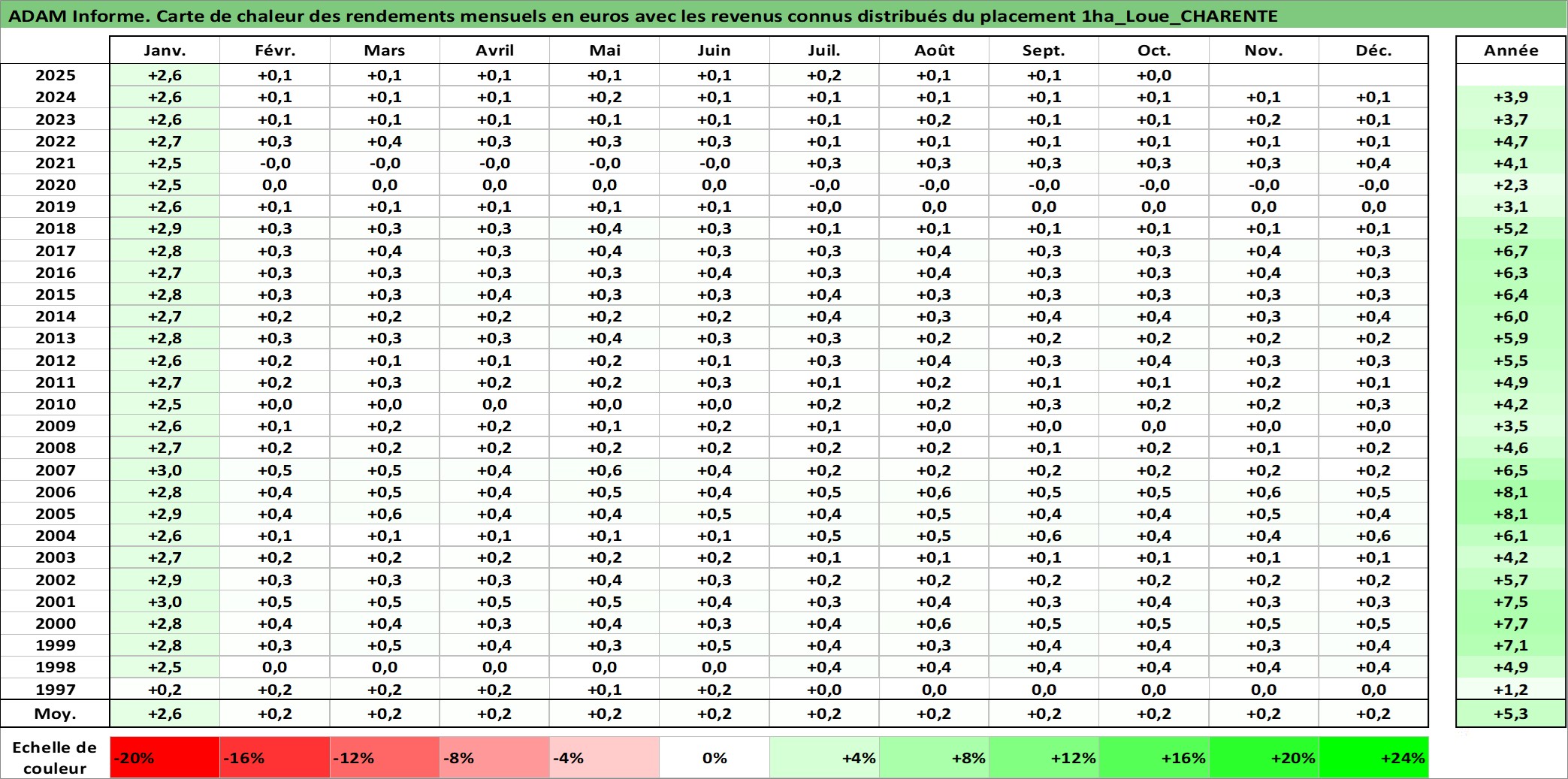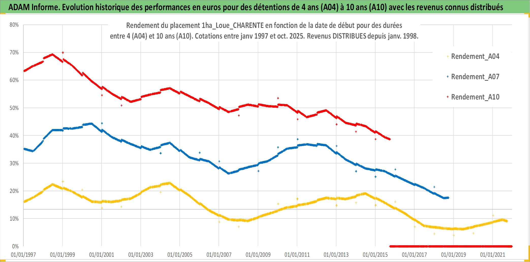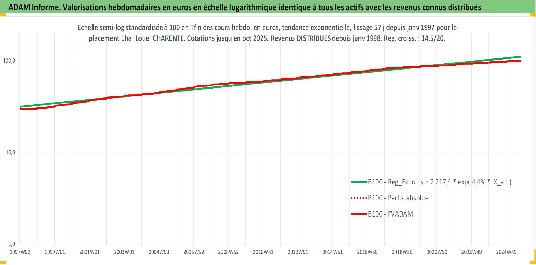 Site dédié aux investisseursPage dédiée sur site financeAnalyse des valorisations hebdomadaires de l'actif 1ha_Loue_CHARENTE. Cet actif est cote en EUR. Les valorisations couvrent les semaines 1997W01 a 2025W40. Les fermages de ce bien foncier sont pris egaux a 2,5% annuels de la valeur venale du bien.
