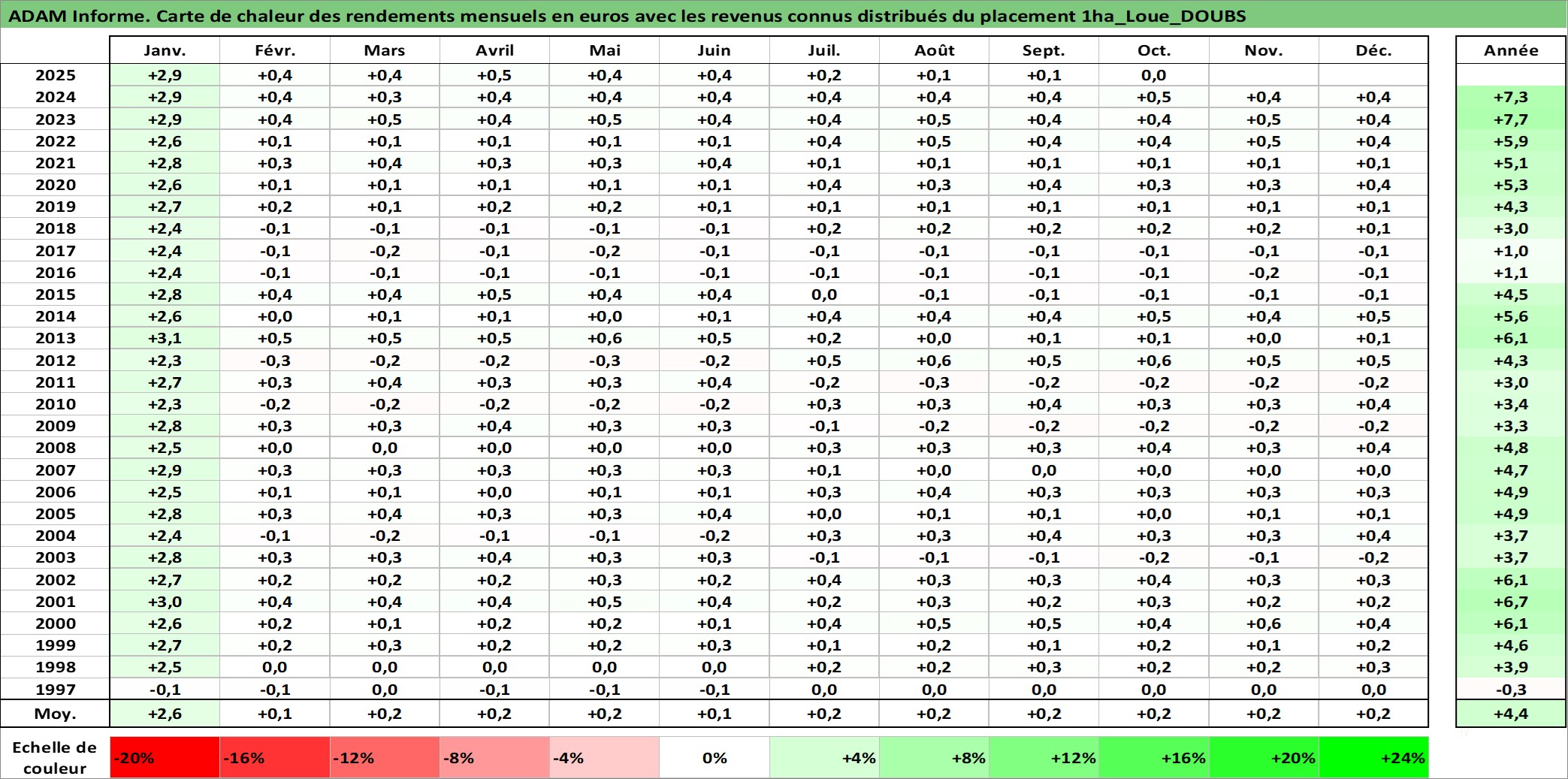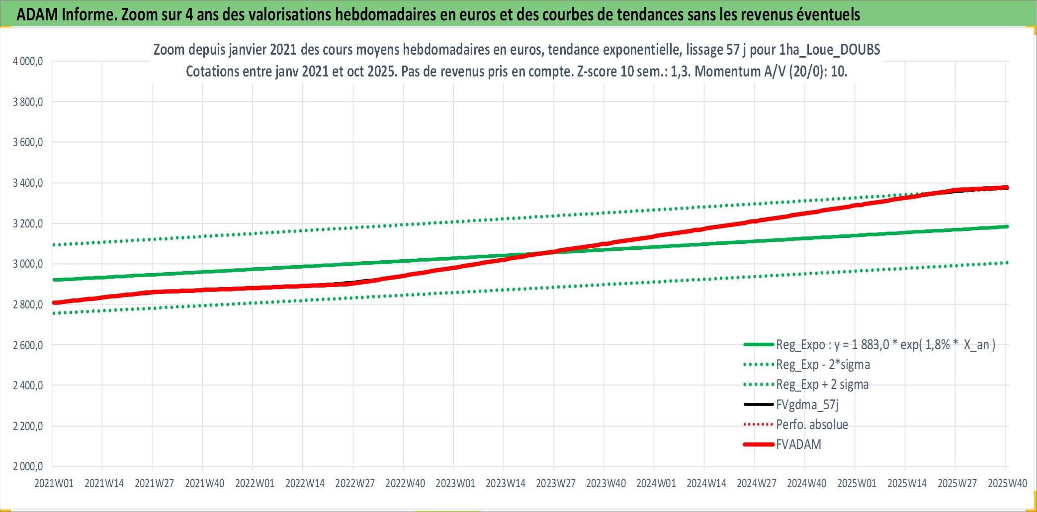 Site dédié aux investisseursPage dédiée sur site financeAnalyse des valorisations hebdomadaires de l'actif 1ha_Loue_DOUBS. Cet actif est cote en EUR. Les valorisations couvrent les semaines 1997W01 a 2025W40. Les fermages de ce bien foncier sont pris egaux a 2,5% annuels de la valeur venale du bien.