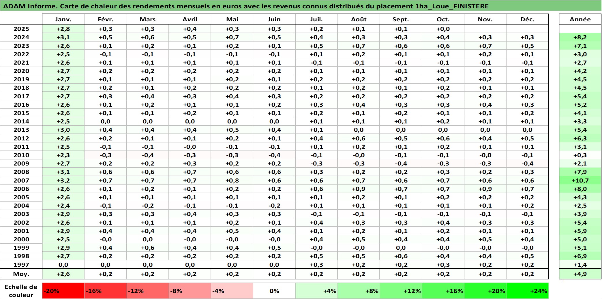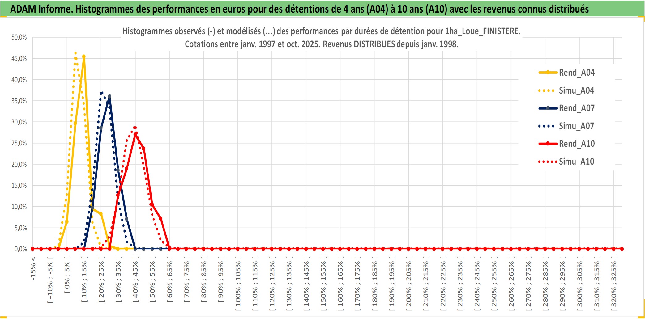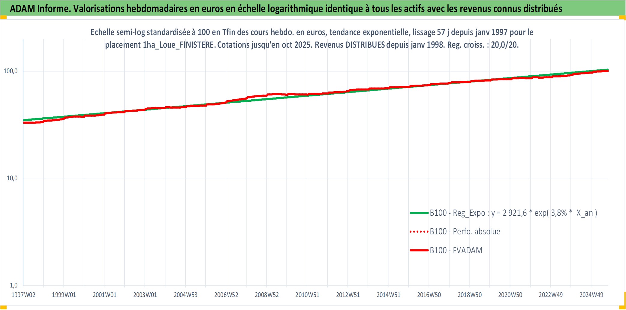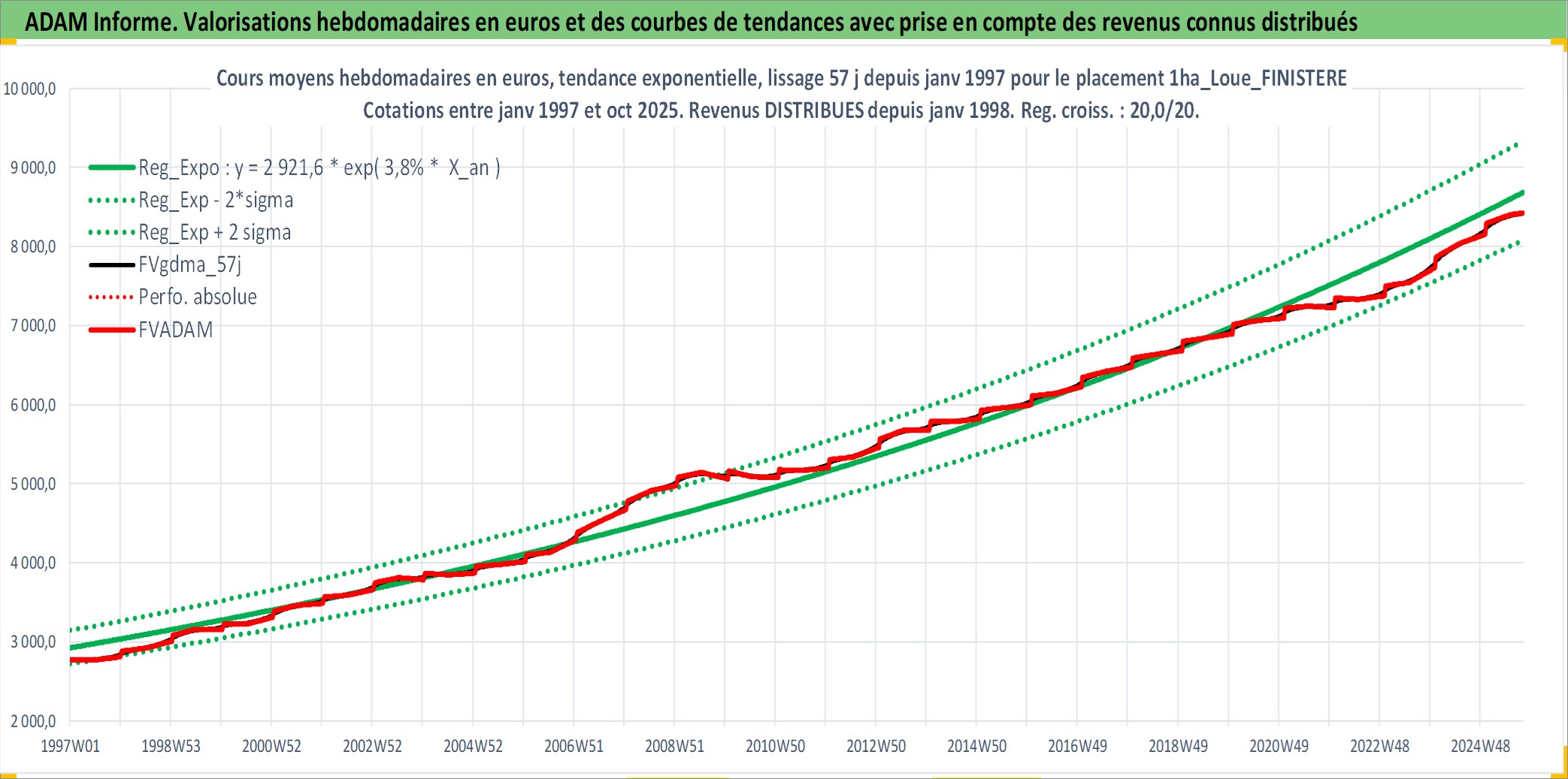 Site dédié aux investisseursPage dédiée sur site financeAnalyse des valorisations hebdomadaires de l'actif 1ha_Loue_FINISTERE. Cet actif est cote en EUR. Les valorisations couvrent les semaines 1997W01 a 2025W40. Les fermages de ce bien foncier sont pris egaux a 2,5% annuels de la valeur venale du bien.
